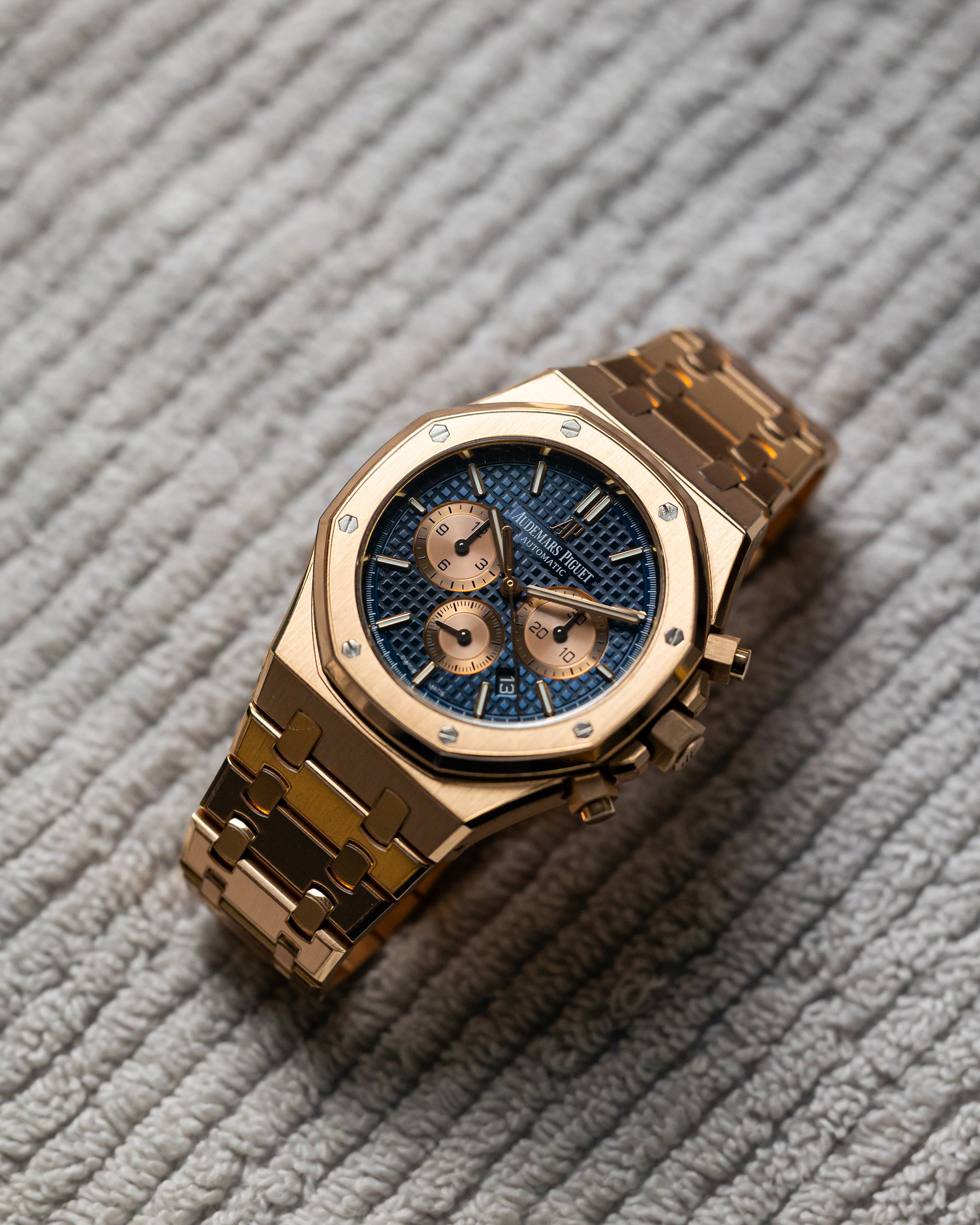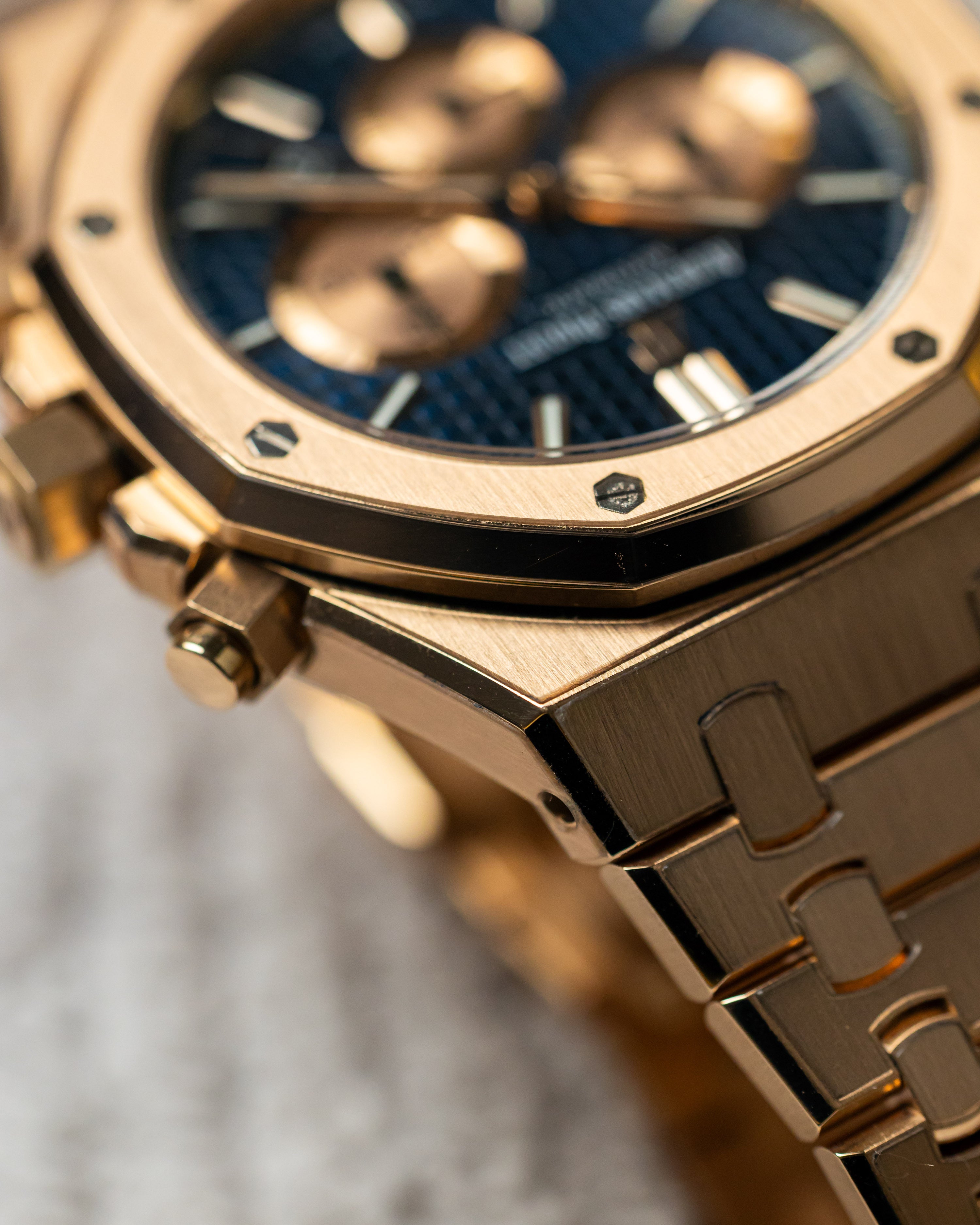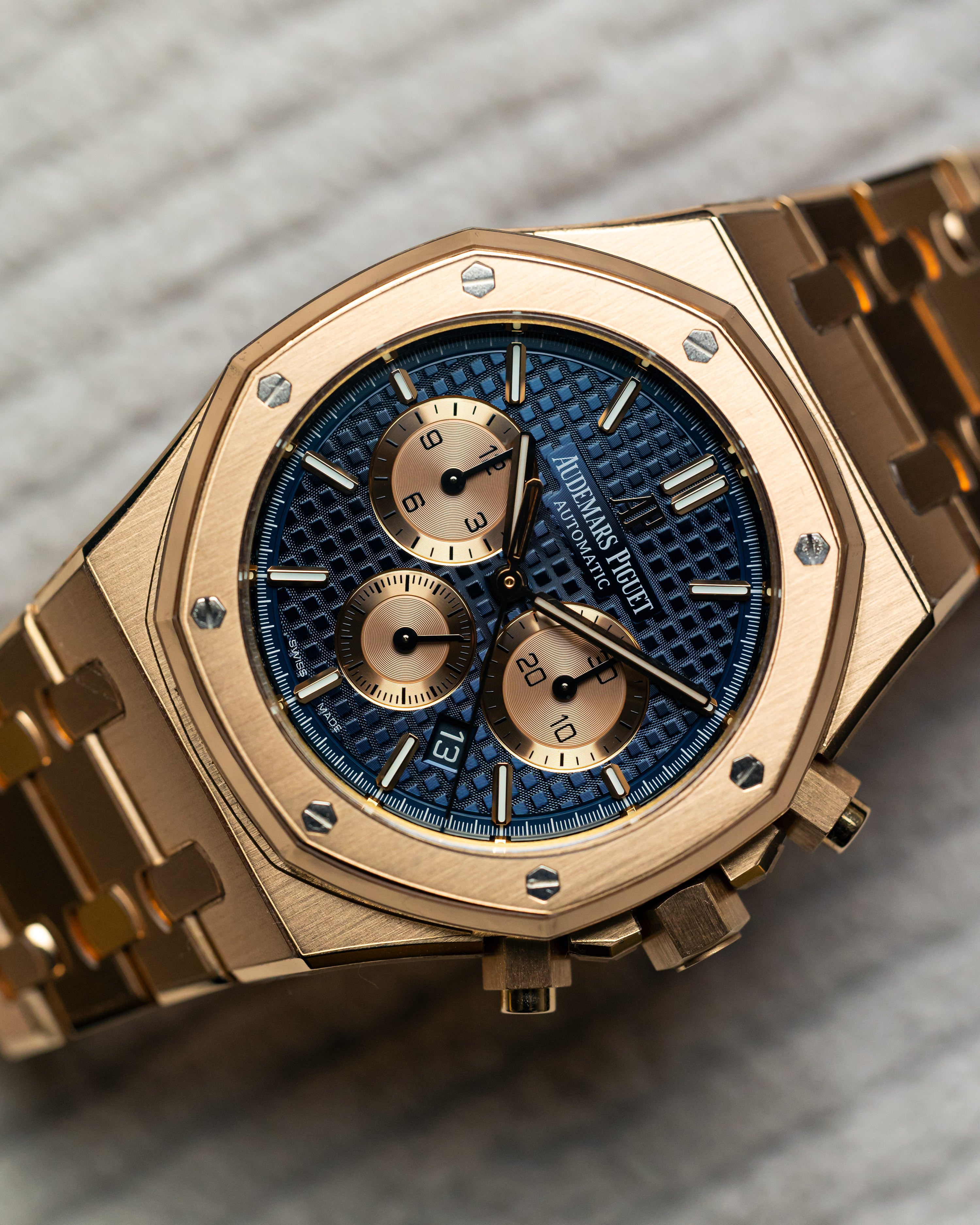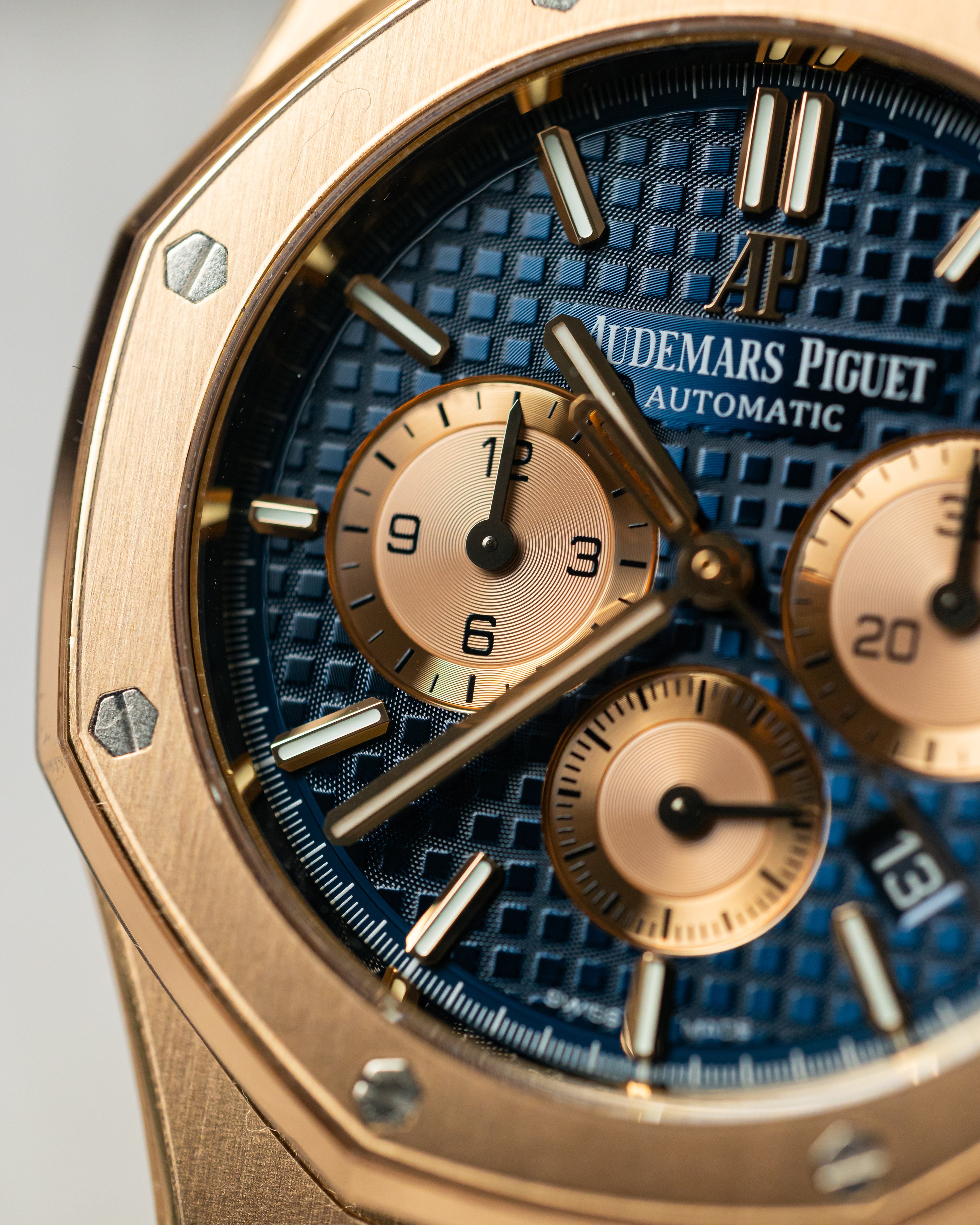 Rarely do we see the rose gold AP Chrono, let alone with the stunning Méga Tappiserie blue dial.