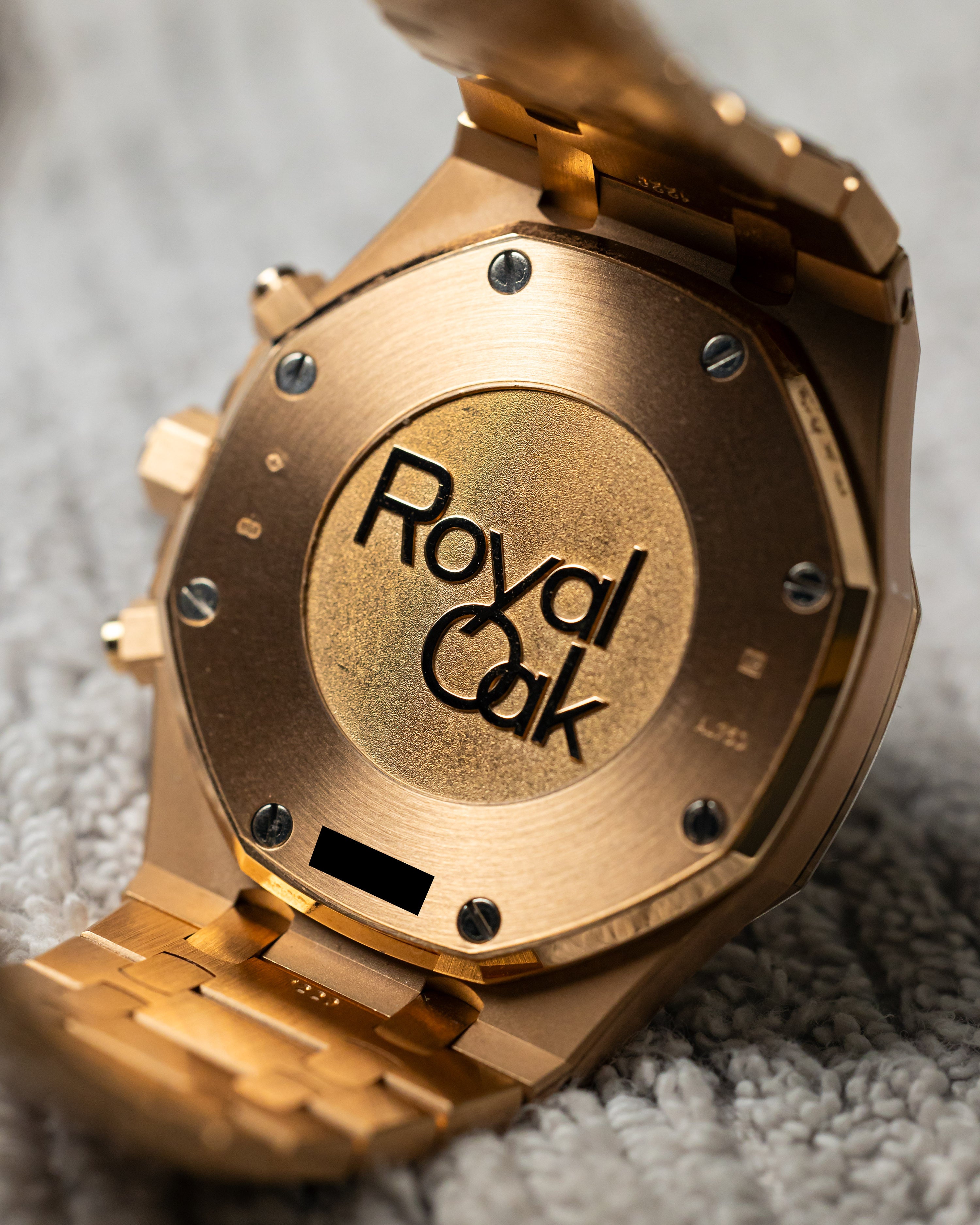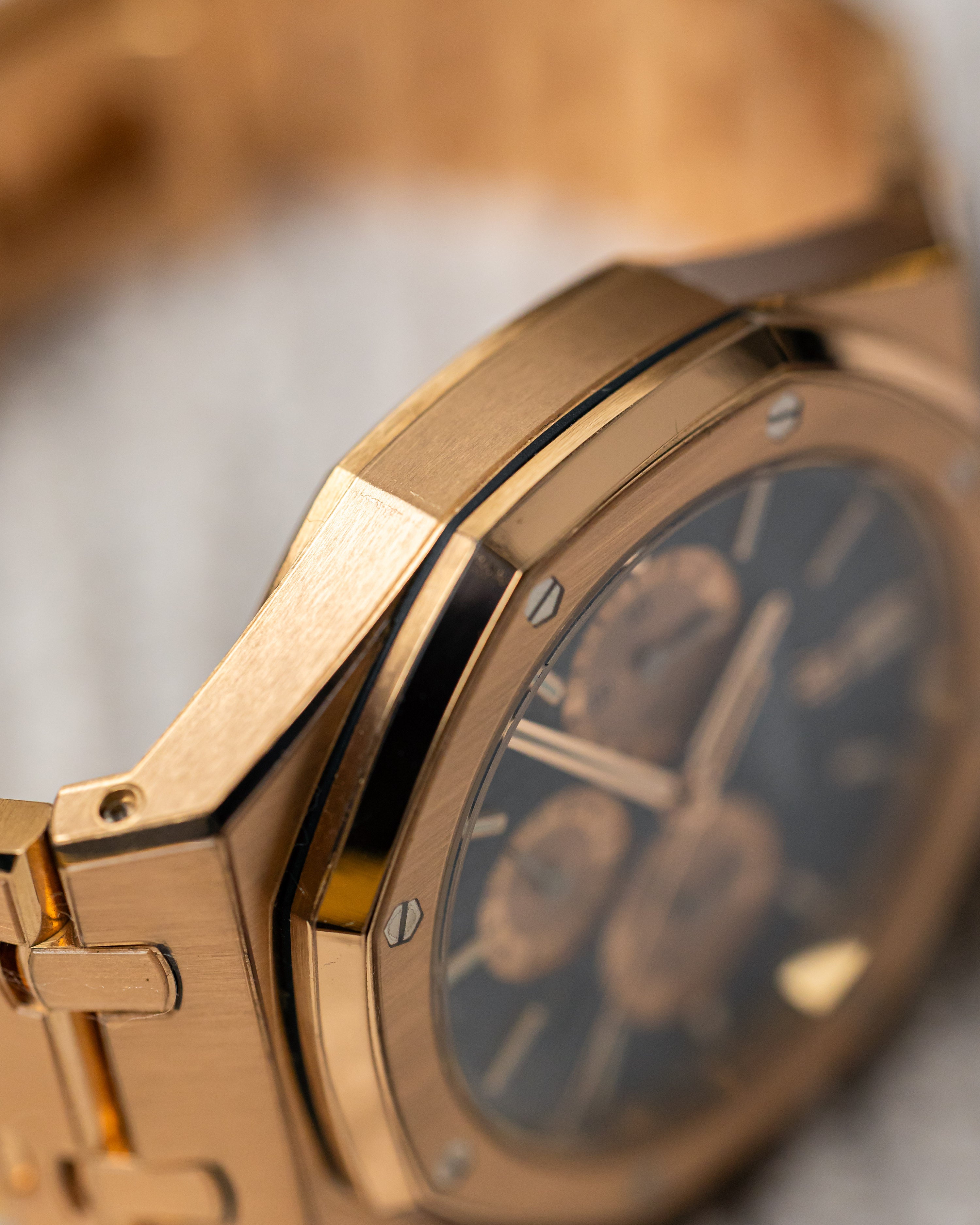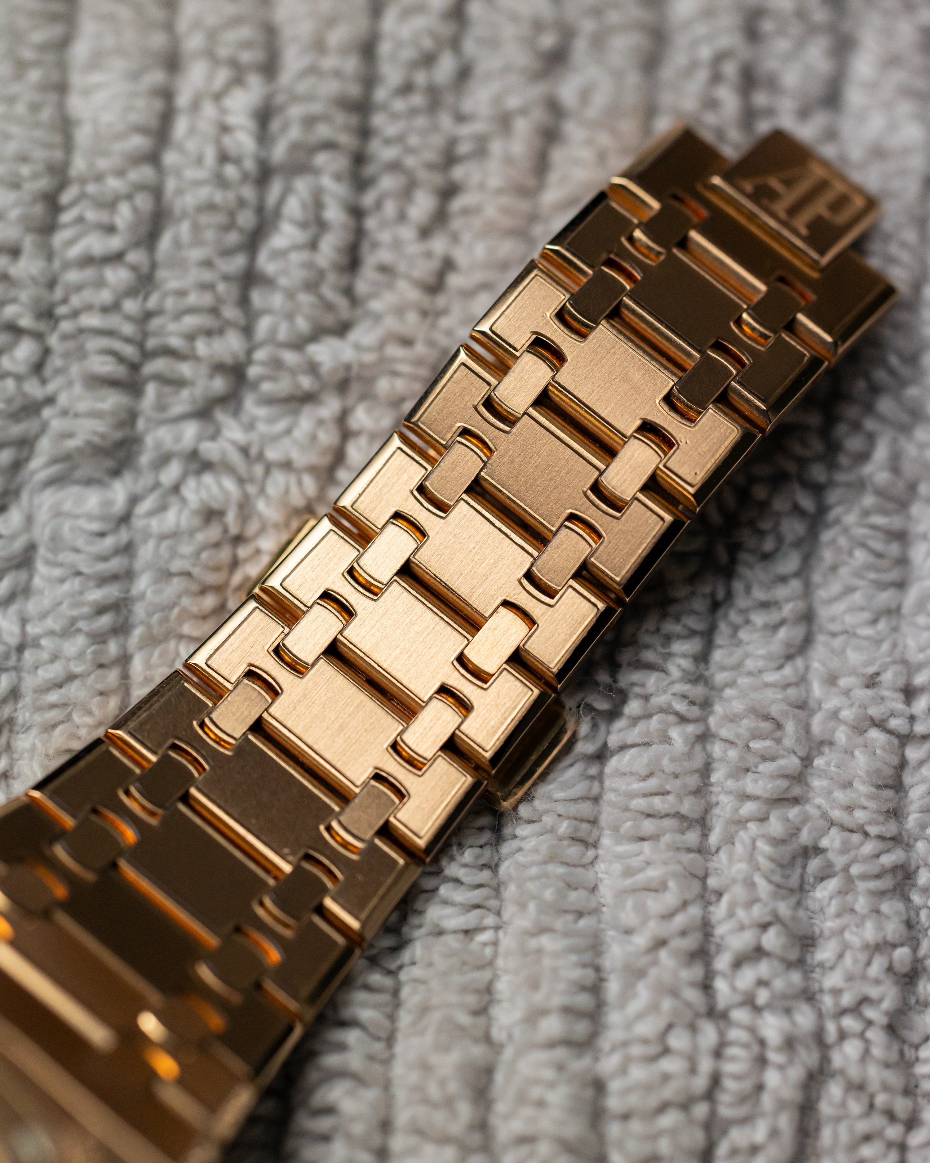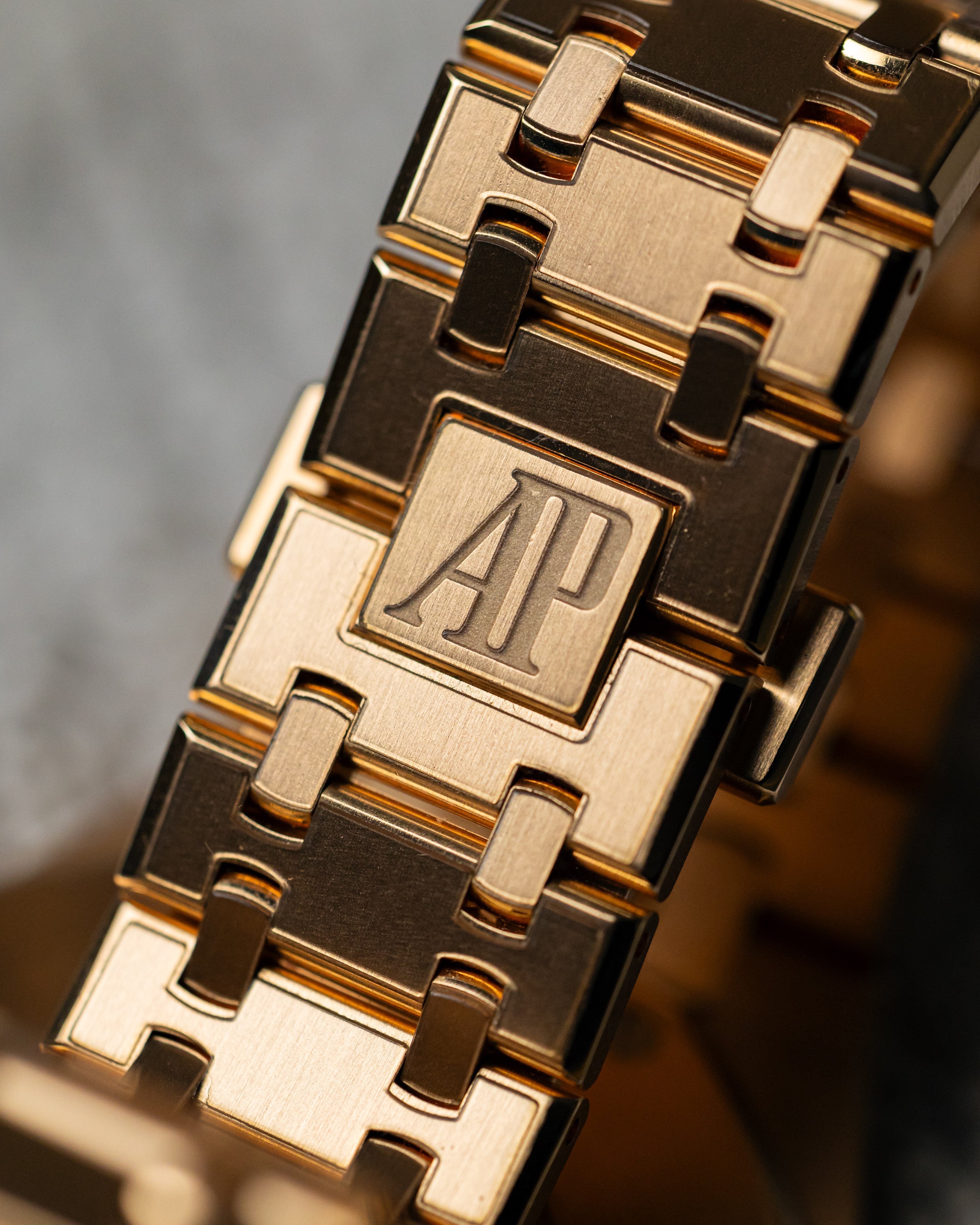 Rarely do we see the rose gold AP Chrono, let alone with the stunning Méga Tappiserie blue dial.
