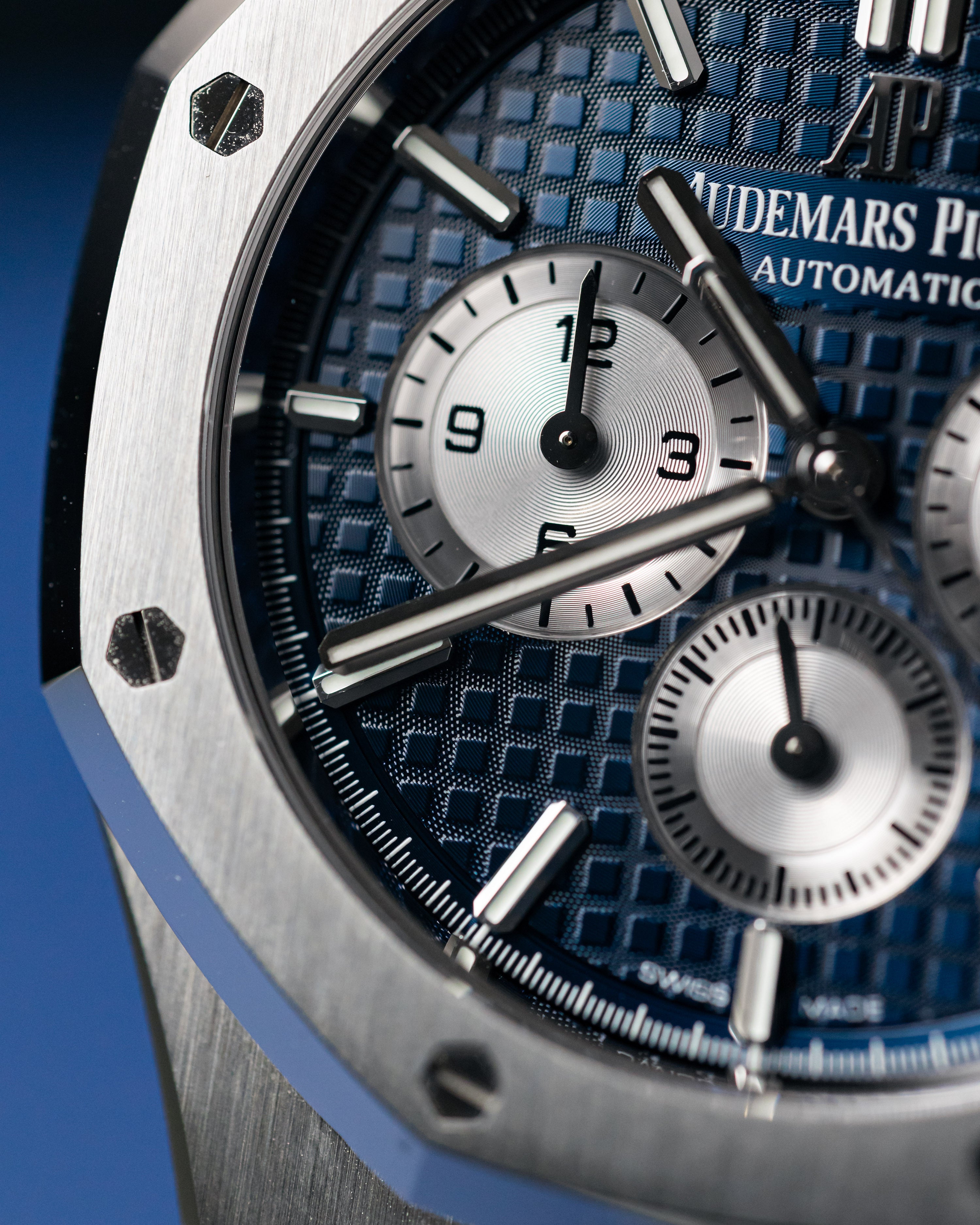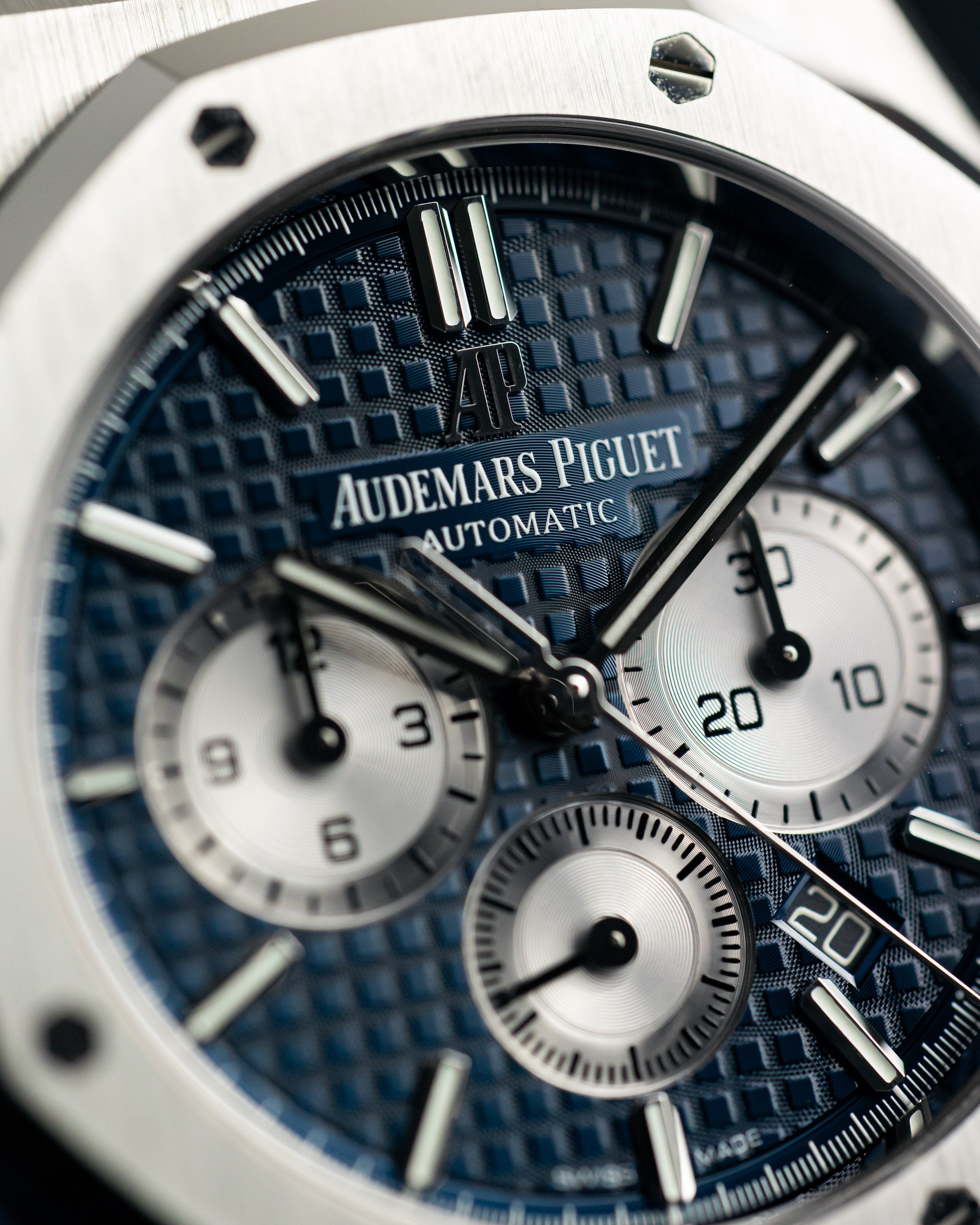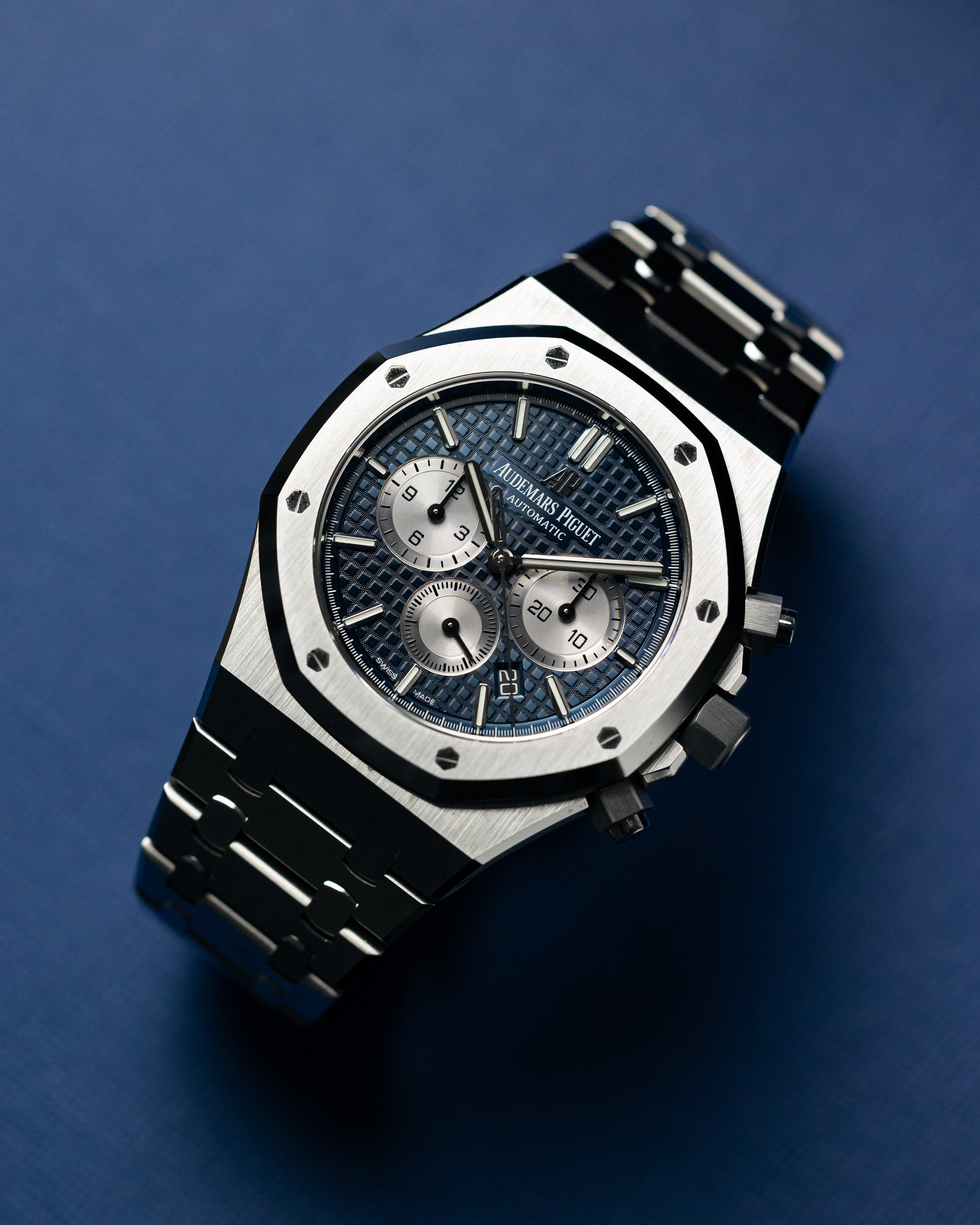 Encased in 41mm stainless steel surrounding a blue Grand Tapisserie patterned dial paired with the rhodium-toned counters works harmoniously.