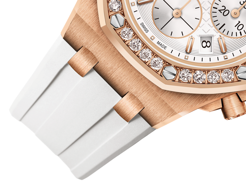 White rubber strap with 18-carat pink gold AP folding clasp.