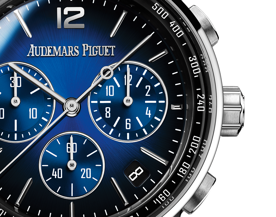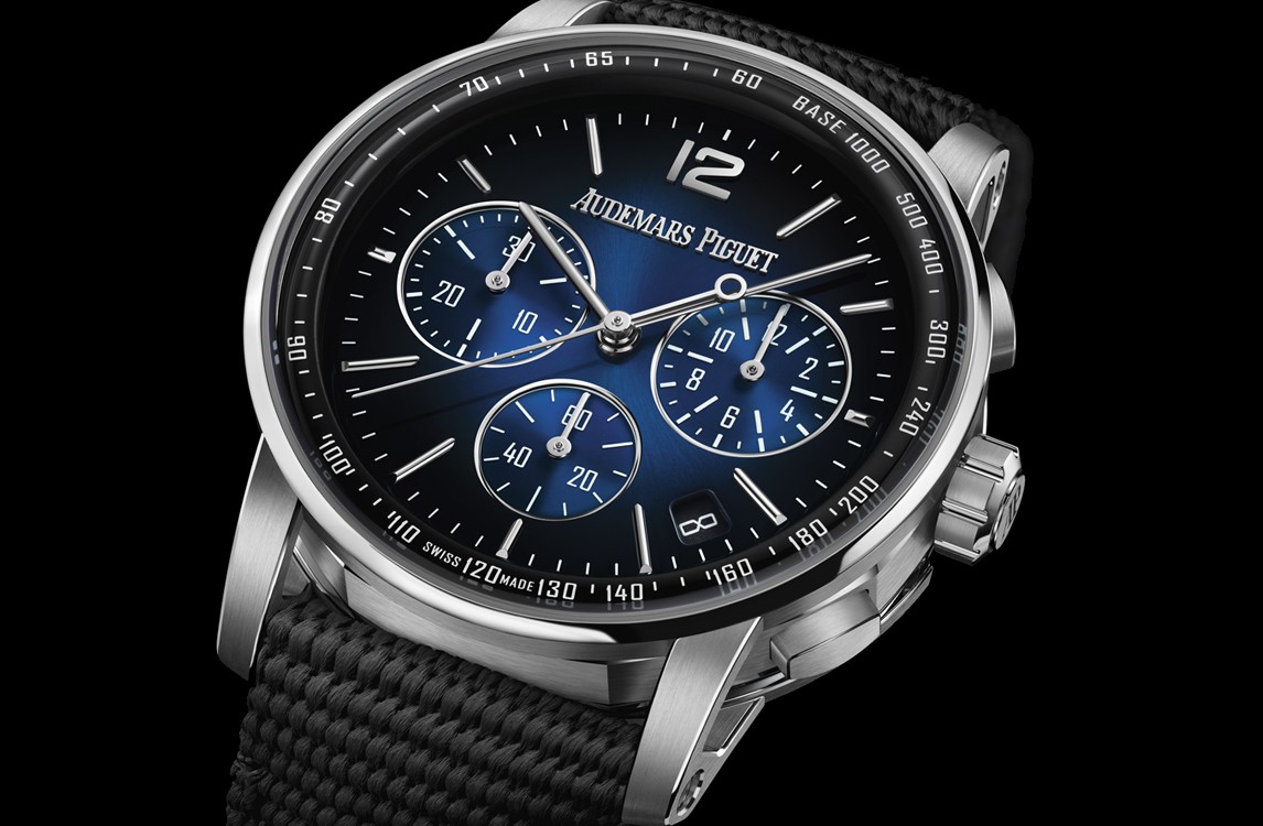 The Code 11.59 by Audemars Piguet Selfwinding Chronograph, powered by Calibre 4401, adorns an 18-carat white gold case enriched with a smoked blue sunburst lacquered dial.