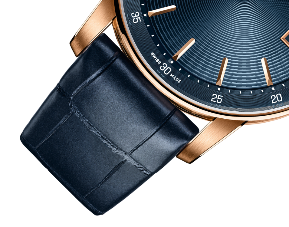 This timeless 38 mm model offers an elegant look with its 18-carat pink gold case contrasting with a “Bleu Nuit, Nuage 50” dial and strap.