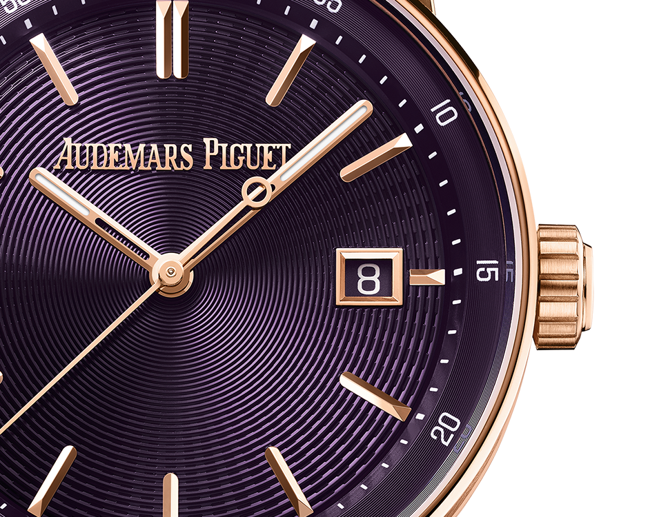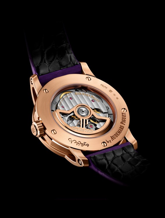 Purple dial, pink gold applied hour-markers and hands with luminescent coating, purple inner bezel.