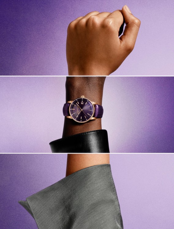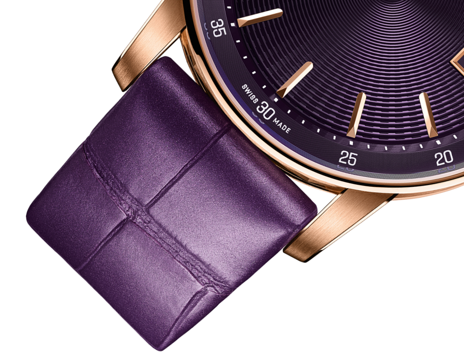 Housed in a new 38 mm sized case, this model unites a prune coloured dial and alligator strap with pink gold to deliver a rich and warm aesthetic.