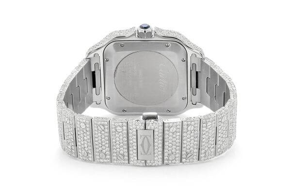 This Cartier iced out is made of Steel and has a 40mm case size with 27.40ctw of diamonds. this watch inside and out to Cartier quality standards. This watch comes with Cartier box.