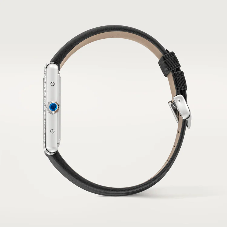 Luxuriously refined in stainless steel with a diamond-set bezel, this large Tank Must features a black leather strap for a sleek finish.