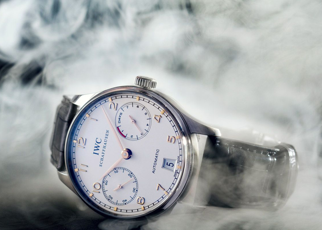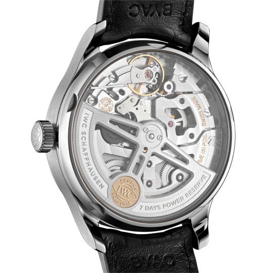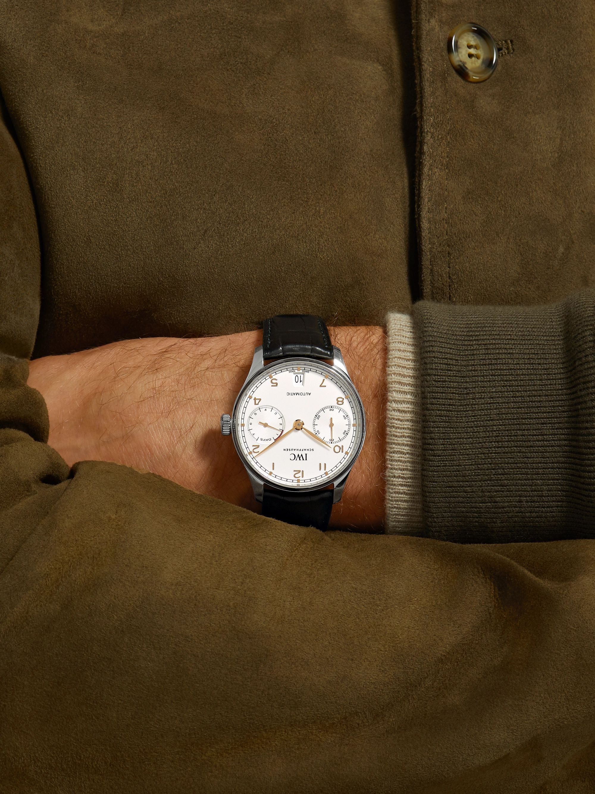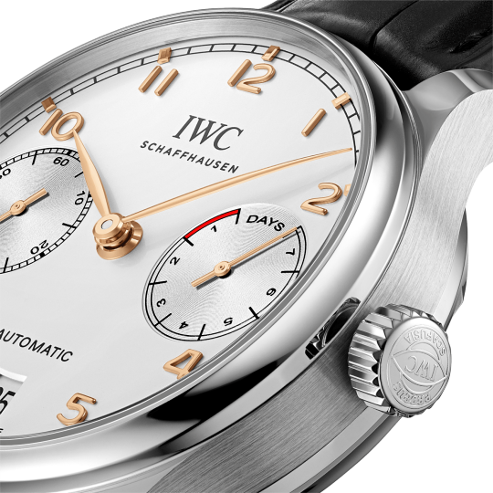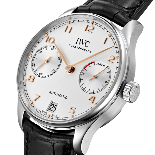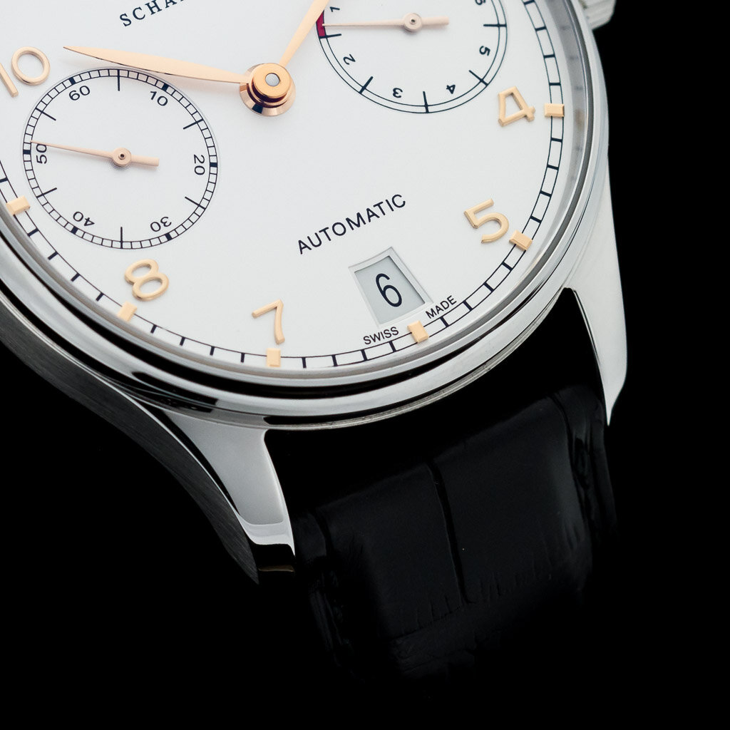 Silver-tone stainless steel case with black alligator leather strap. Fixed silver-tone stainless steel bezel. Silver-tone dial with rose gold leaf-shaped hands and Arabic numerals. Minute markers around outer rim.