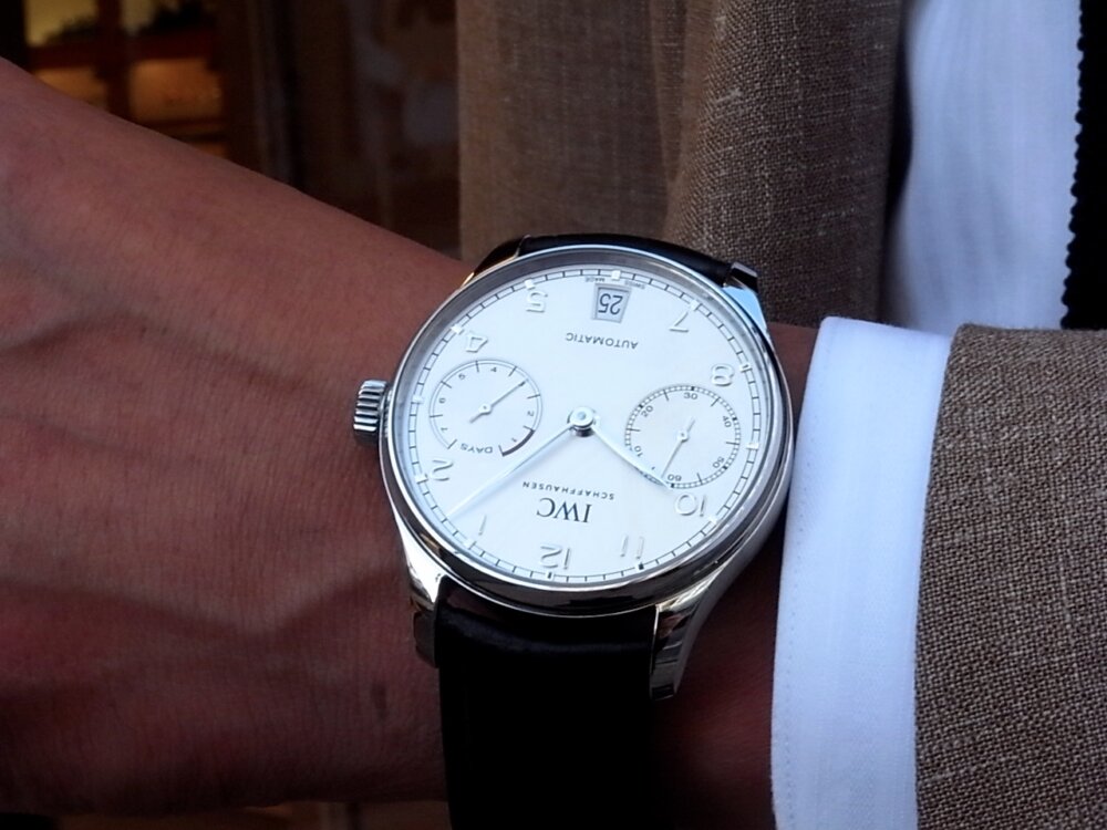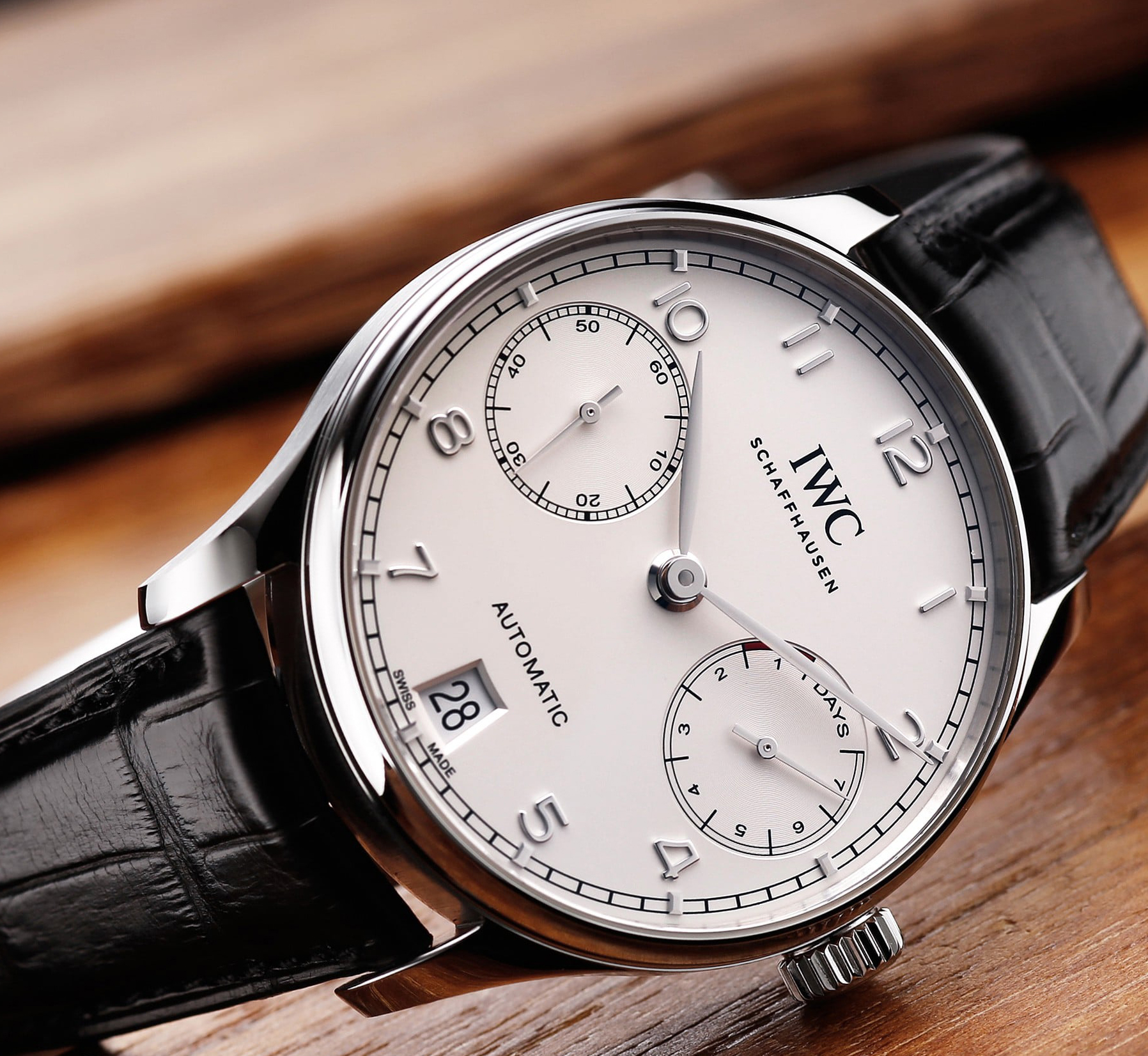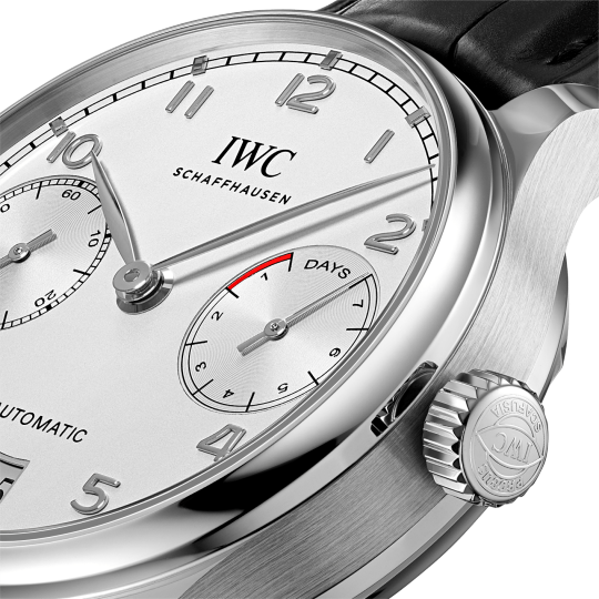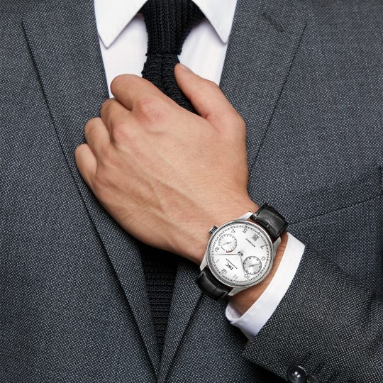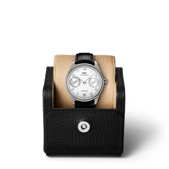 Silver-tone stainless steel case with black alligator leather strap. Fixed silver-tone stainless steel bezel. Silver-tone dial, silver-tone leaf-shaped hands and Arabic numerals. Minute markers around outer rim.