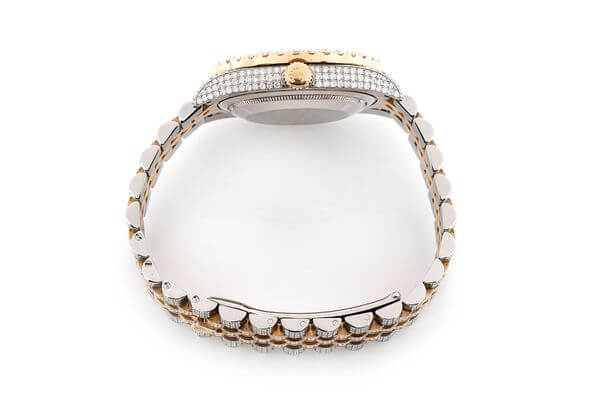 This Iced out Rolex DateJust is made of Two Tone and has a 36mm case size with 16.00ctw of Moissanite diamonds. Our expert watchmakers have serviced this watch inside and out to Rolex quality standards. This watch comes with an Rolex box.
