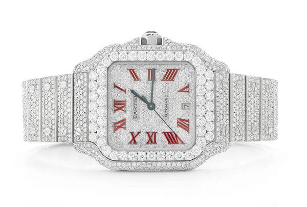 ICED OUT CARTIER WATCH 40MM STEEL FULL MOISSANITE RED ROMAN DIAL