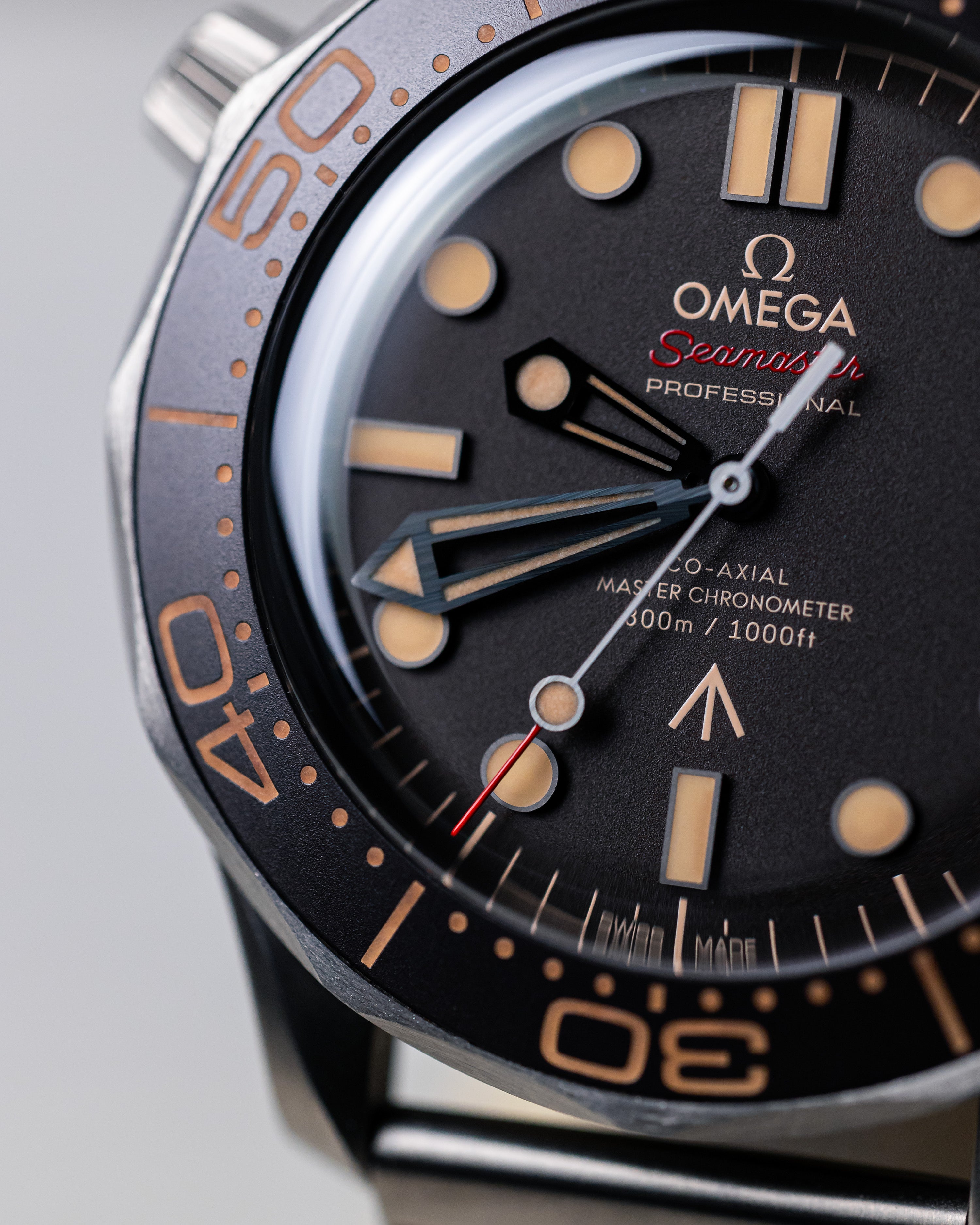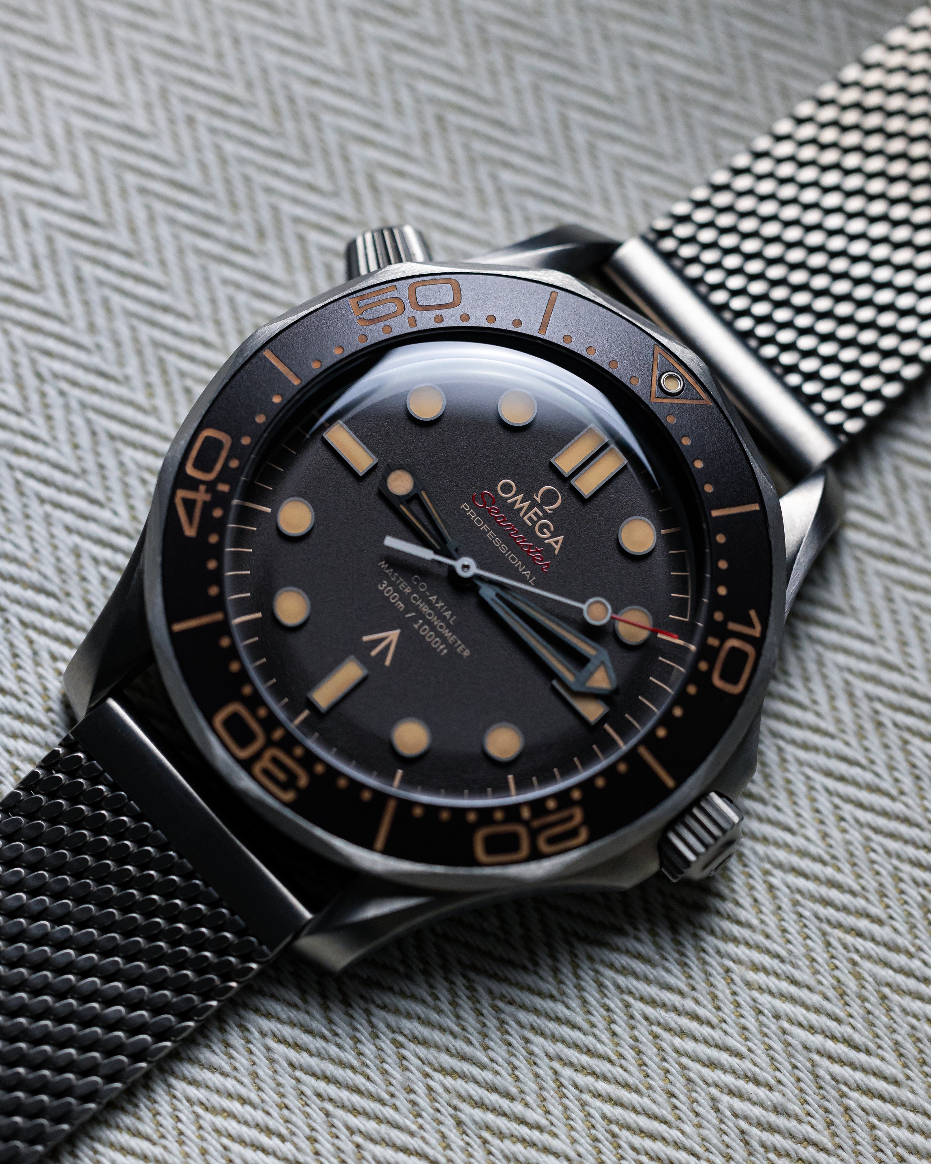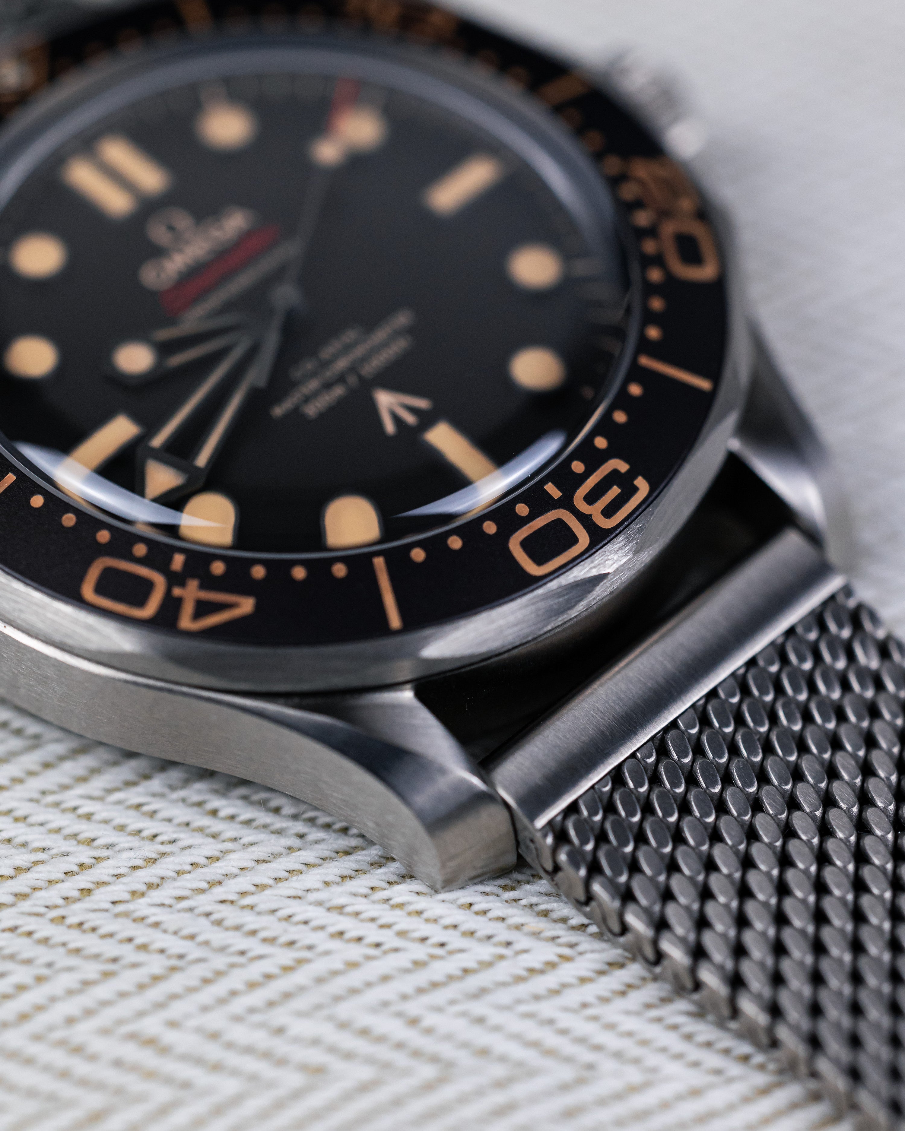 Identical to 007’s watch in No Time To Die, this 42mm Seamaster is both strong and lightweight, crafted from Grade 2 Titanium. Its matching mesh-style bracelet enhances the vintage aesthetic without compromising comfort or functionality.