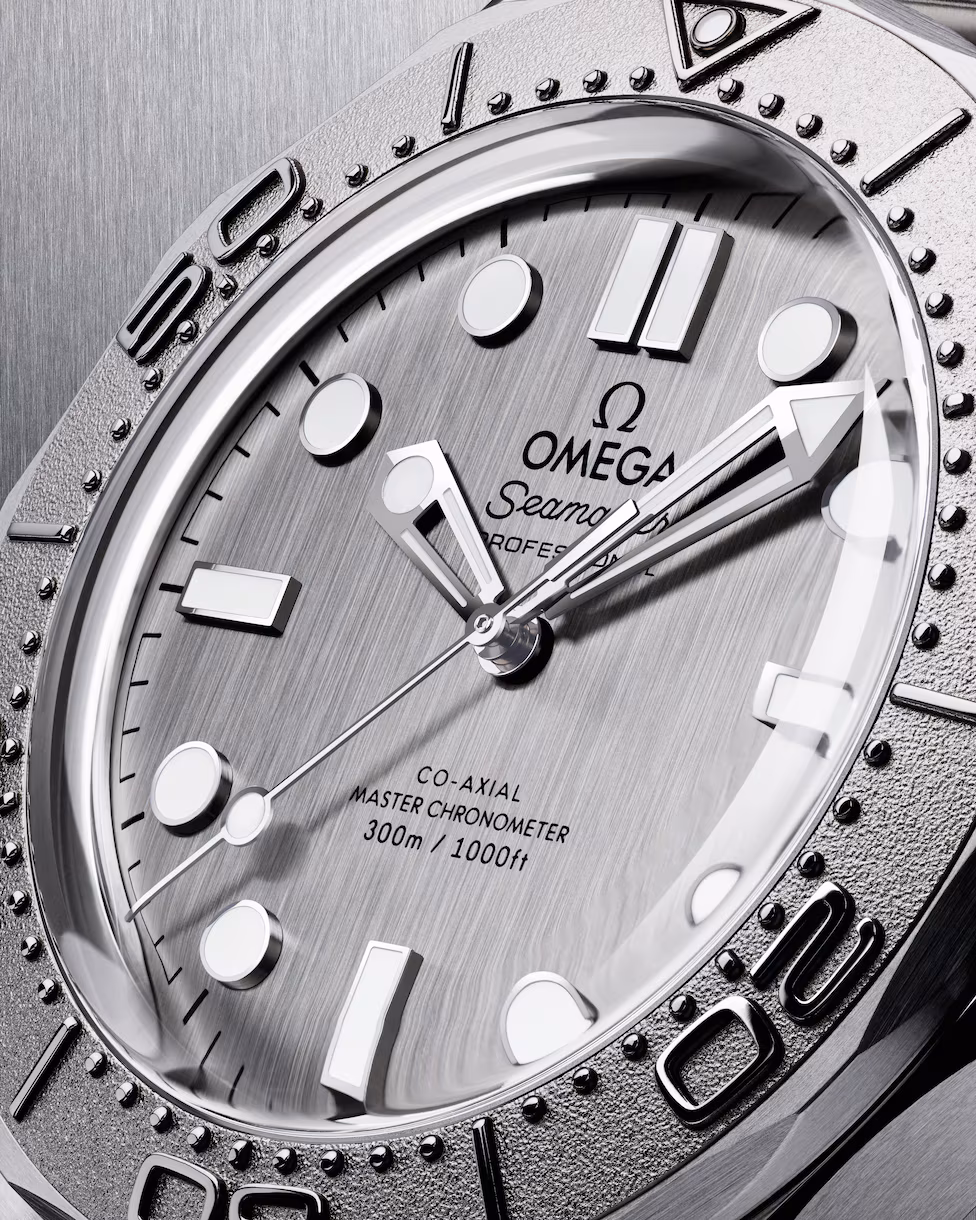 PVD stainless steel is used to create the brushed dial as well as the polished and skeletonized hands and indexes, which are filled with white Super-LumiNova. Other markings, including the OMEGA logo, are transferred in black.