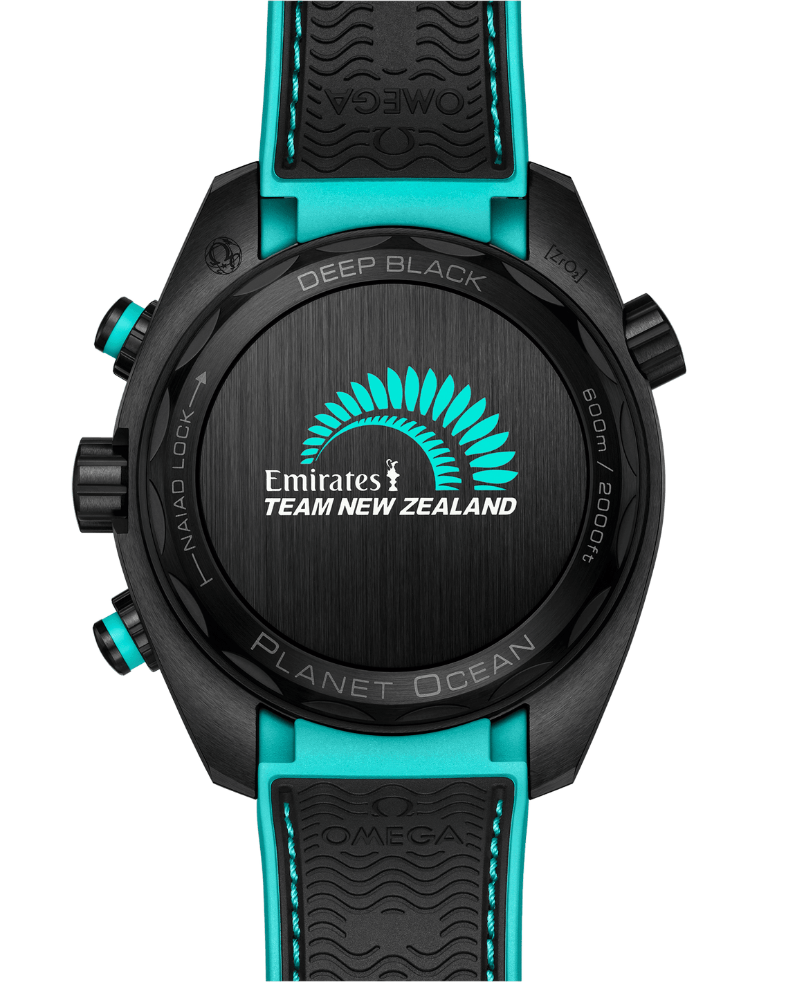 The back of the watch uses NAIAD LOCK technology, which is decorated with the New Zealand Chiefs Team logo, which is composed of turquoise ferns and white letters, in order to pay tribute to the New Zealand sailing team. The watch is equipped with the Omega 9900 Master Chronometer movement, which provides strong power for it.