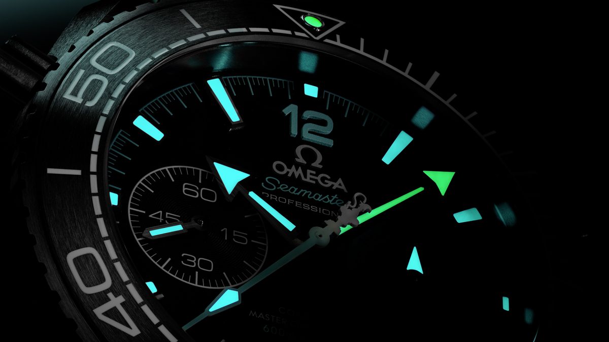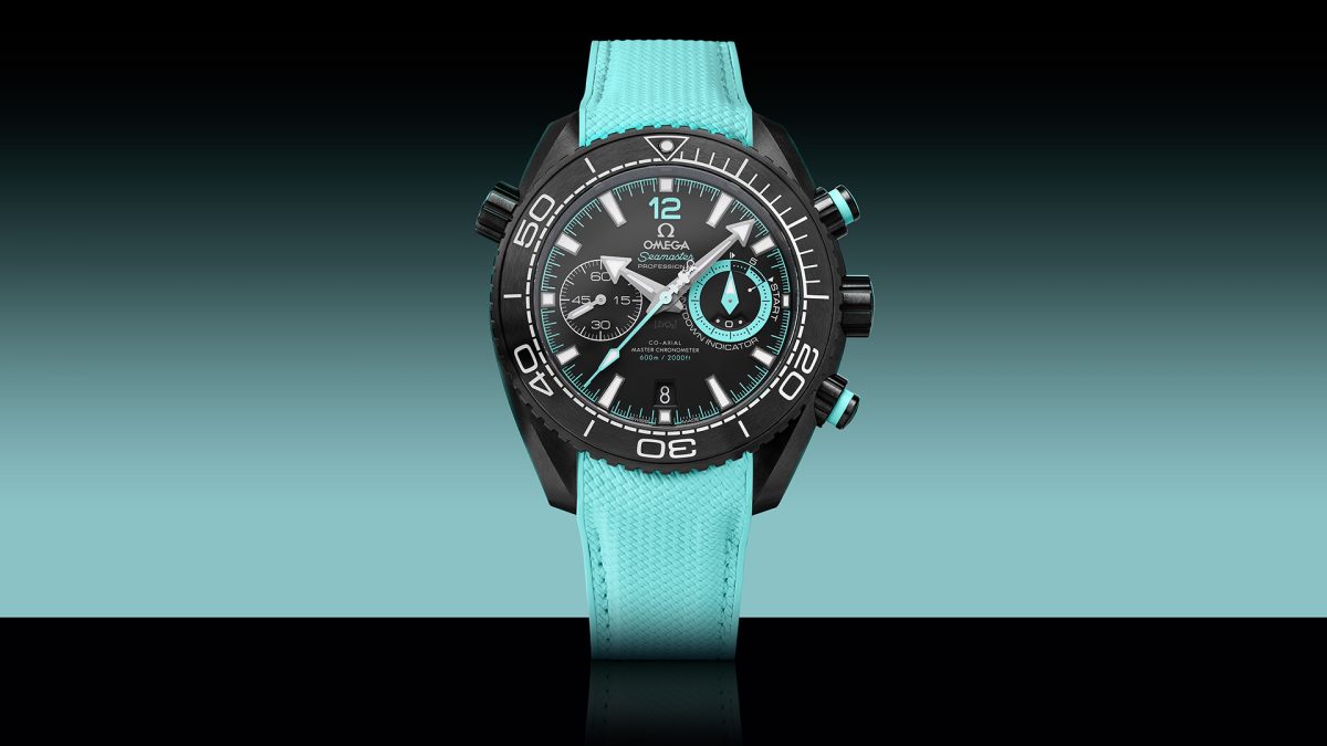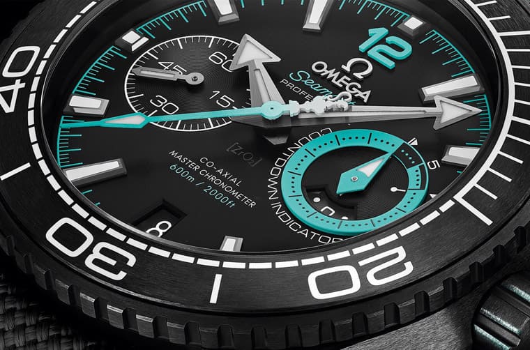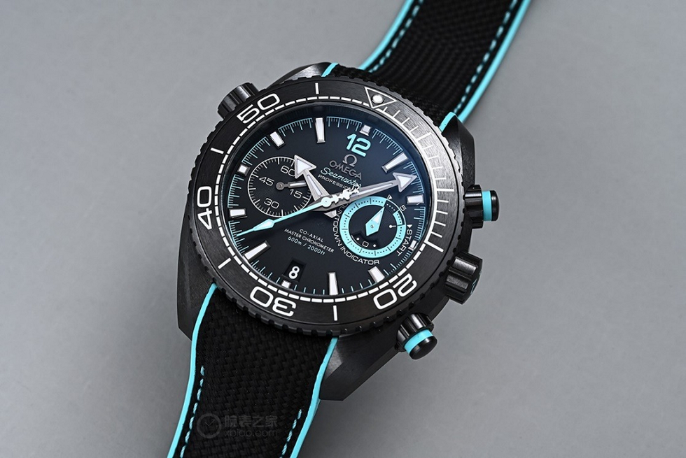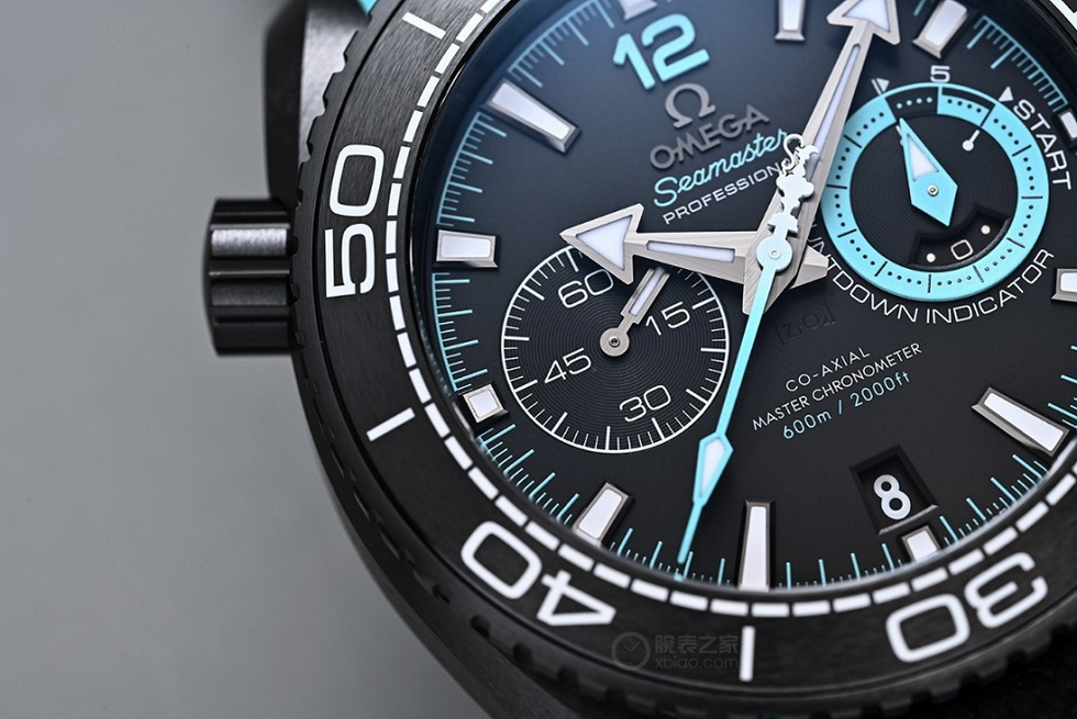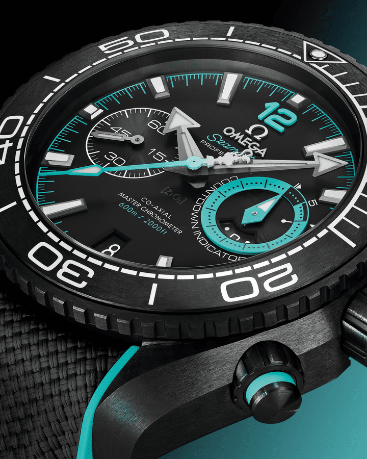 The black ceramic chronograph button is brushed and paired with a turquoise ring. The “He” (helium) on the helium exhaust valve and the Omega logo on the crown are also decorated with this turquoise color.