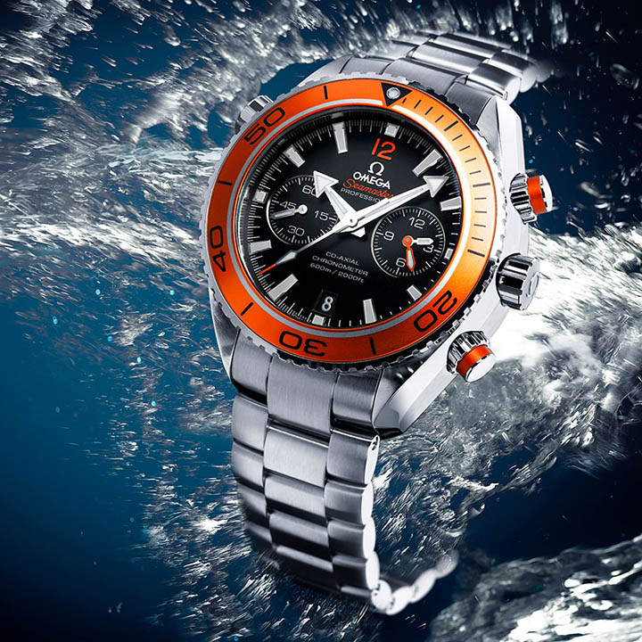 The OMEGA Seamaster Planet Ocean 600M is water resistant to 600 metres / 2000 feet / 60 bar, and has a helium-escape valve. This certified chronometer timepiece is powered by the OMEGA Co-Axial calibre 9300 which can be seen through the transparent caseback.