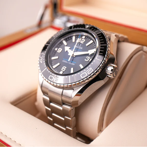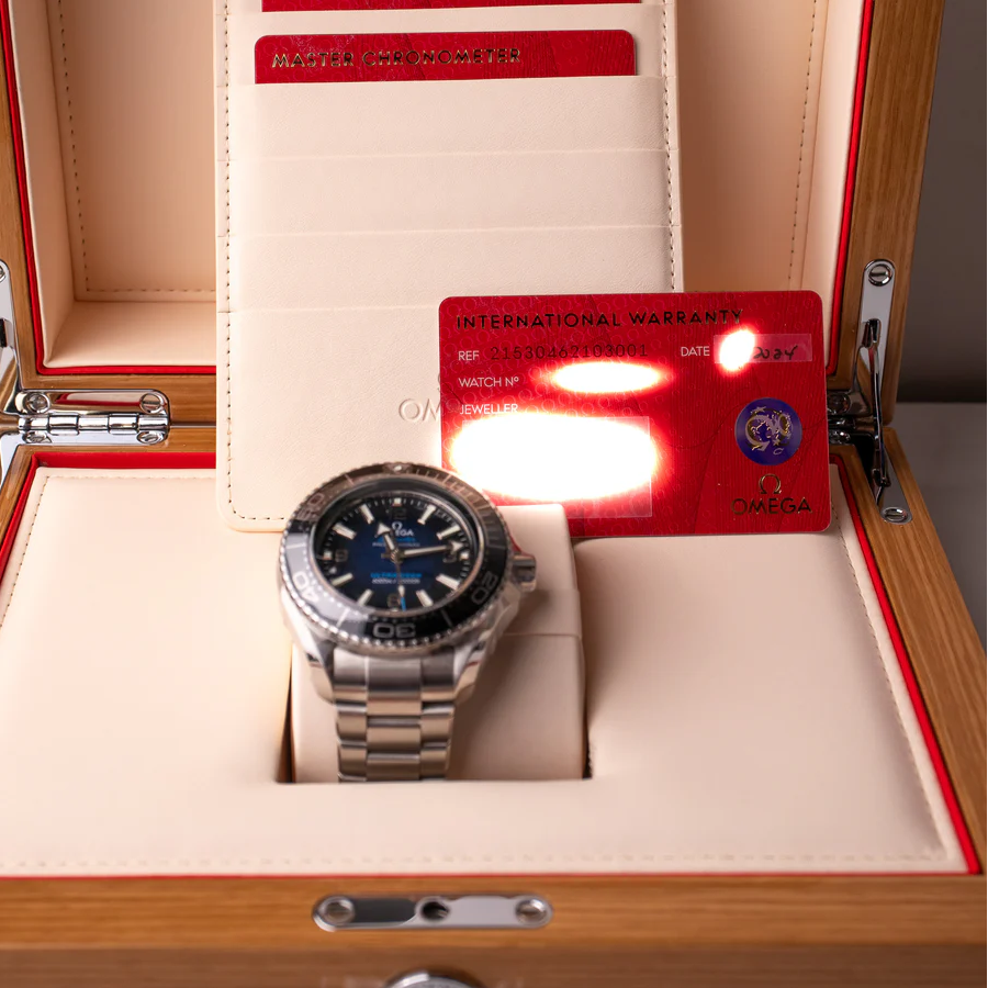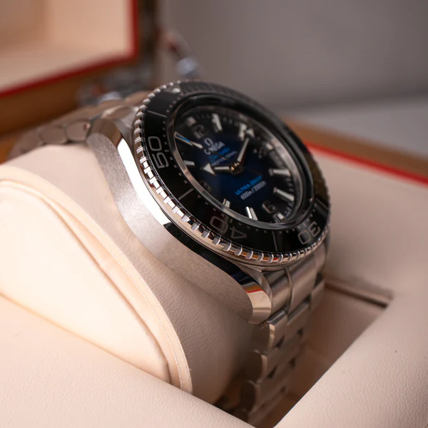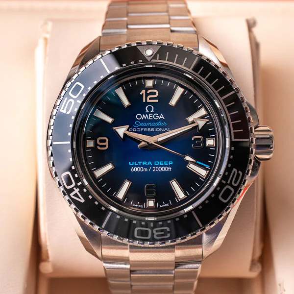 Omega made history with its Ultra Deep model as part of the First Deeps Expedition in 2019, reading the deepest place on Earth. That game-changing watch has now been adapted for a unique collection available for you. Tested in real ocean conditions, it is water resistant to an astounding 6,000m and meets the ISO 6425:2018 standard for saturation divers’ watches. This model’s case is 45.4mm in diameter, 18.1mm thick, and 51.9mm lug to lug and is made of a proprietary alloy, O-MEGASTEEL. The 18K white gold broad arrow hands and all 12 raised indices are filled with Super Luminova and the domed sapphire crystal has anti-reflective treatment on both sides for amazing readability. The lacquered gradient dial transitions from blue to black, with Arabic numerals at the 3-, 6-, 9-, and 12-hour marks, and no date for a clean, purposeful finish. The black ceramic uni-directional bezel has an Omega Liquidmetal diving scale. The tip of the seconds hand, the “Seamaster” and “Ultra Deep” wordmarks are in an eye-catching azure blue, adding a bold touch.