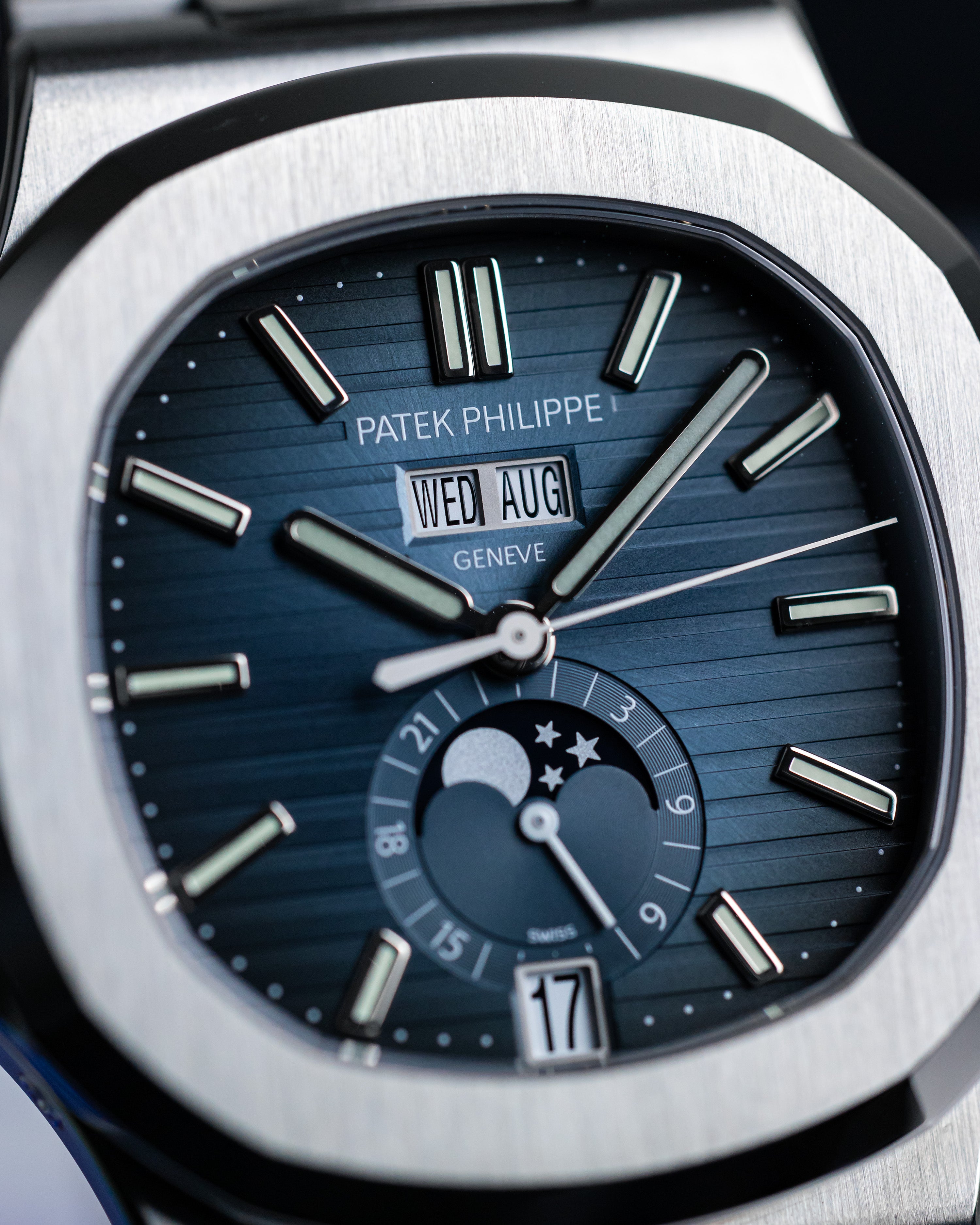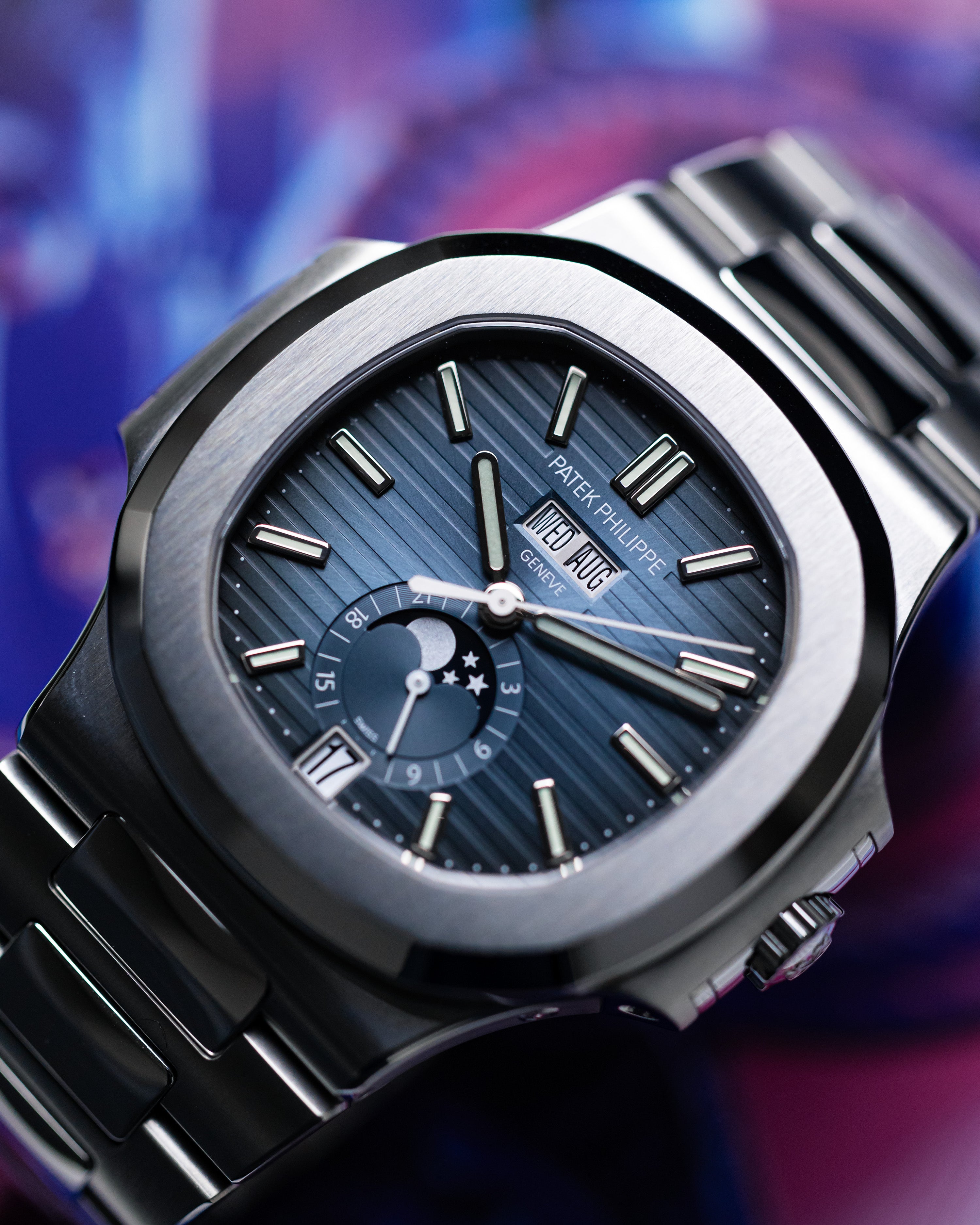 Inspired by the dial colour of the original Nautilus model from 1976, the 5726/1A features a blue dial with an annual calendar and a moon phase display. Designed with the Nautilus collection’s signature horizontal embossing and an integrated bracelet, it maintains its iconic silhouette.