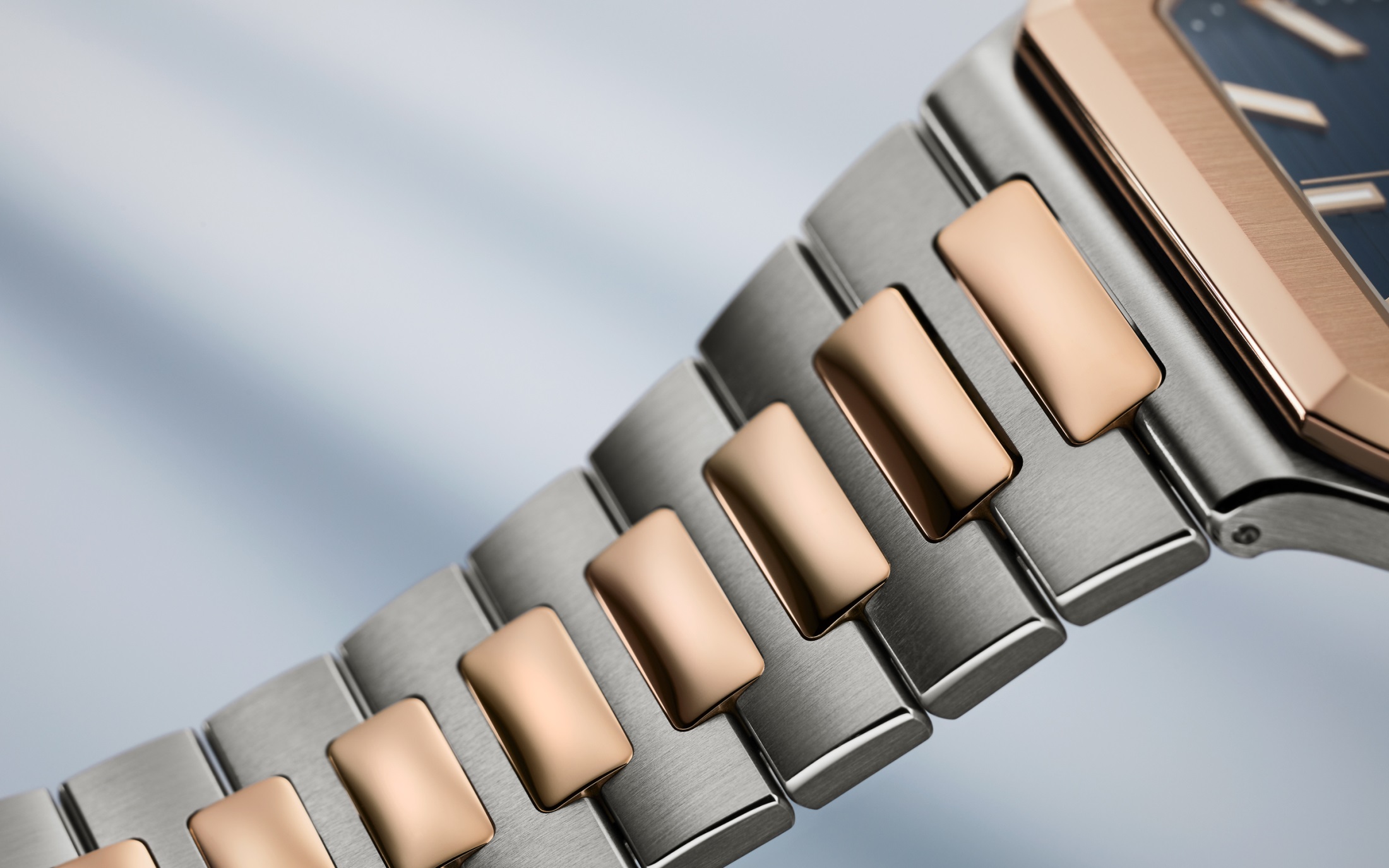 Rose gold and steel. Patented fold-over clasp with lockable adjustment system.