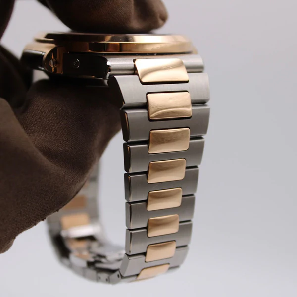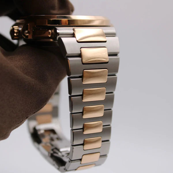 Presented within a robust steel and 18ct rose gold case, this model fastens with a steel and gold bracelet with a fold-over clasp.