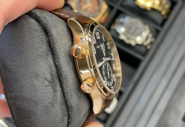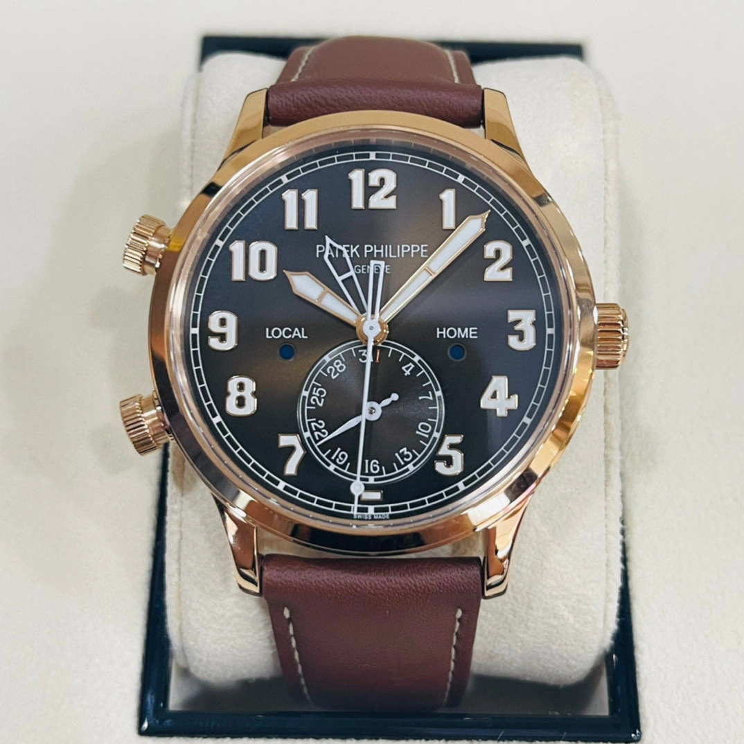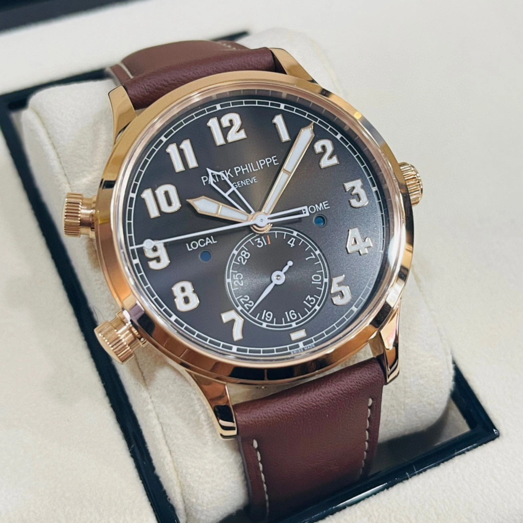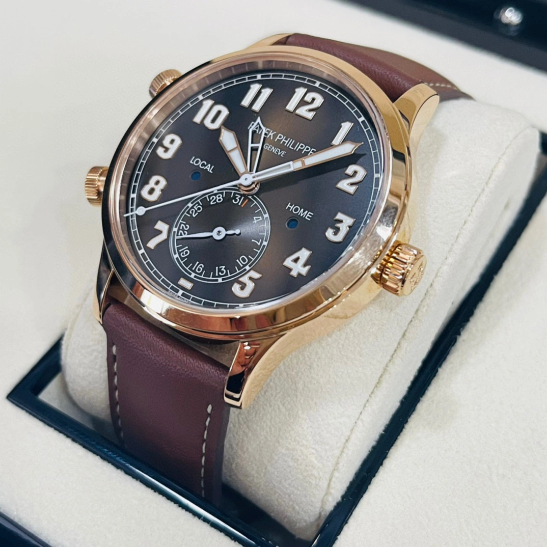 The Ref. 5524 Calatrava Pilot Travel Time with a second time zone and a local-time date was launched in 2015 with a white-gold case and a blue dial. Now, it comes in a new rose-gold version with a brown dial and a black gradation. It is a refined and bold debut for an inimitable timepiece that pays tribute to Patek Philippe’s traditional aviator's watches.
