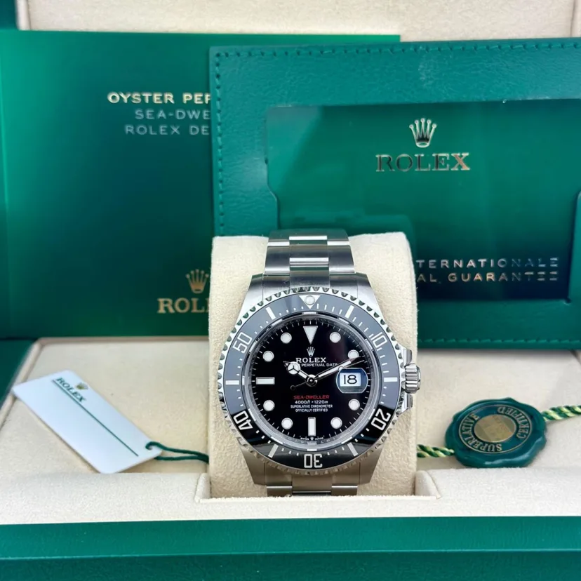 The black dial of the Sea-Dweller has the large hands and indices reserved for Rolex professional models. The dial bears the name Sea-Dweller in red, a reference to the first model. The innovative Chromalight display on the dial pushes back the boundaries of visibility in dark environments. Its distinctive blue glow lasts up to eight hours with a uniform luminosity, practically twice as long as that of standard luminescent materials.