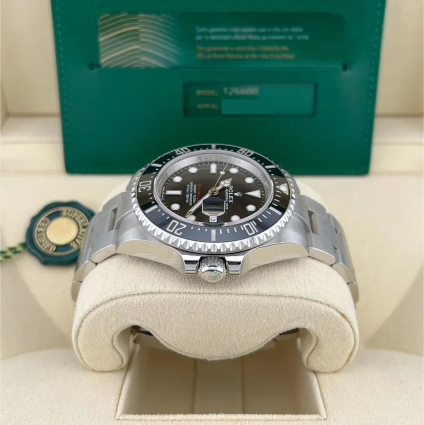The 60-minute graduated, unidirectional rotatable bezel of the Sea-Dweller enables divers to precisely and safely monitor their dive and decompression times. It is equipped with a patented black Cerachrom bezel insert manufactured by Rolex in a virtually scratchproof ceramic whose colour is unaffected by ultraviolet rays. The graduation is coated via PVD (Physical Vapour Deposition) with a thin layer of platinum. The sleek black dial features large Chromalight hour markers and hands, filled with luminescent material that emits a long-lasting blue glow for excellent legibility in dark conditions.
