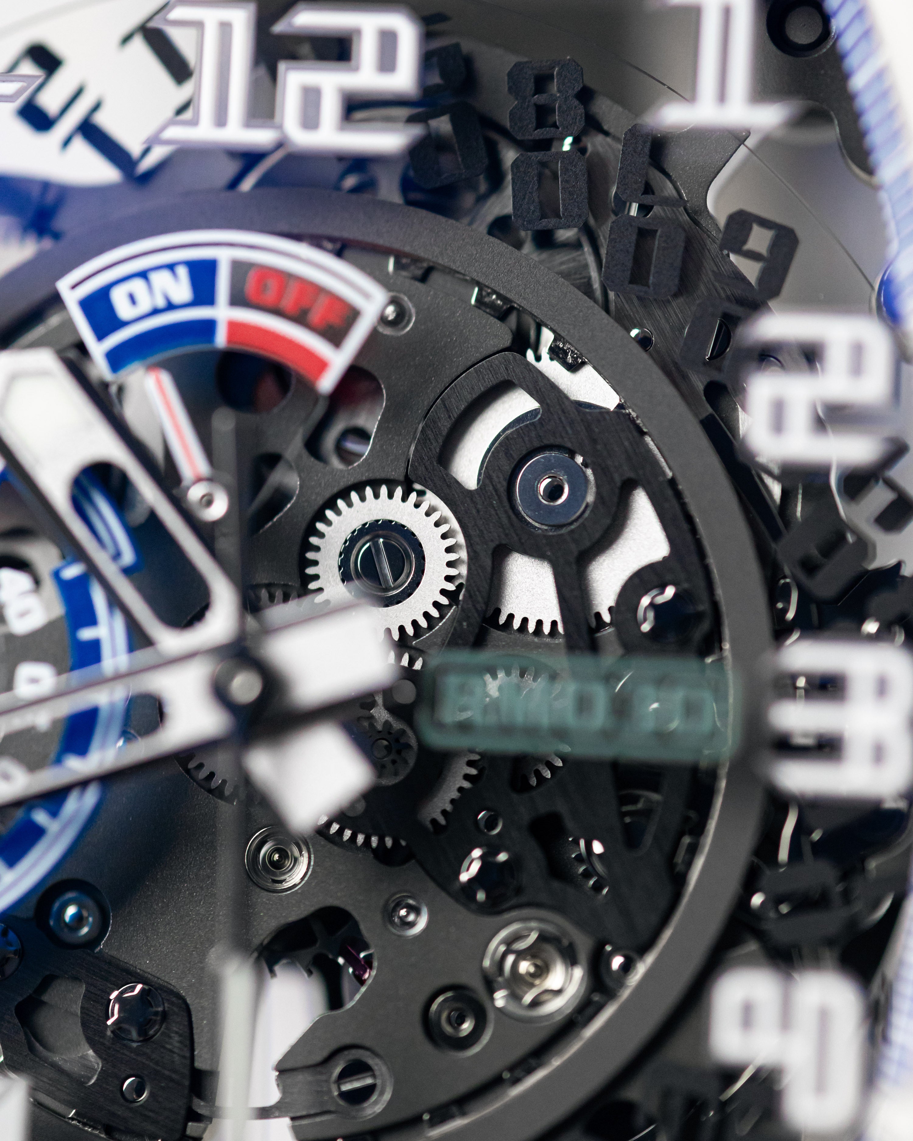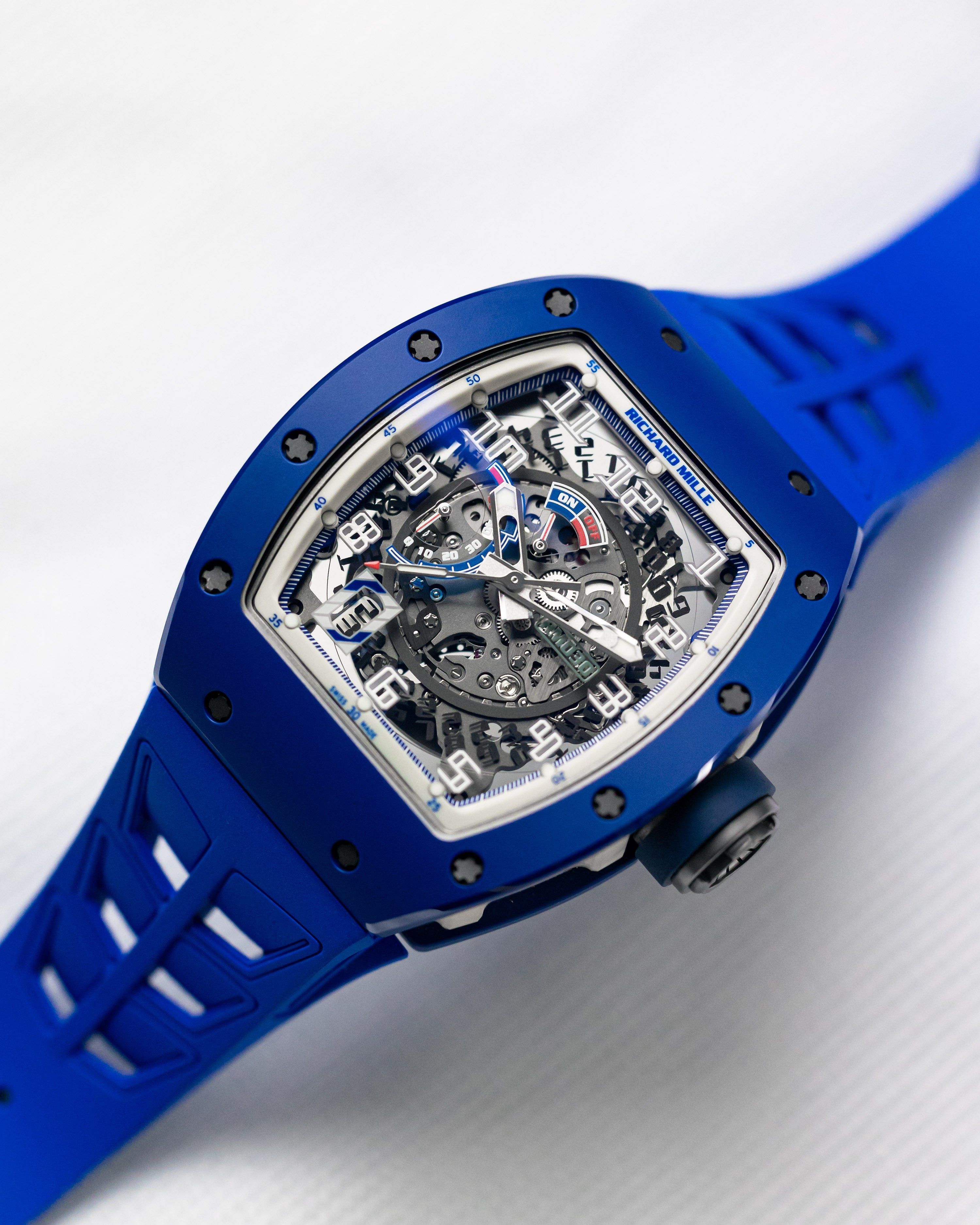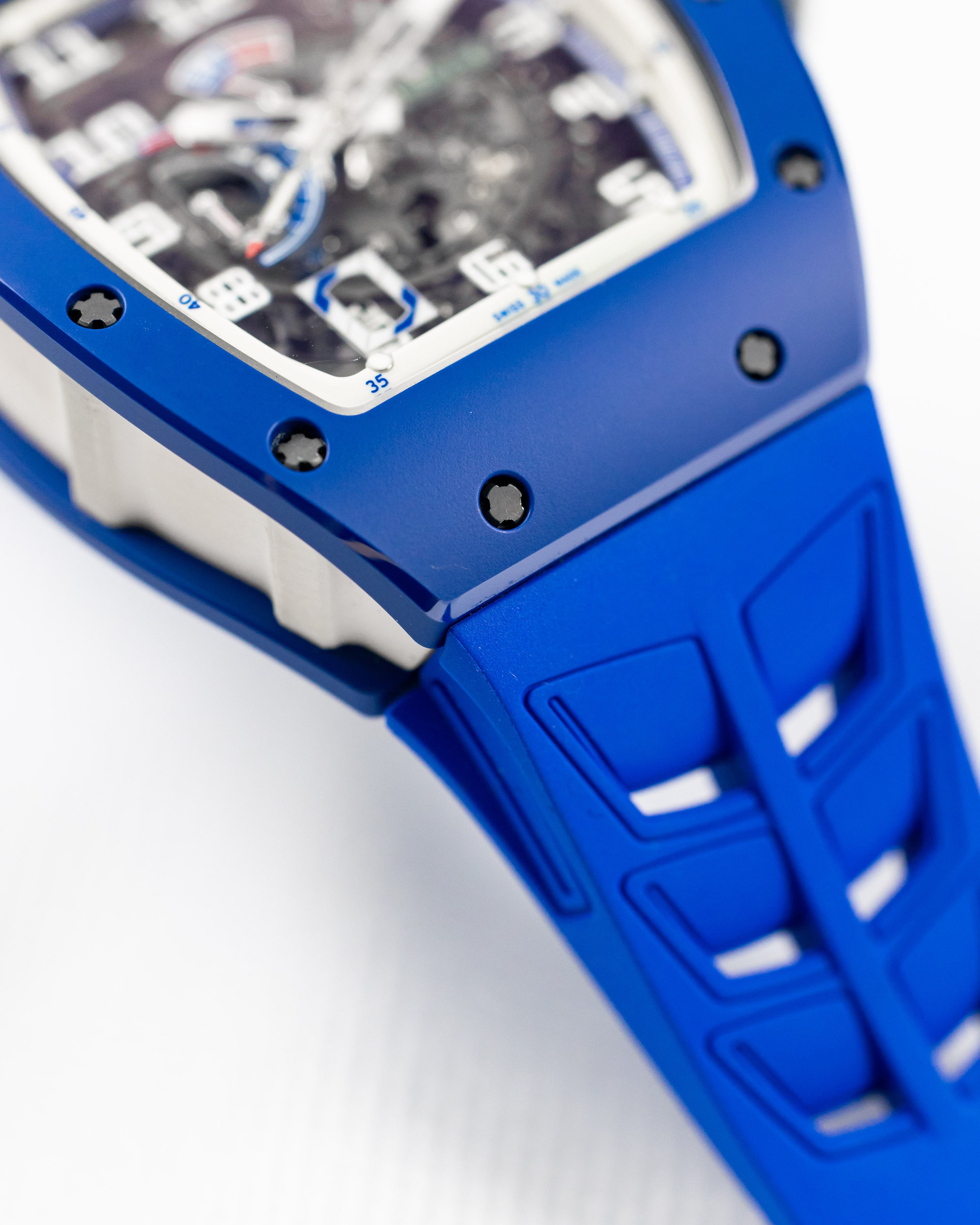 Crafted with a highly scratch resistant blue ceramic with white quartz TPT case band, the skeletonised RMAR1 movement can be admired through the sapphire glass on both the front and back. In addition to displaying the hours, minutes, central seconds and power reserve, a notable feature of this movement is its de-clutching rotor, a mechanism designed to prevent overwinding of the two barrels.