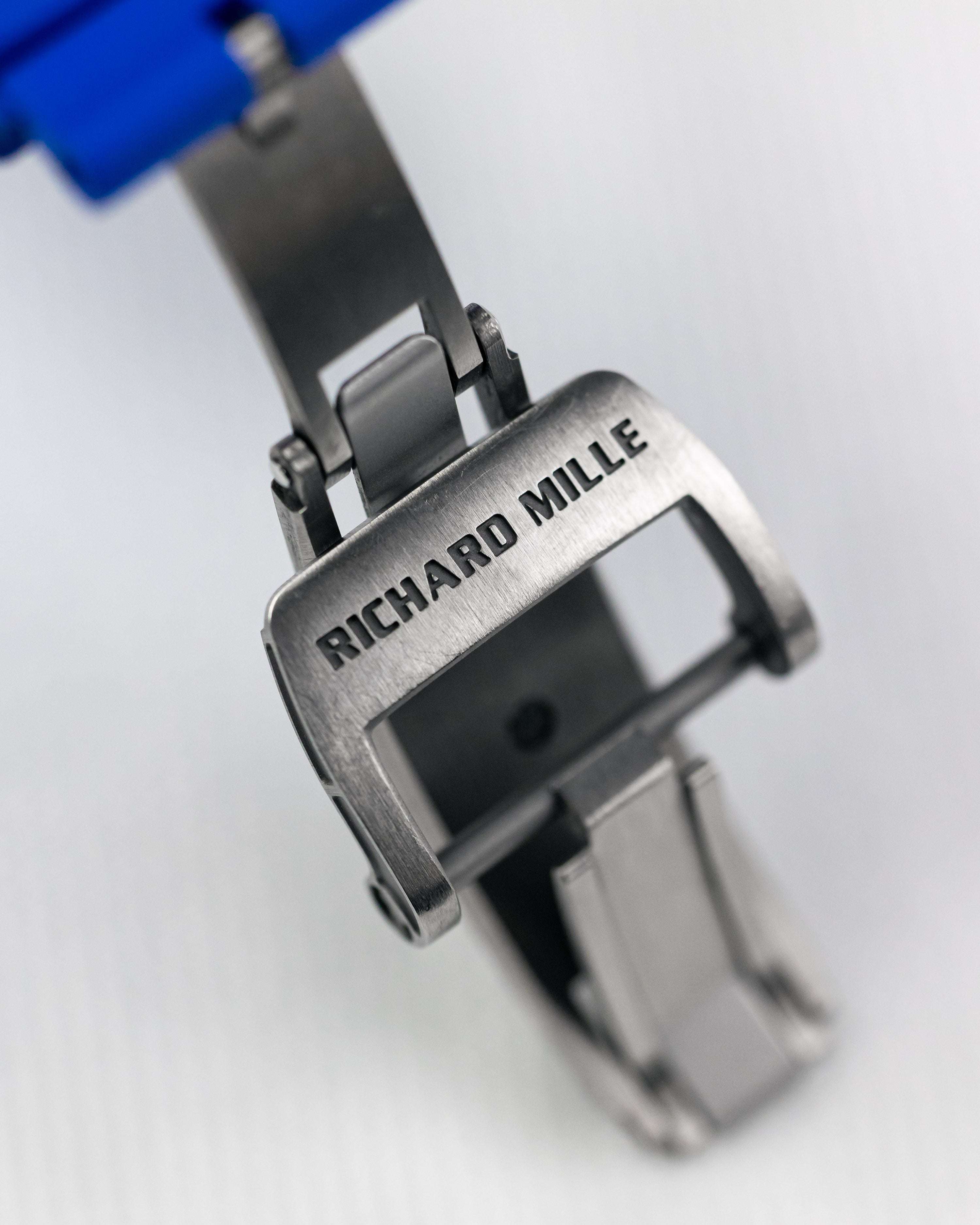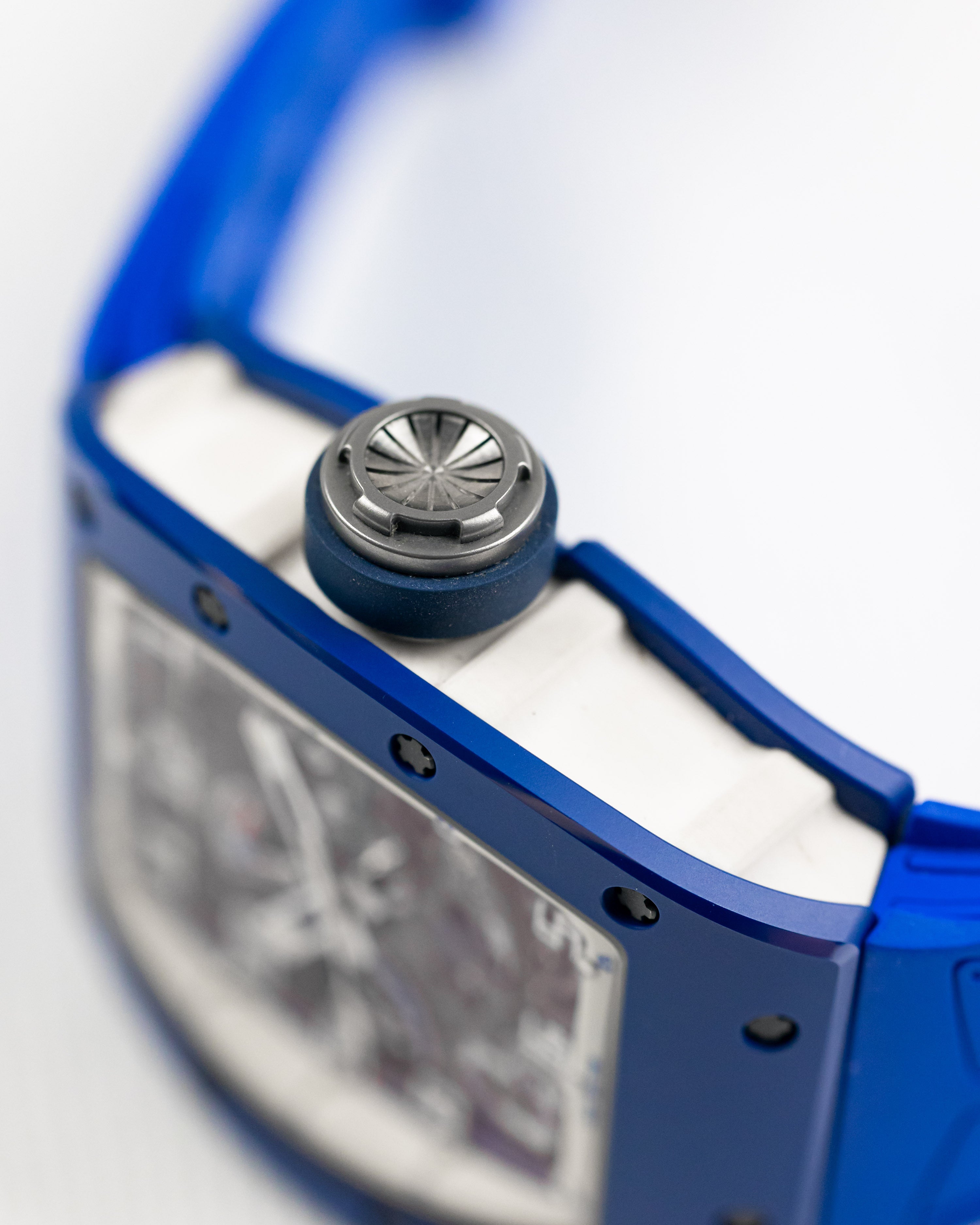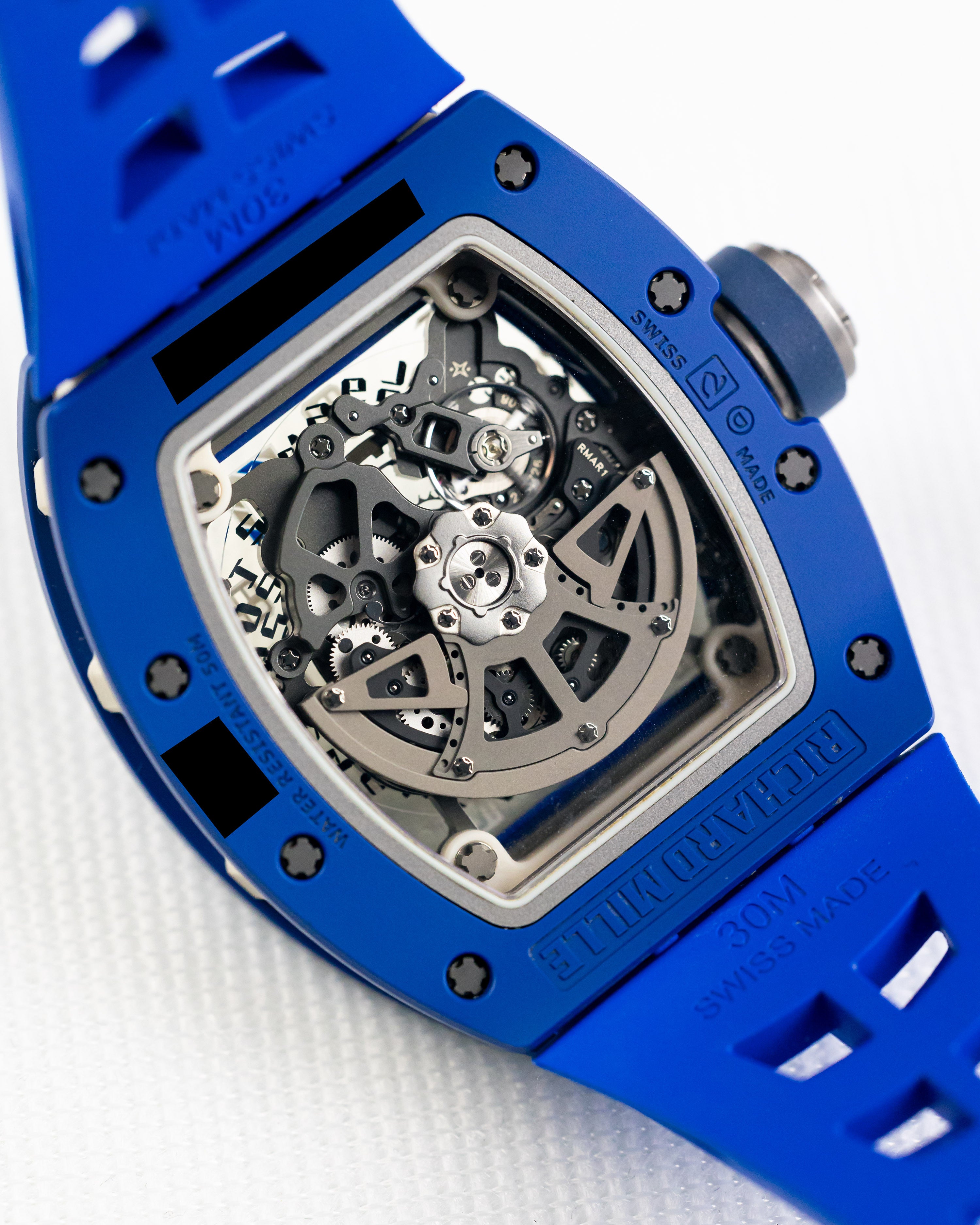 Crafted with a highly scratch resistant blue ceramic with white quartz TPT case band, the skeletonised RMAR1 movement can be admired through the sapphire glass on both the front and back. In addition to displaying the hours, minutes, central seconds and power reserve, a notable feature of this movement is its de-clutching rotor, a mechanism designed to prevent overwinding of the two barrels.
