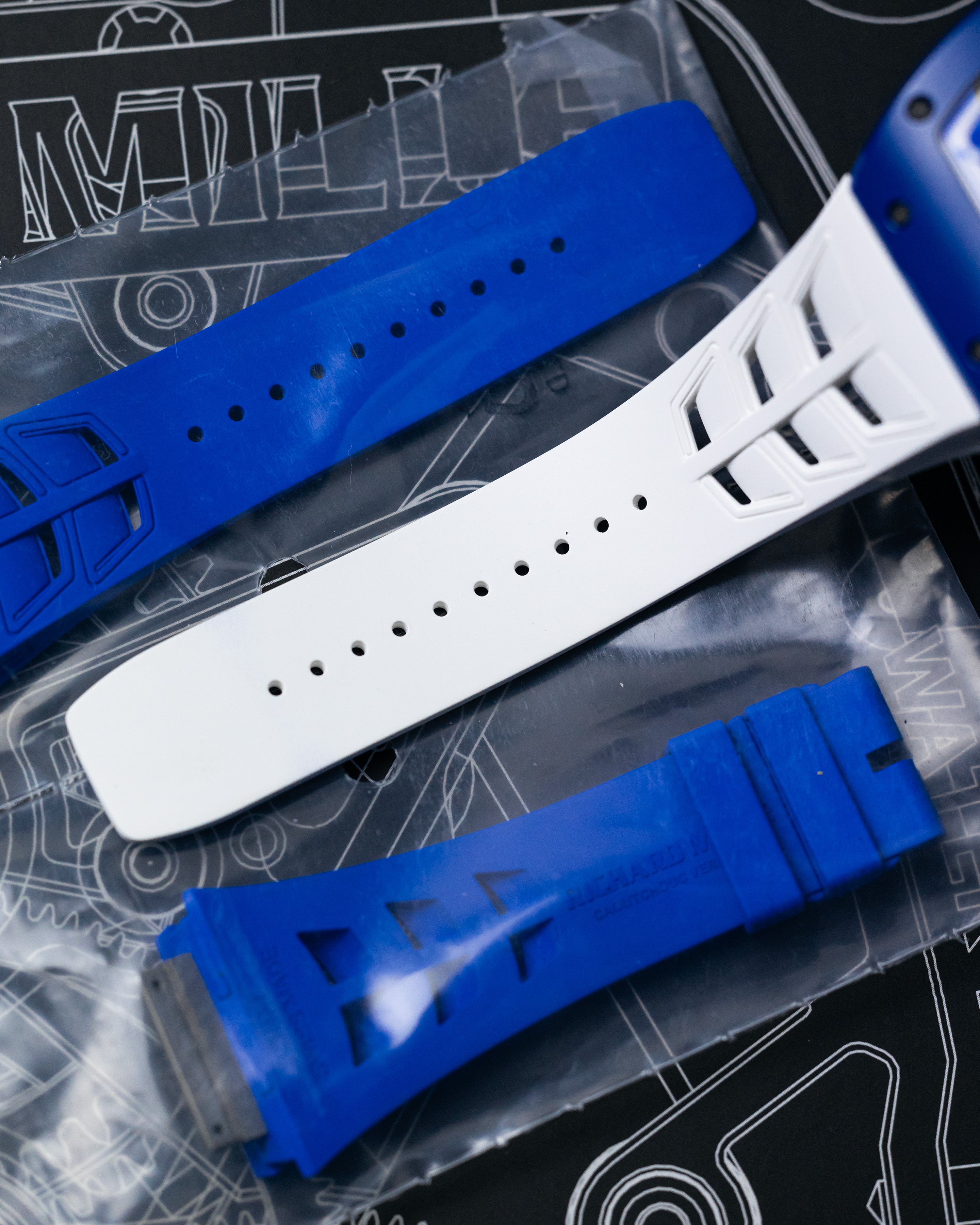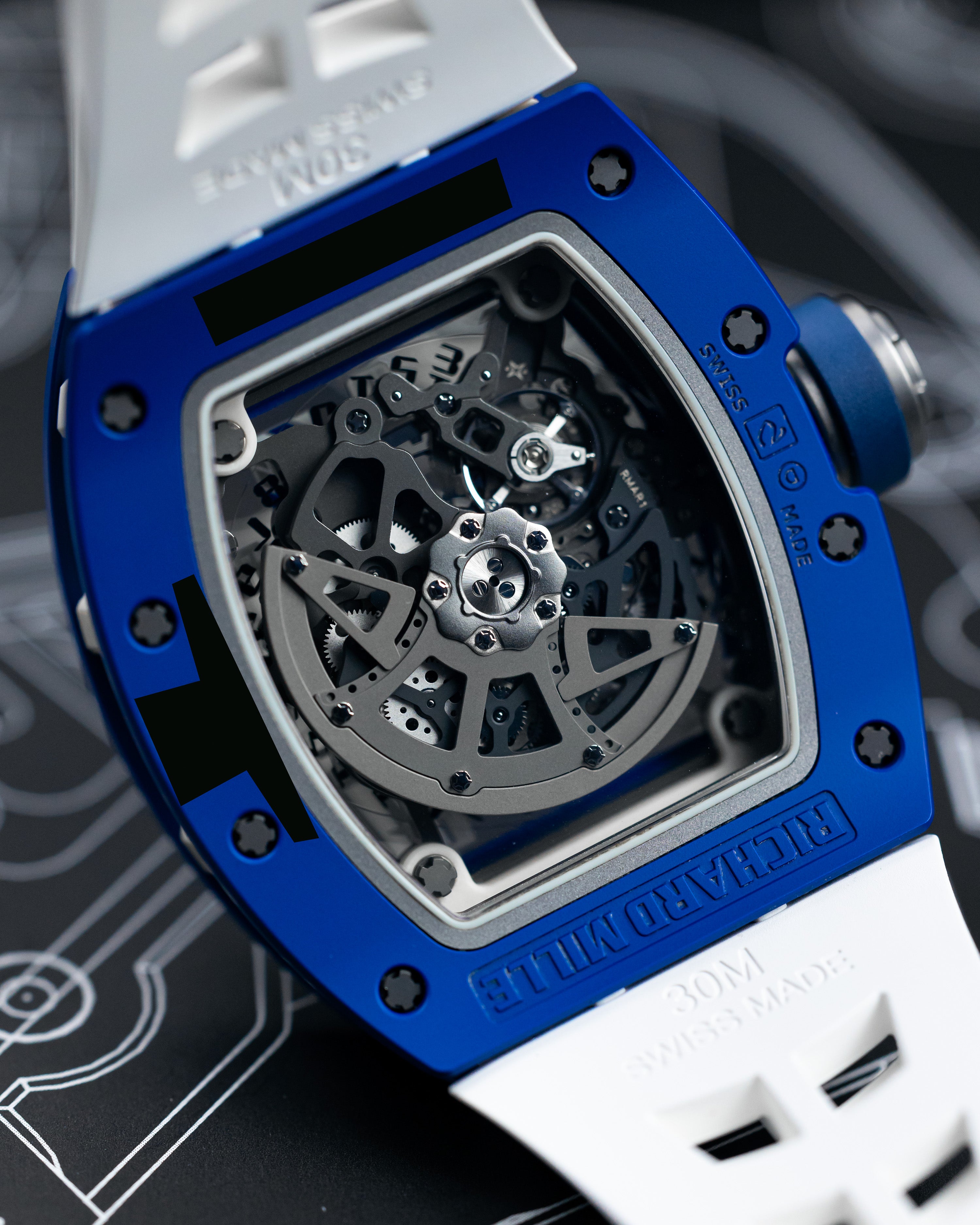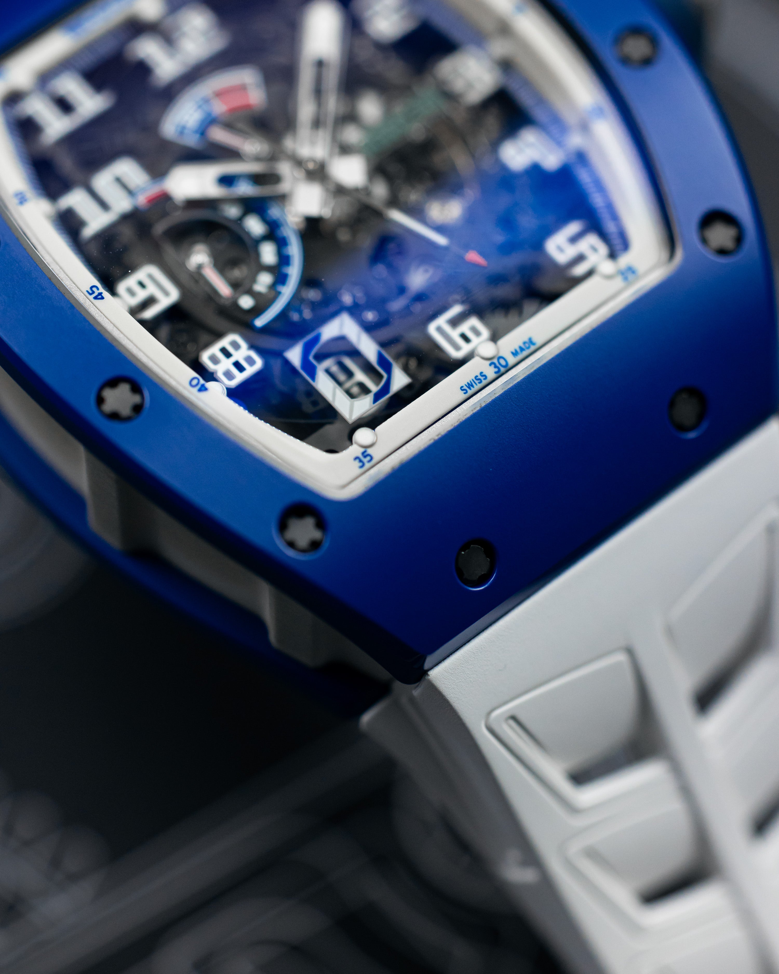 The case is made from highly scratch-resistant blue ceramic, featuring a white quartz TPT case band. Through the sapphire crystal on both the front and back, the skeletonized RMAR1 movement is on full display. Along with indicating the hours, minutes, central seconds, and power reserve, a standout feature of this movement is its de-clutching rotor, a mechanism engineered to prevent the overwinding of the two barrels.