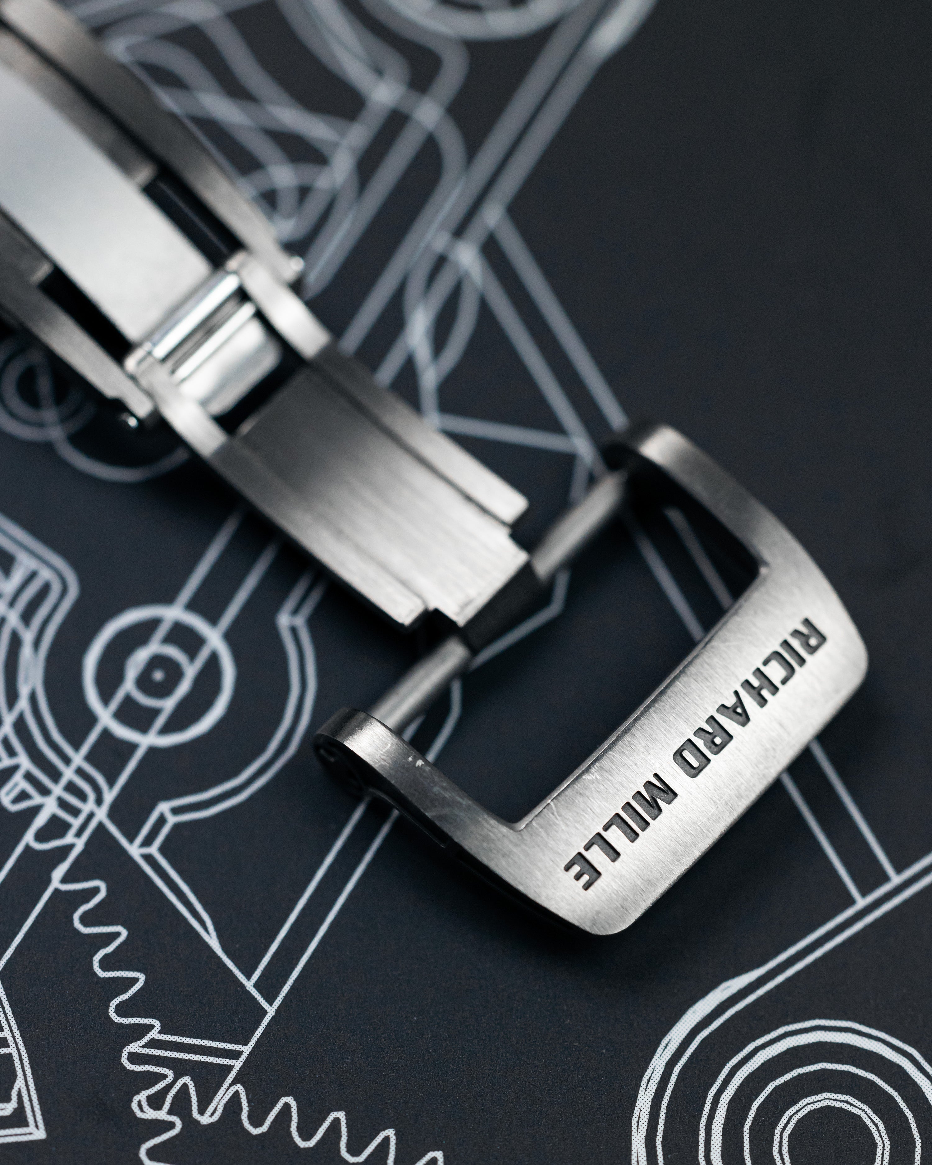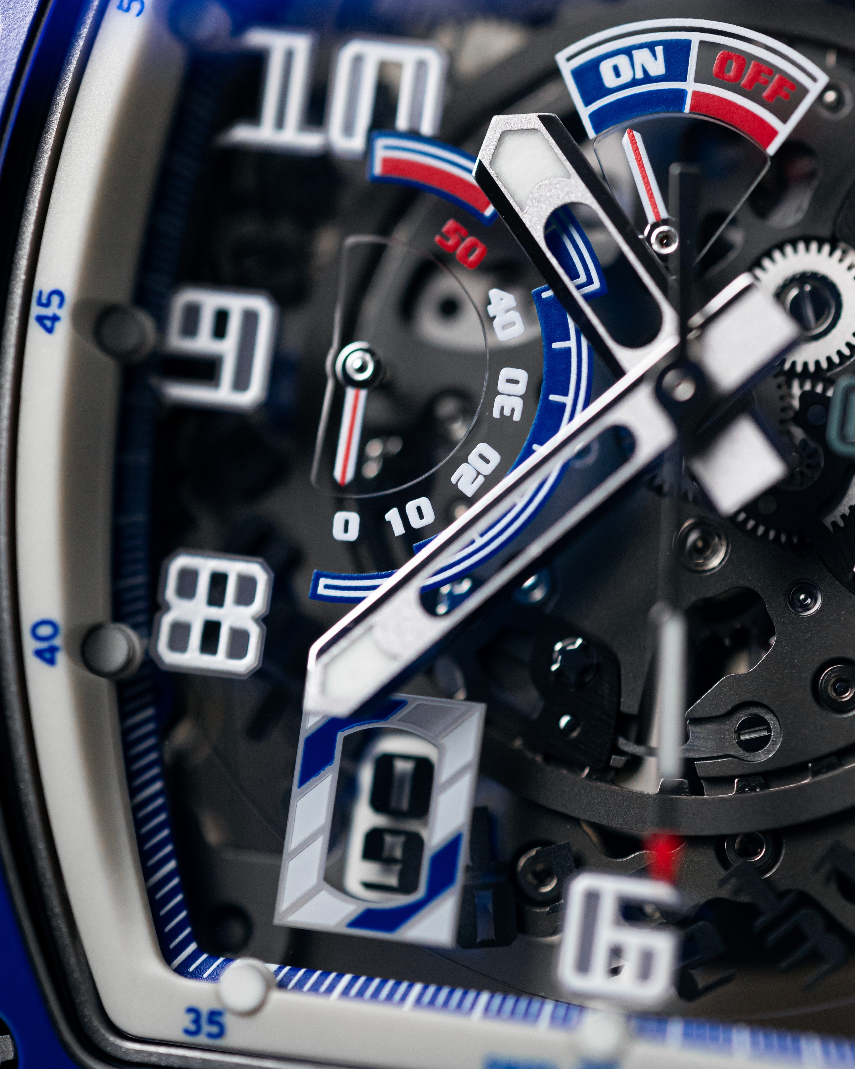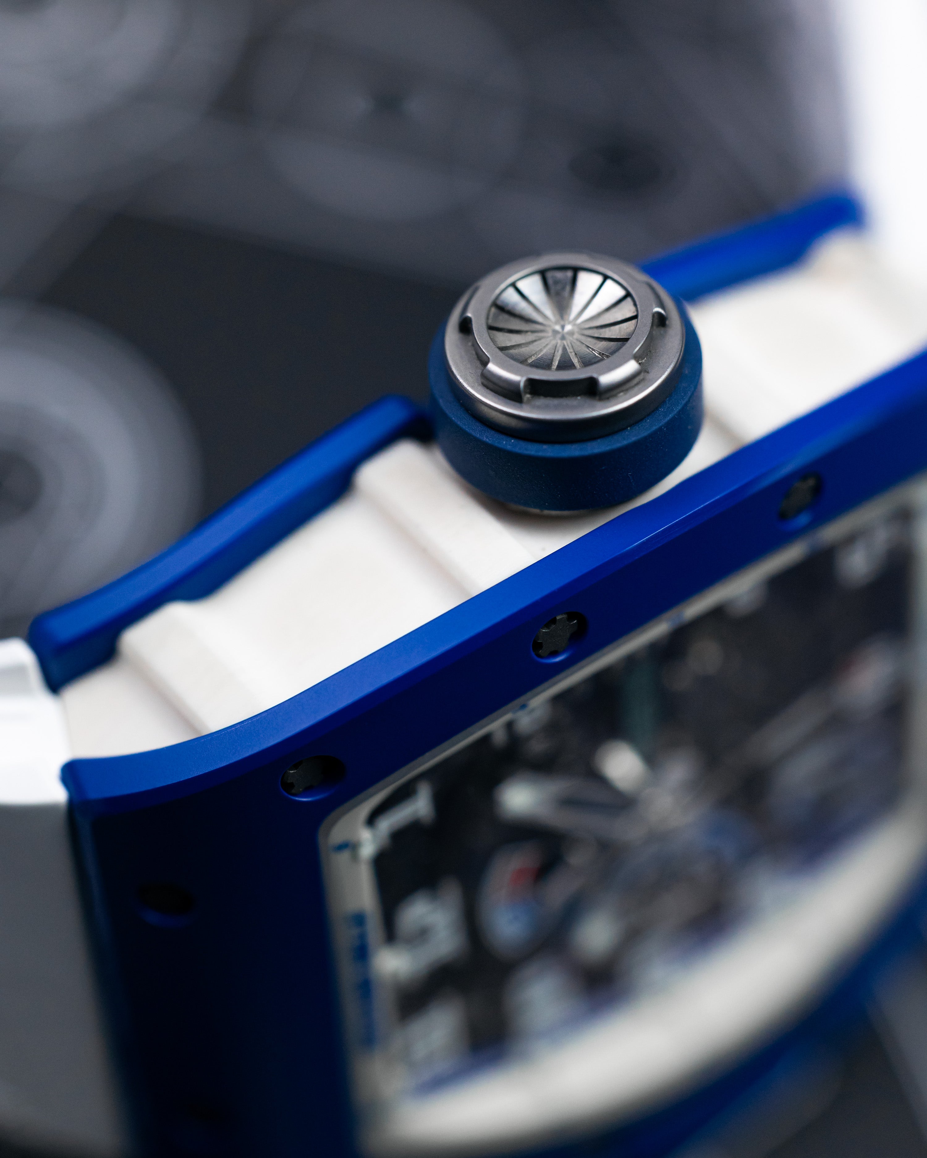 The case is made from highly scratch-resistant blue ceramic, featuring a white quartz TPT case band. Through the sapphire crystal on both the front and back, the skeletonized RMAR1 movement is on full display. Along with indicating the hours, minutes, central seconds, and power reserve, a standout feature of this movement is its de-clutching rotor, a mechanism engineered to prevent the overwinding of the two barrels.
