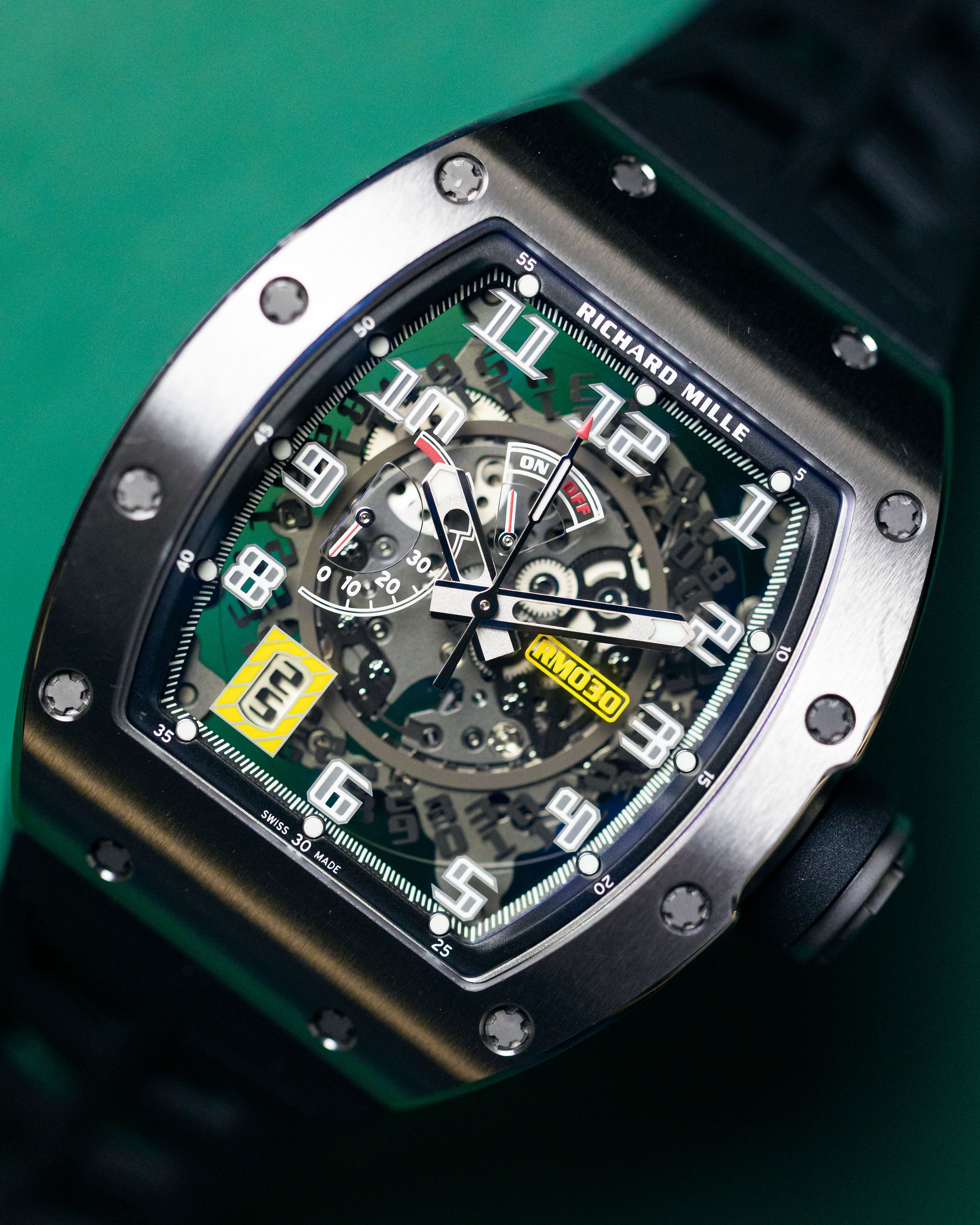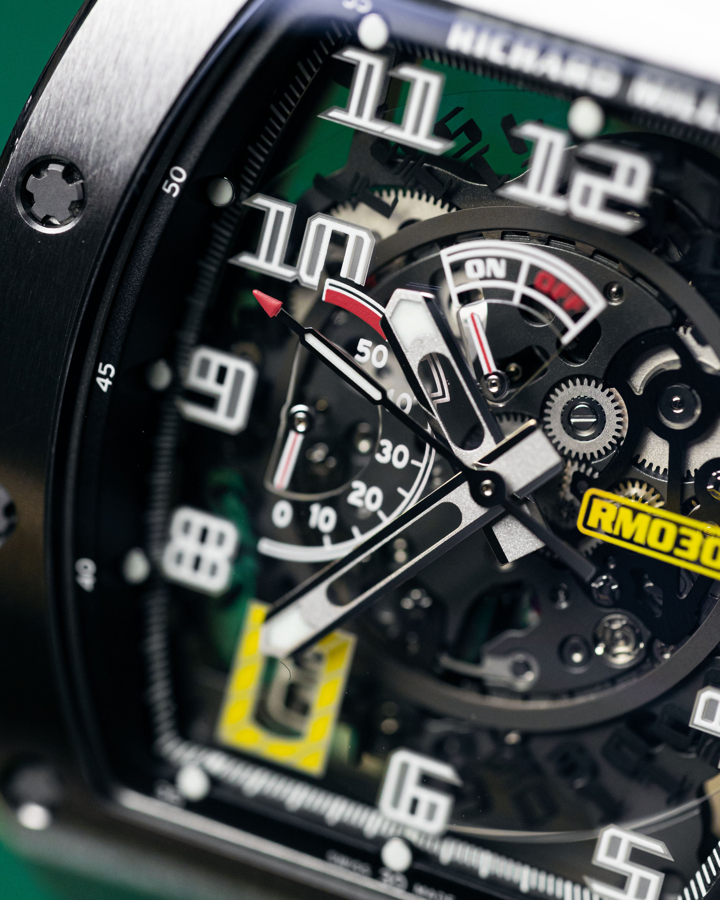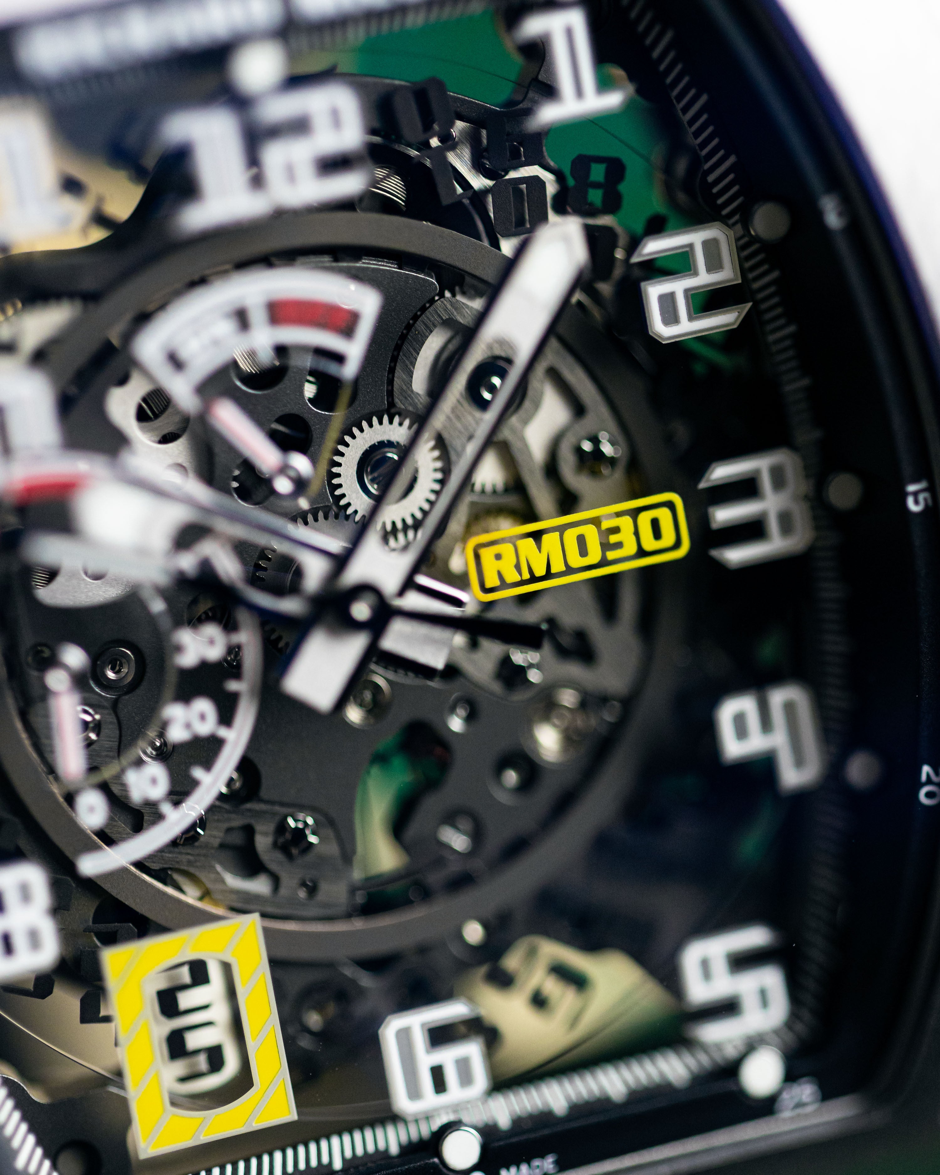 The RM030 features a skeletonised movement with power reserve and a clutch that is able to disengage the rotor when the movement is fully wound.