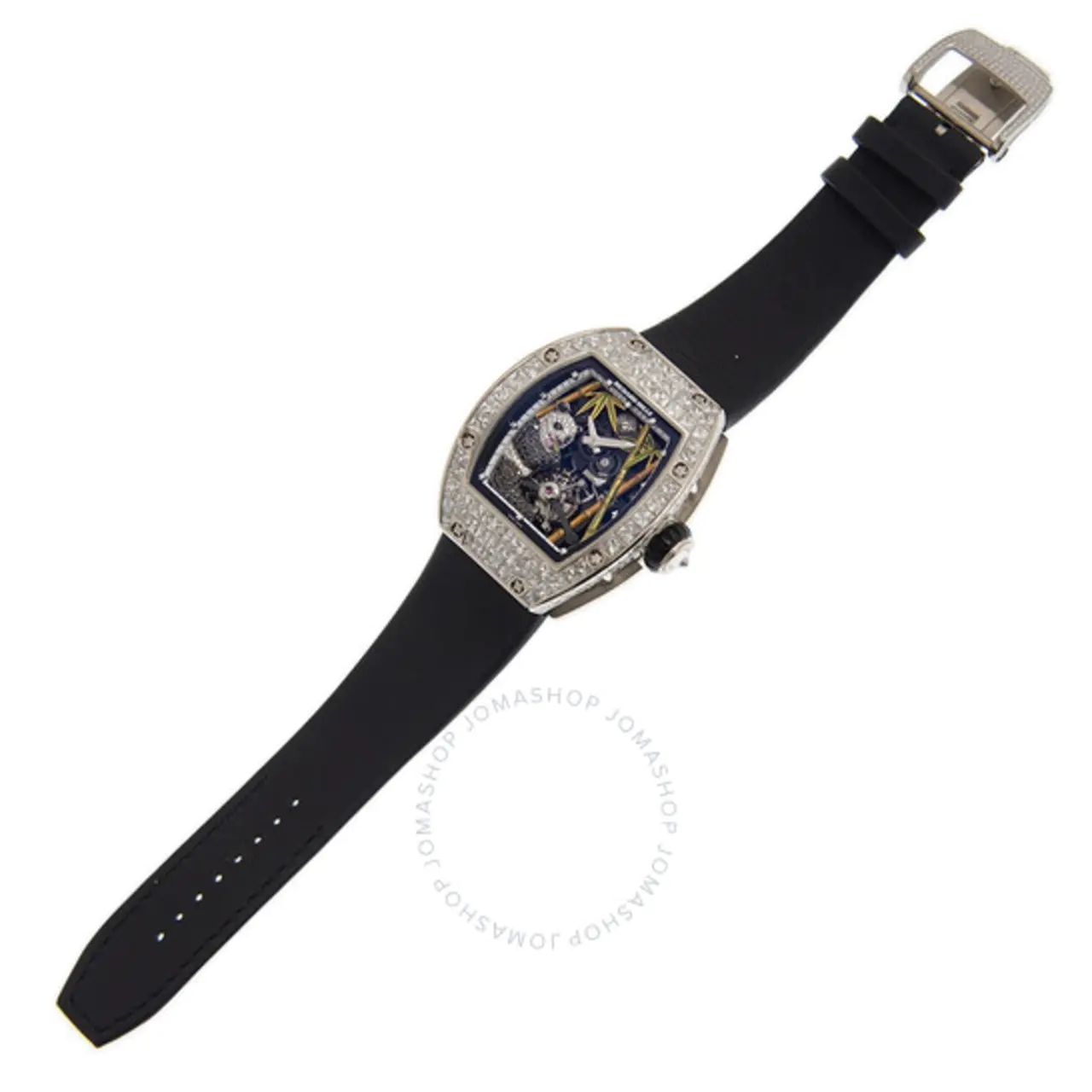 Diamond set 18kt white gold case with a black leather strap. Fixed 18kt white gold diamond set bezel. Blue dial with silver-tone hands and diamonds hour markers. Dial Type: Analog. Two - tourbillon, power reserve indicator subdials. Richard Mille Calibre RM26-01 manual wind movement. Scratch resistant sapphire crystal. Transparent case back. Tonneau case shape, case size: 45x39.7mm, case thickness: 15.14mm. Deployment clasp. Water resistant at 50 meters / 165 feet. Functions: hour, minute, tourbillon. Luxury watch style. Watch label: Swiss Made. Richard Mille Diamond Tourbillon Panda Men's Watch RM26-01.