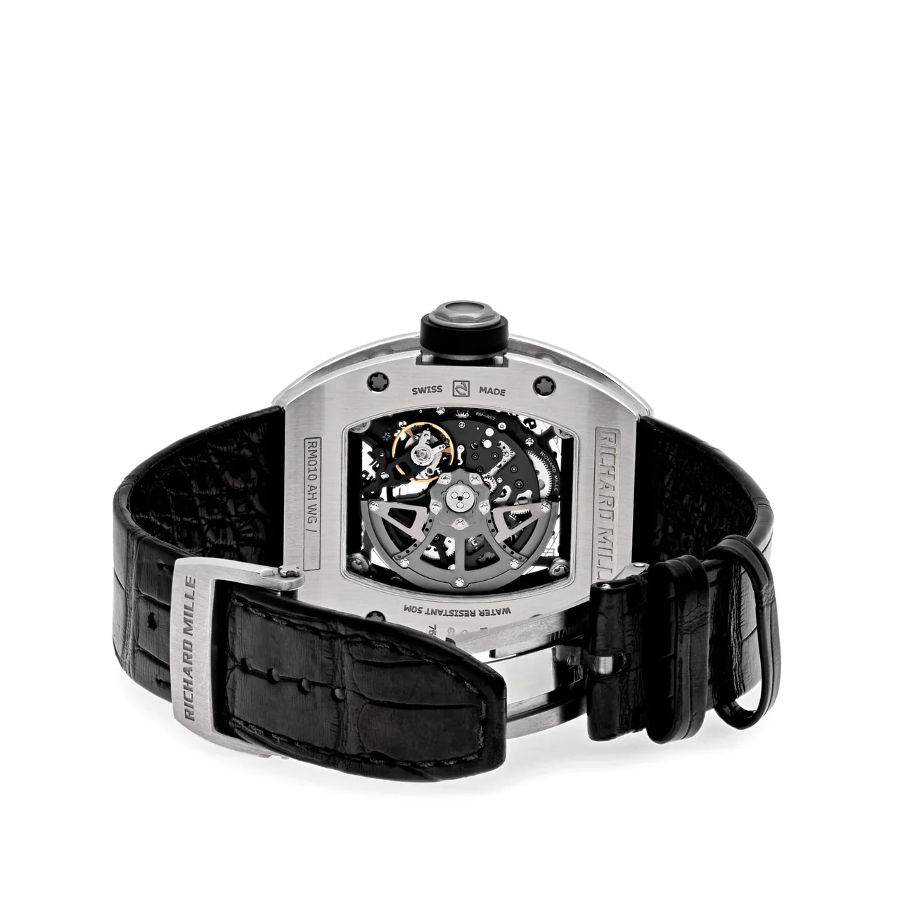 The Richard Mille RM010 is a stunning example of horological artistry and technical innovation. Encased in a 48mm x 39mm 18k white gold case set with diamonds, this timepiece exudes luxury and sophistication. The exhibition case back provides a captivating view of the automatic movement, allowing enthusiasts to admire the intricate craftsmanship.