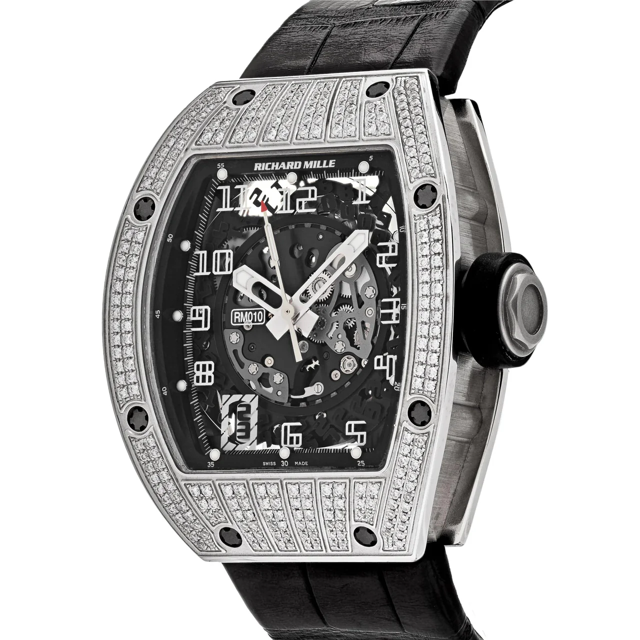 Richard Mille's RM 010 is an all-time classic and instantly recognized by watch connoisseurs for its handsome tonneau-shaped case and skeletonized movement. The 48mm x 39mm 18k white gold diamond set case is equipped with an exhibition back case. Beneath the sapphire-crystal glass inlays a skeletonized dial with white luminescent hands and Arabic markers. It is completed with a black leather strap and a double-fold clasp.
