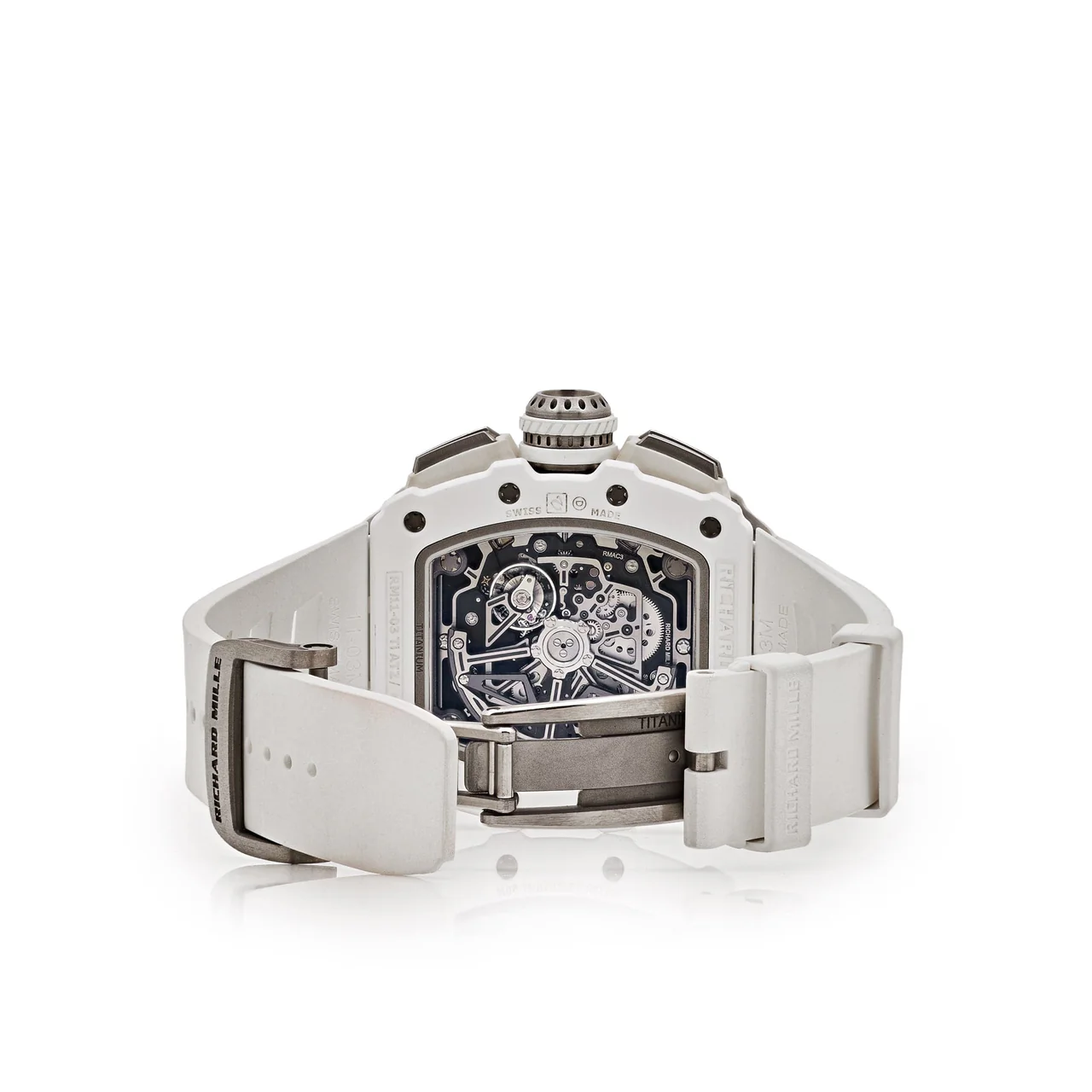 Encased in a robust 50mm white ceramic and titanium case, the RM 11-03 exudes strength and elegance. The white ceramic offers exceptional durability, while the titanium provides a lightweight feel, ensuring comfort on the wrist. The case is styled with a white rubber strap, embodying the brand's signature racing aesthetic and adding a touch of rugged sophistication.