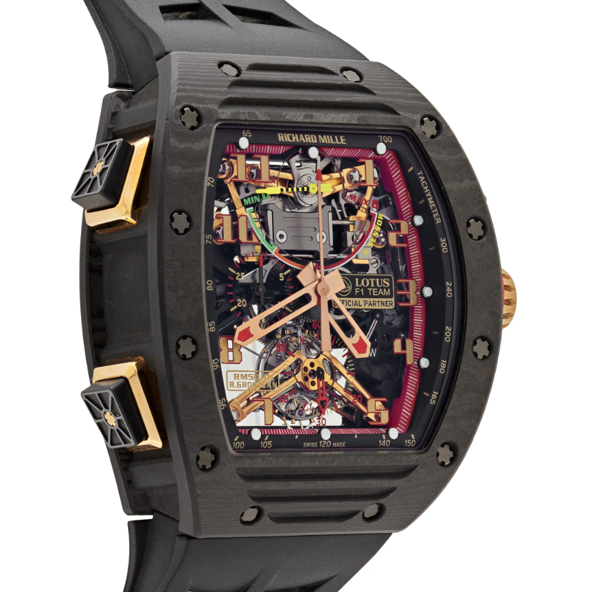 The Richard Mille RM 50-01 Romain Grosjean was created in partnership with the Lotus F1 team. An impressive watch – the robust 50mm Carbon-NTPT case and classic skeleton dial feature G-Sensor Tourbillon technology. This timepiece is designed for supreme accuracy and resilience – on and off the race track.