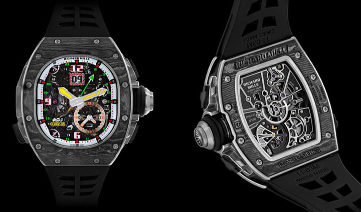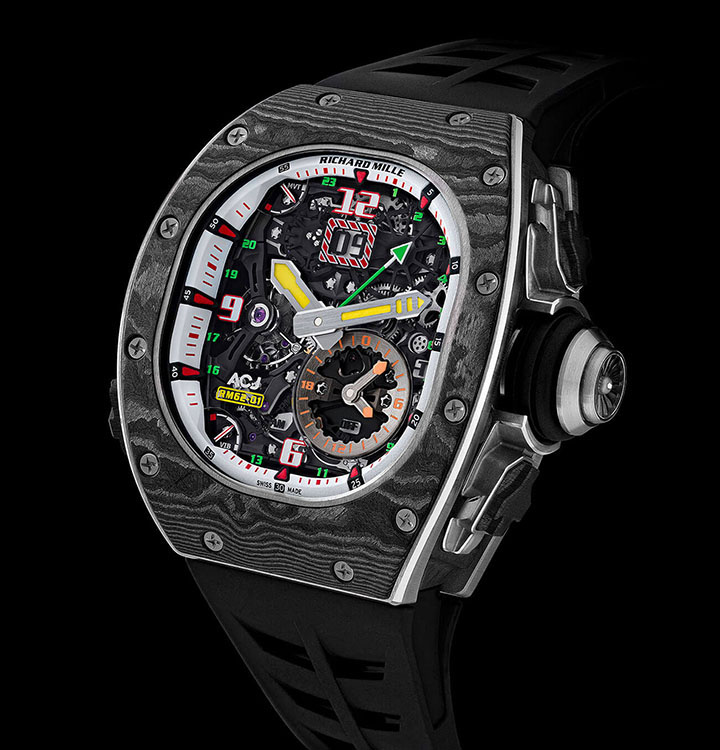 The caseback and bezel are comprised of a first bezel in polished and satin-finished grade 5 titanium, to which is affixed a second bezel, just 1.80 mm in thickness, machined from Carbon TPT®. This high-tech material is made up of 600 layers of parallel filaments obtained by separating out carbon fibres. The layers, no more than 30 microns thick, are impregnated with a black resin. They are then assembled on a dedicated machine, which stacks the layers, varying the orientation of the fibres by 45° between layers. The composite is then hardened heated to 120°C at a pressure of 6 bars in a kiln similar to that used for the production of aeronautics parts, after which it is ready to be machined at Richard Mille. During this phase, the many layers of Carbon TPT® are revealed, creating random damascene patterns that make each piece unique.