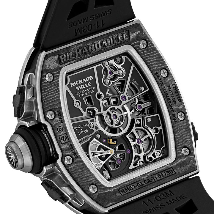 The RM 62-01 exemplifies the entire Richard Mille philosophy: taking functionality and performance to new limits. From its complexity, to its complications, to its ergonomics, this piece constitutes a total work of haute horlogerie.