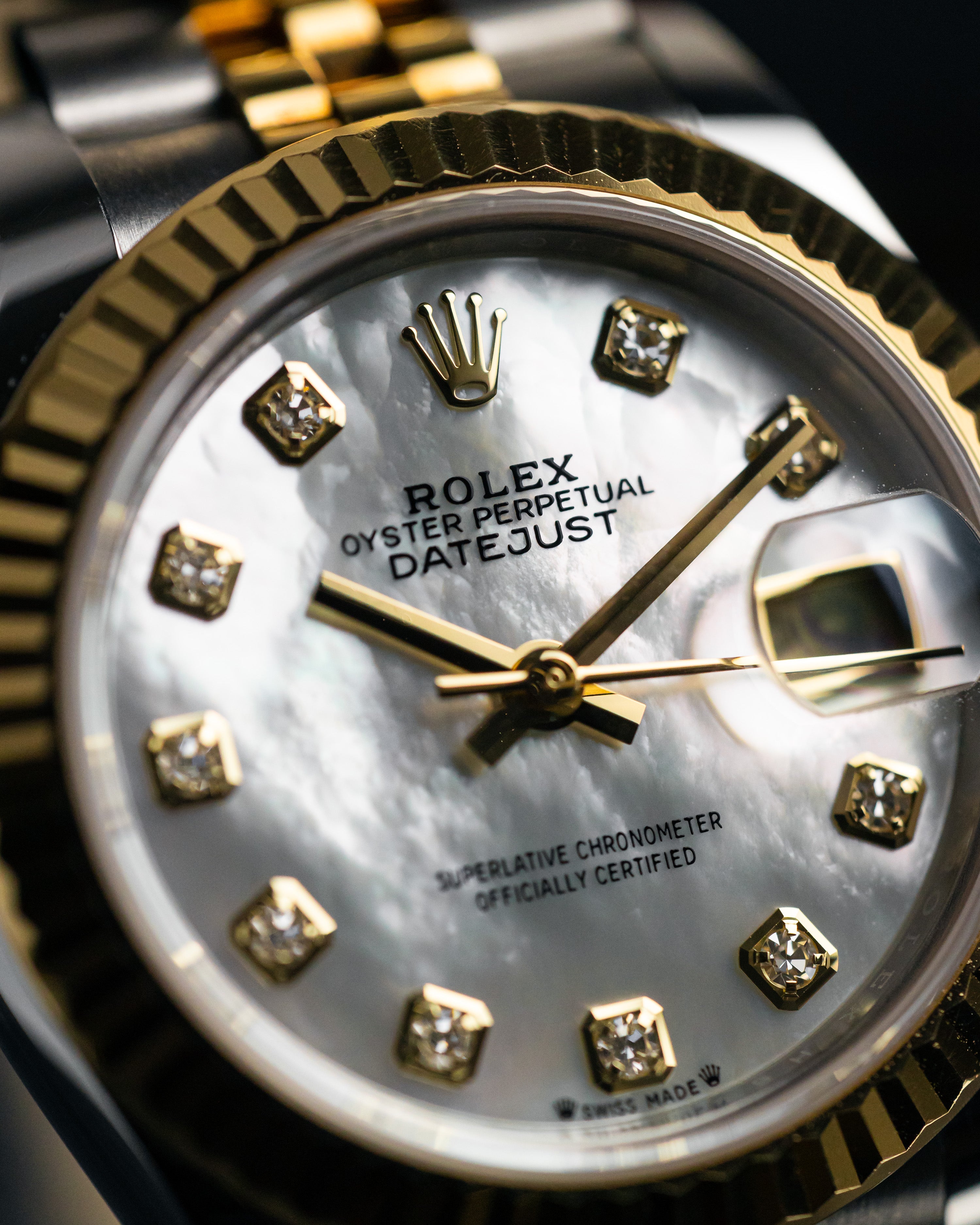 The unique Mother of Pearl dial set with diamonds along with the steel and yellow gold combination is stunning!