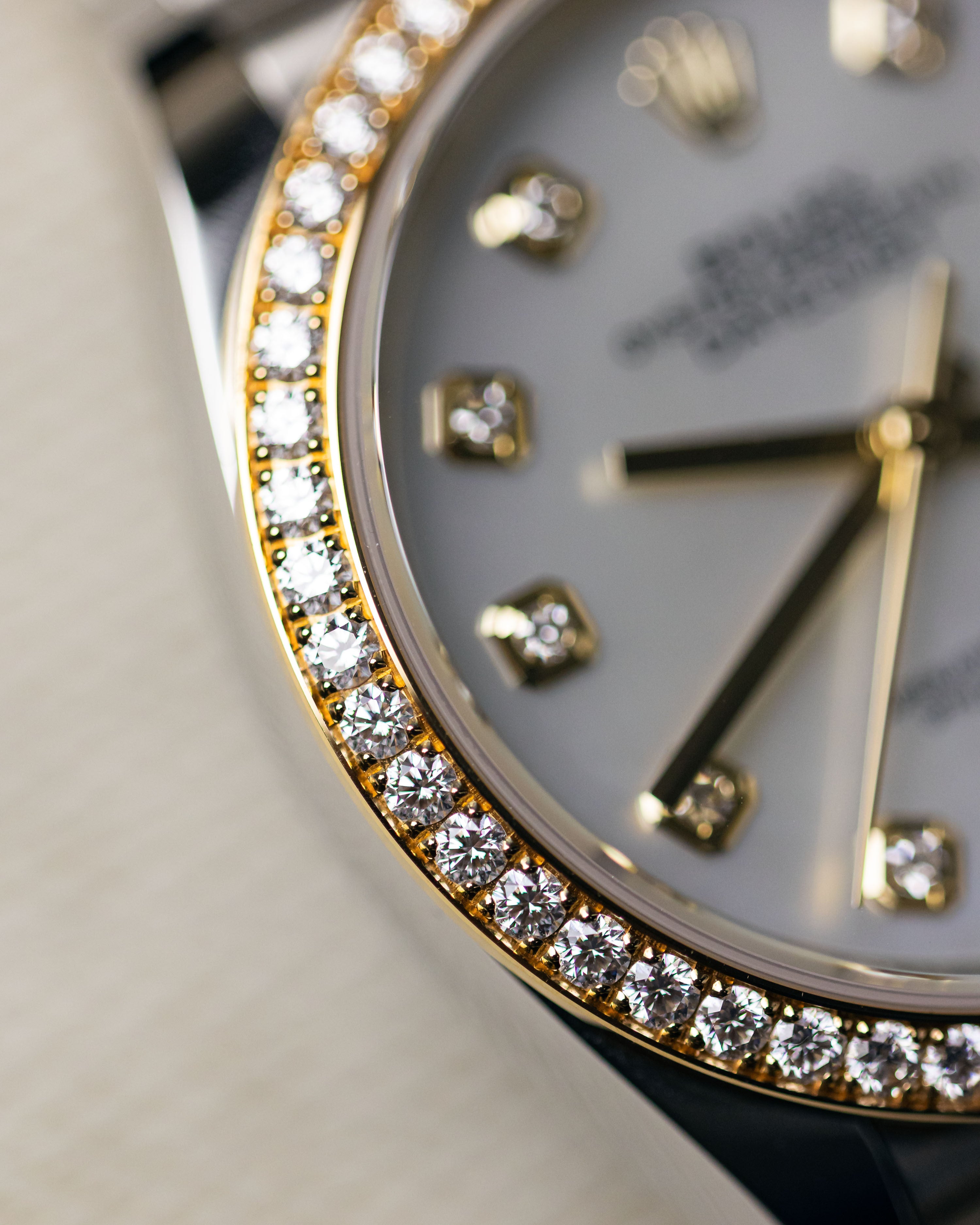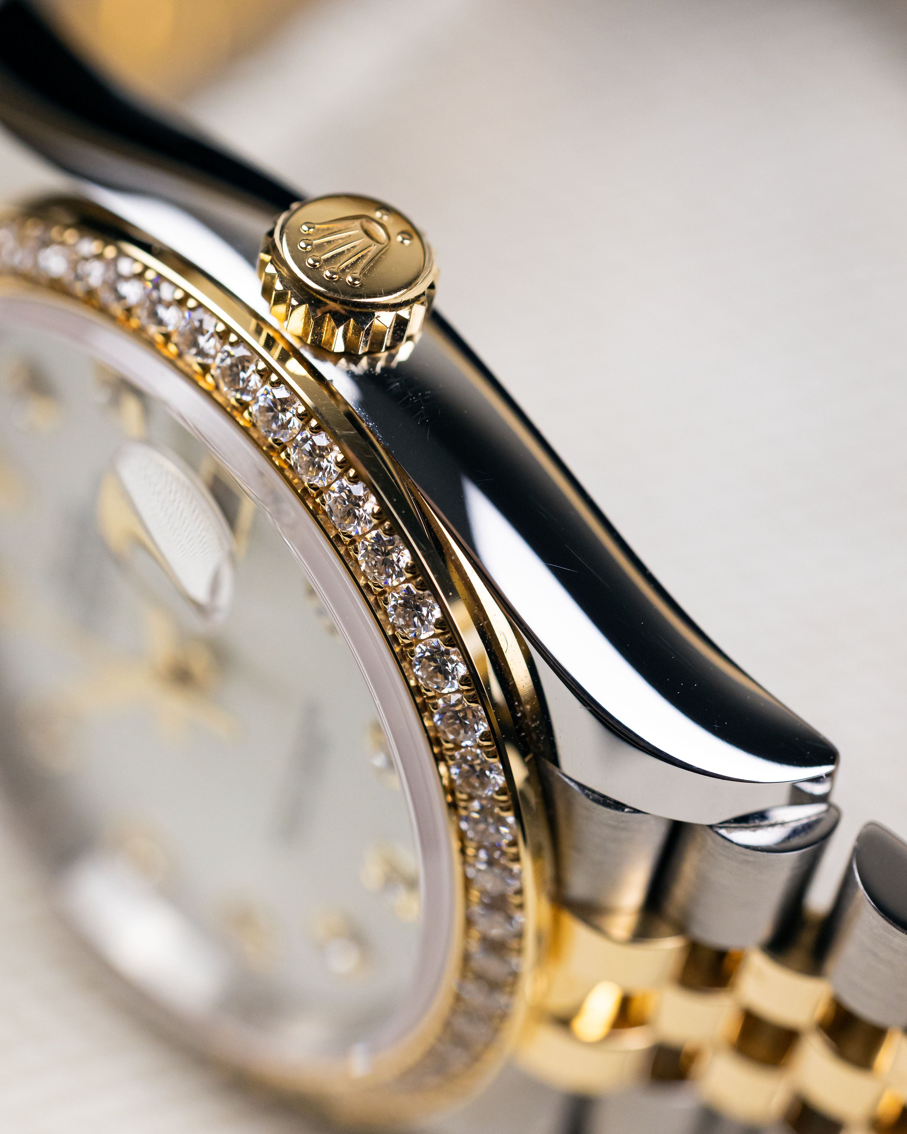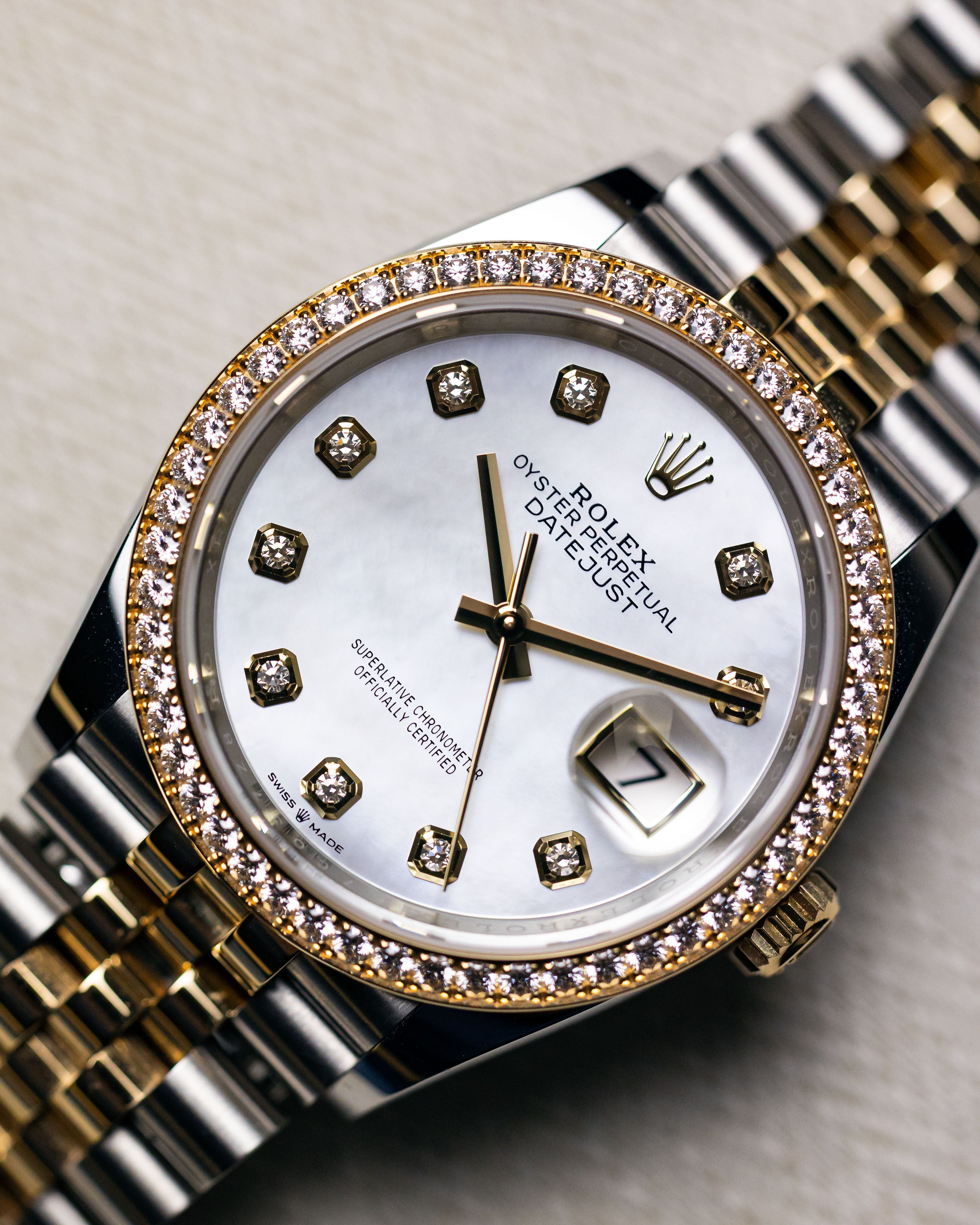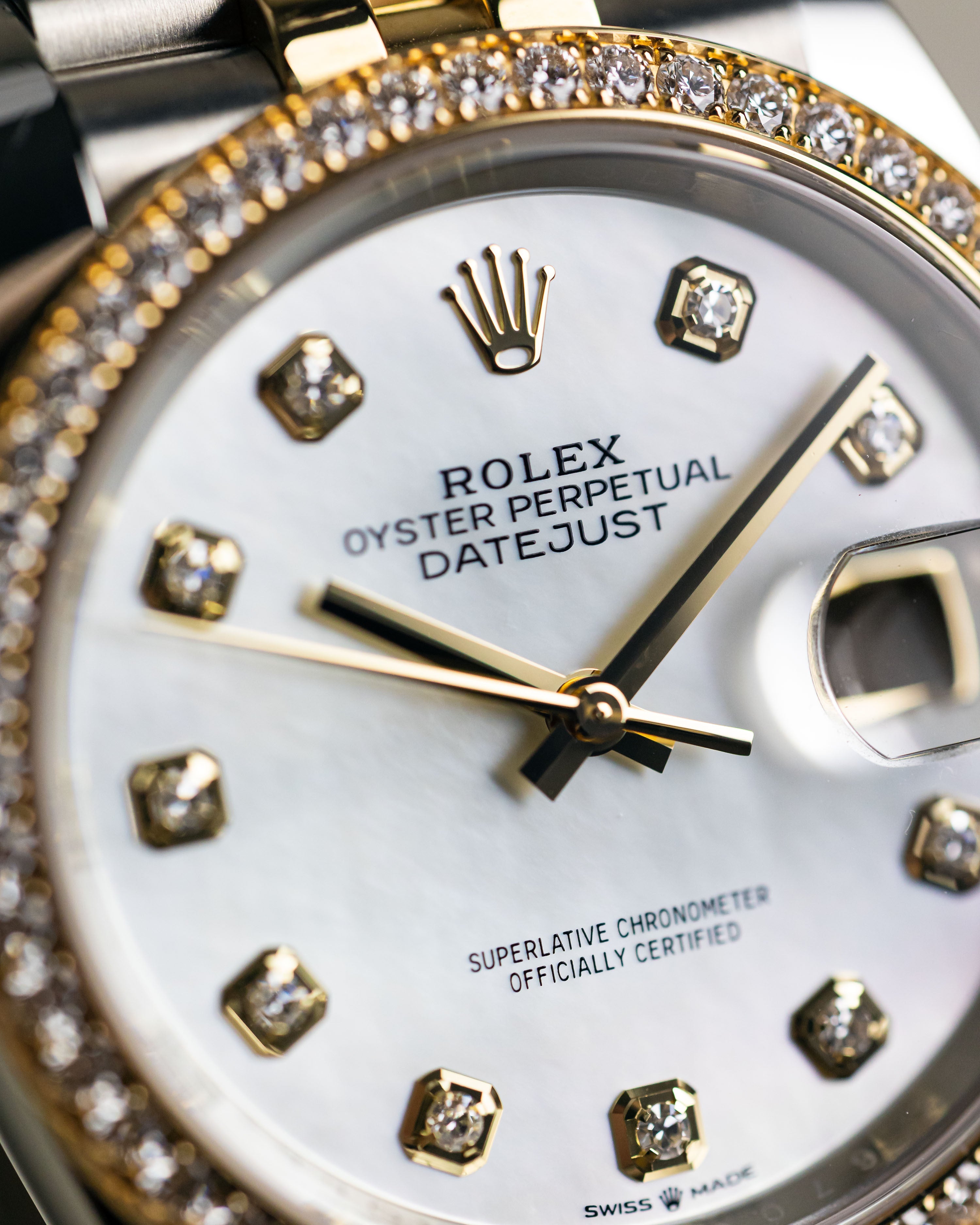 A rare factory diamond set bezel with mother of pearl dial and diamond hour markers. This is one of the most desirable and stunning datejust models.