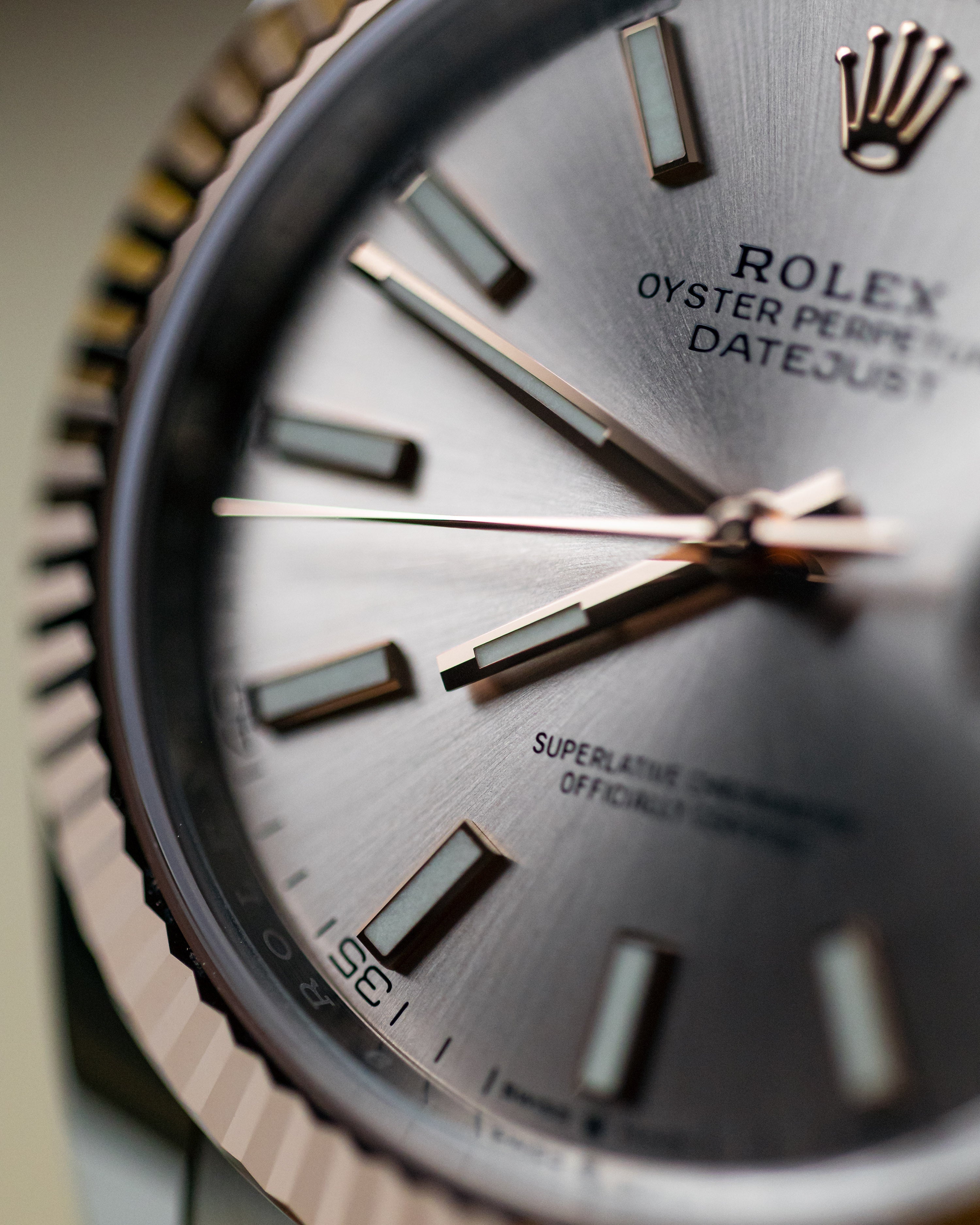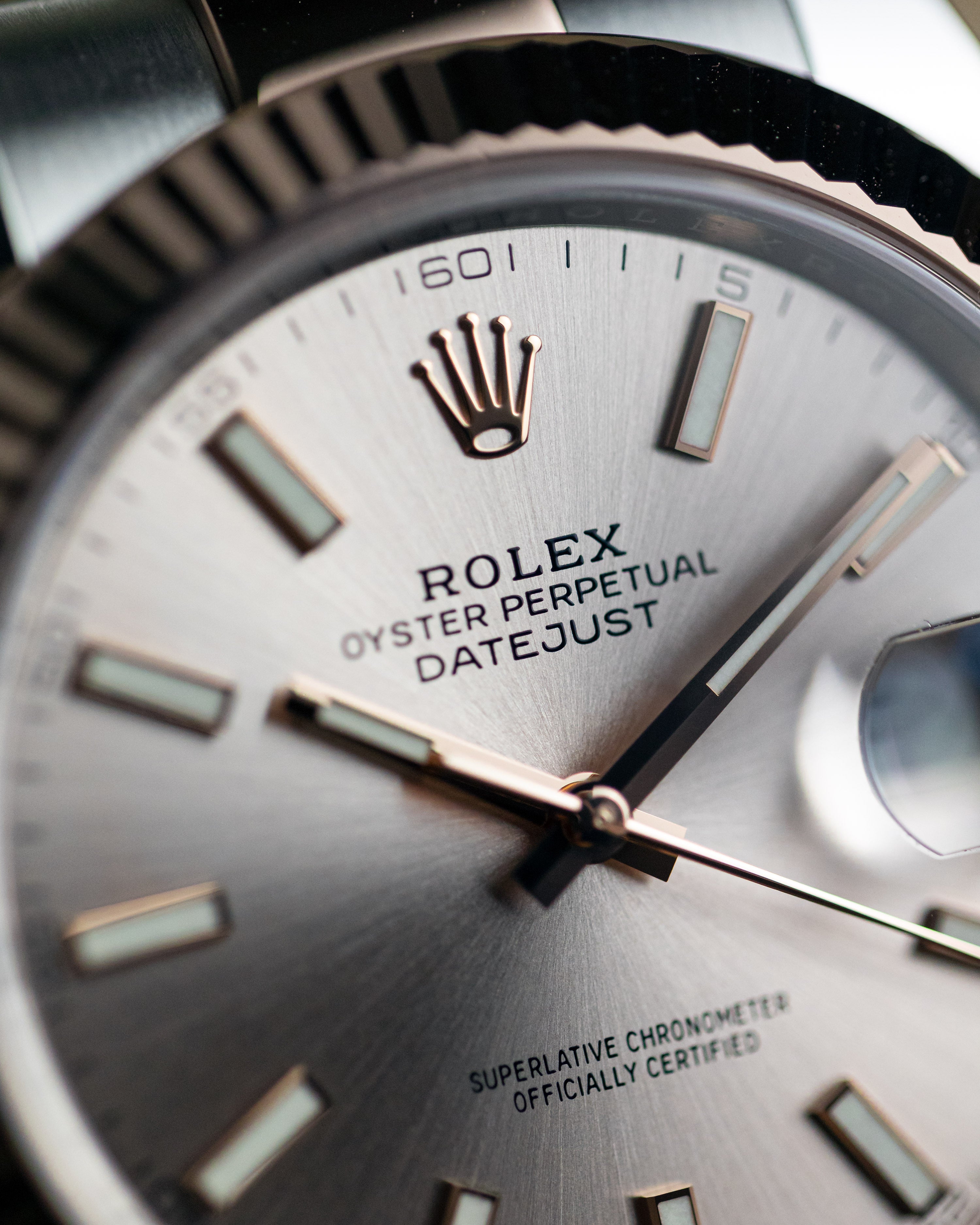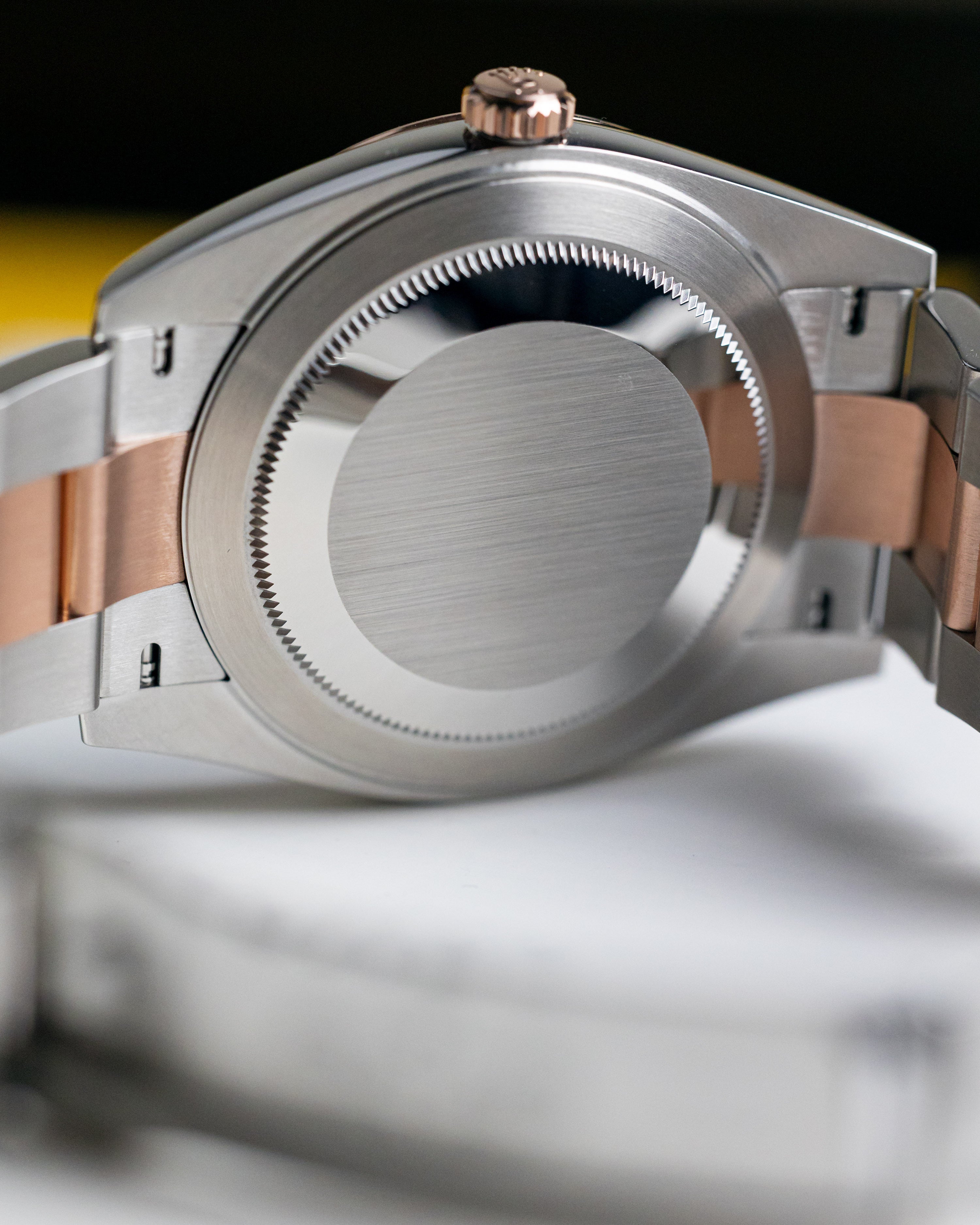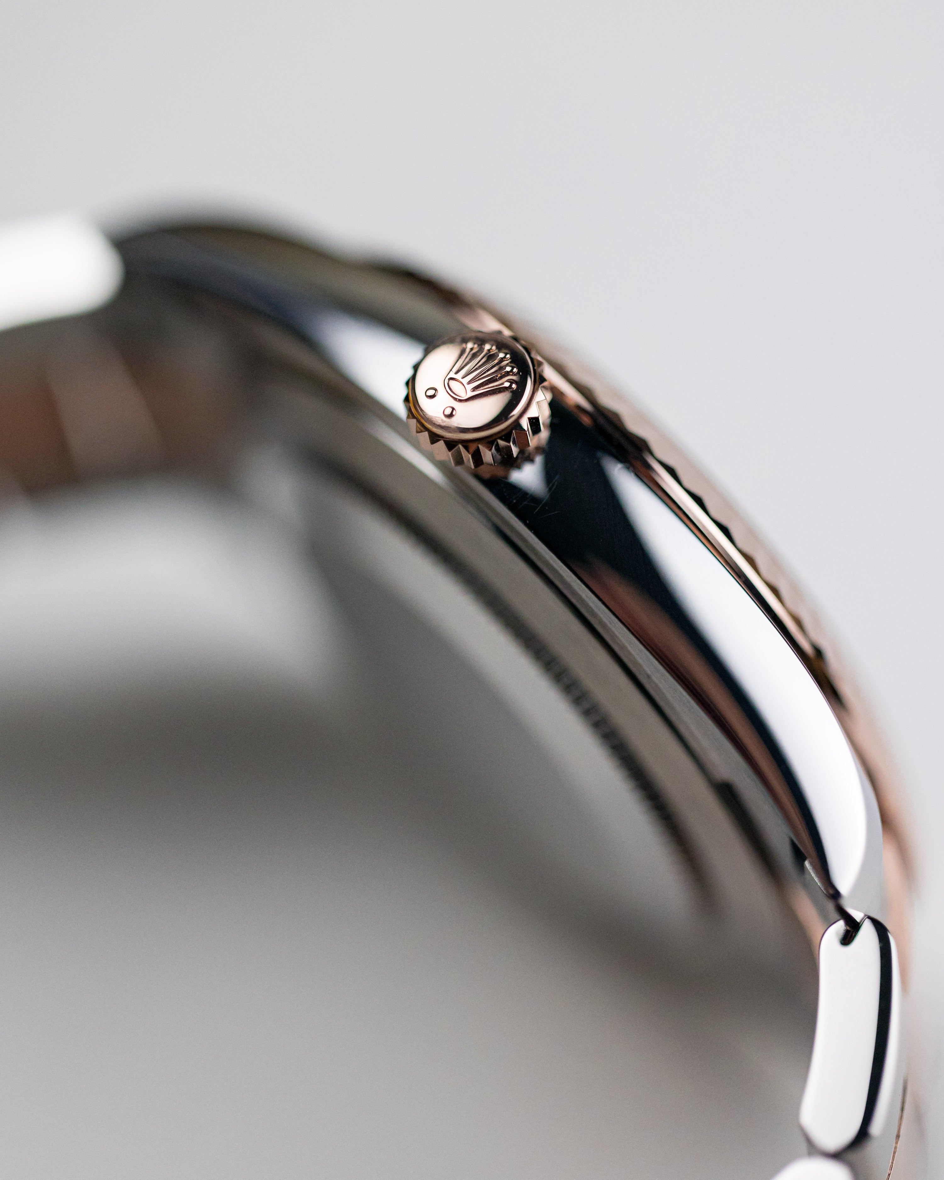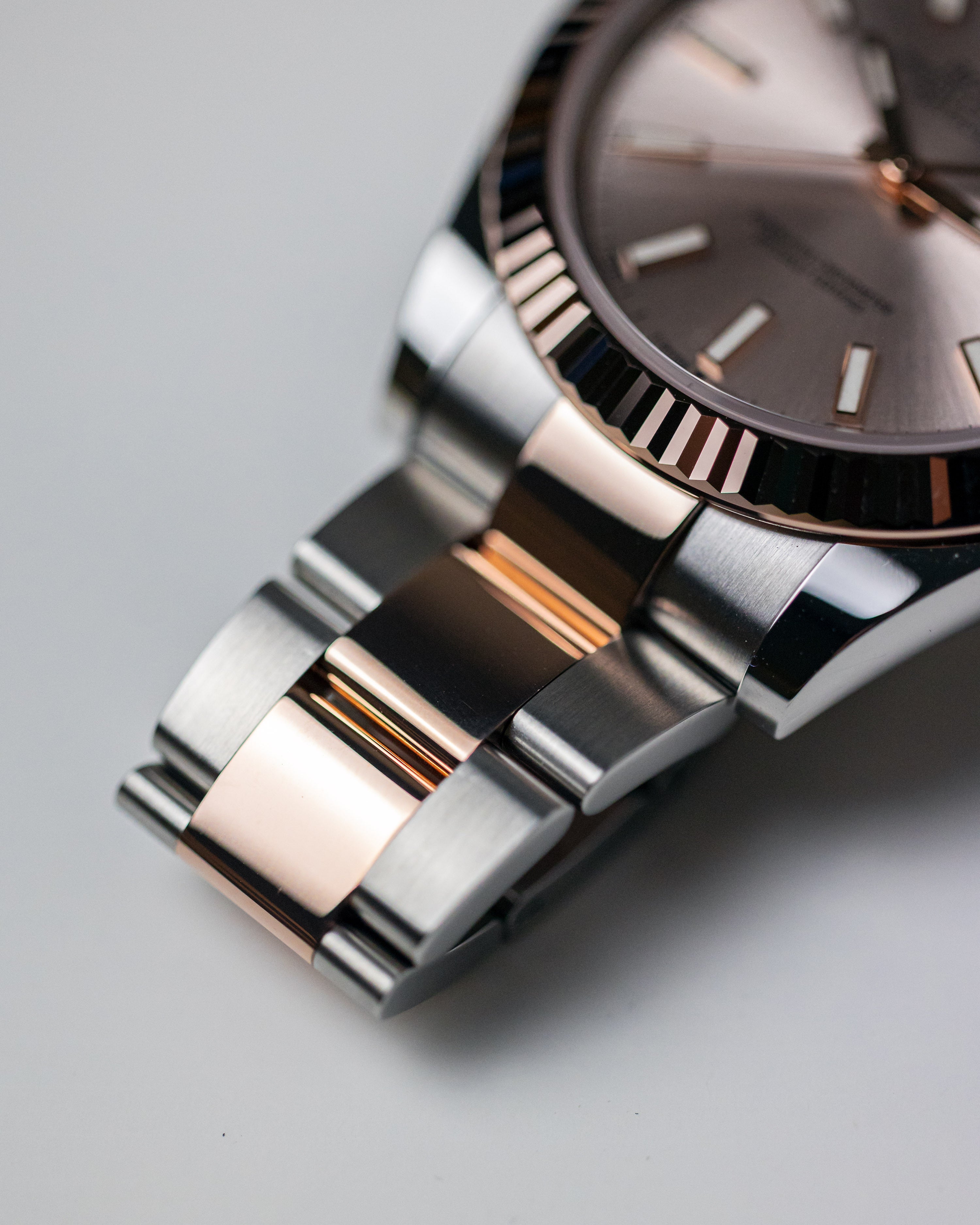 A classic combination of rose gold/steel with a complimentary sundust dial. This example features a masculine oyster bracelet with fluted bezel.