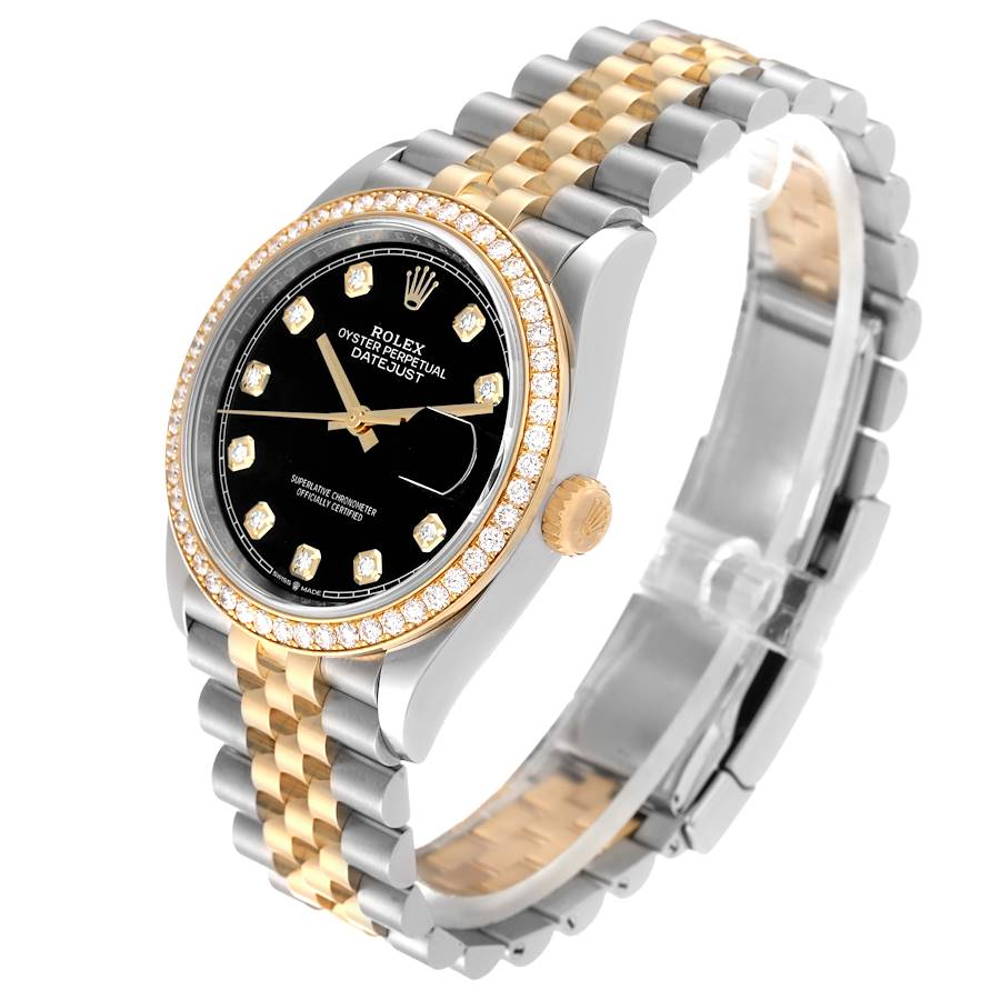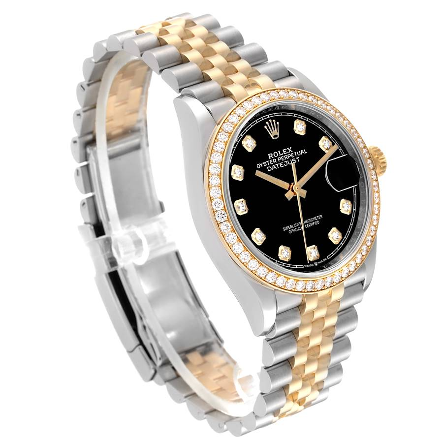 Rolex Perpetual Datejust 36 Watch, Oystersteel, and 18 ct yellow gold. Black dial set with diamonds. Hour markers - Diamonds in 18k gold settings. Bezel set with diamonds. Jubilee Bracelet, 126283rbr-0007.