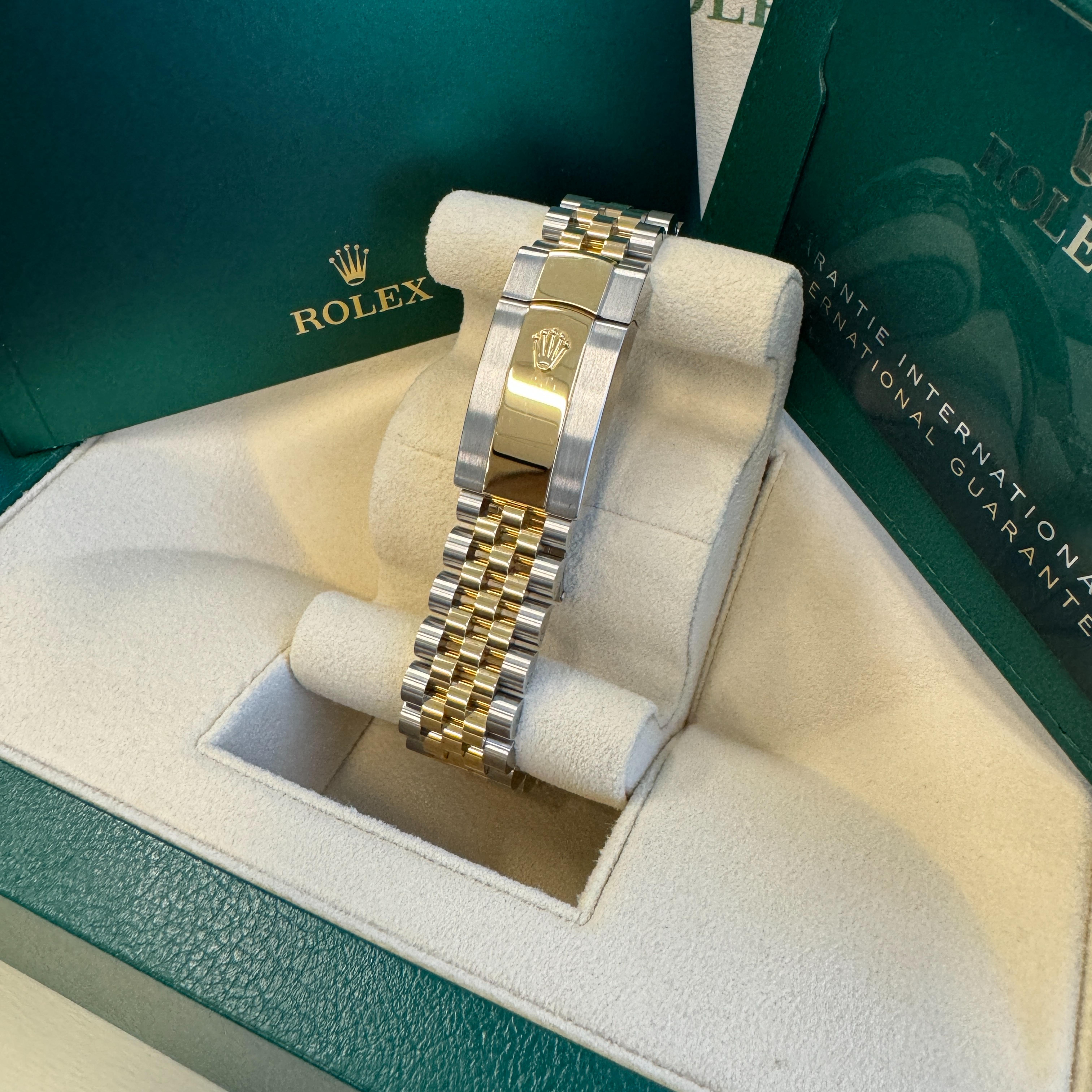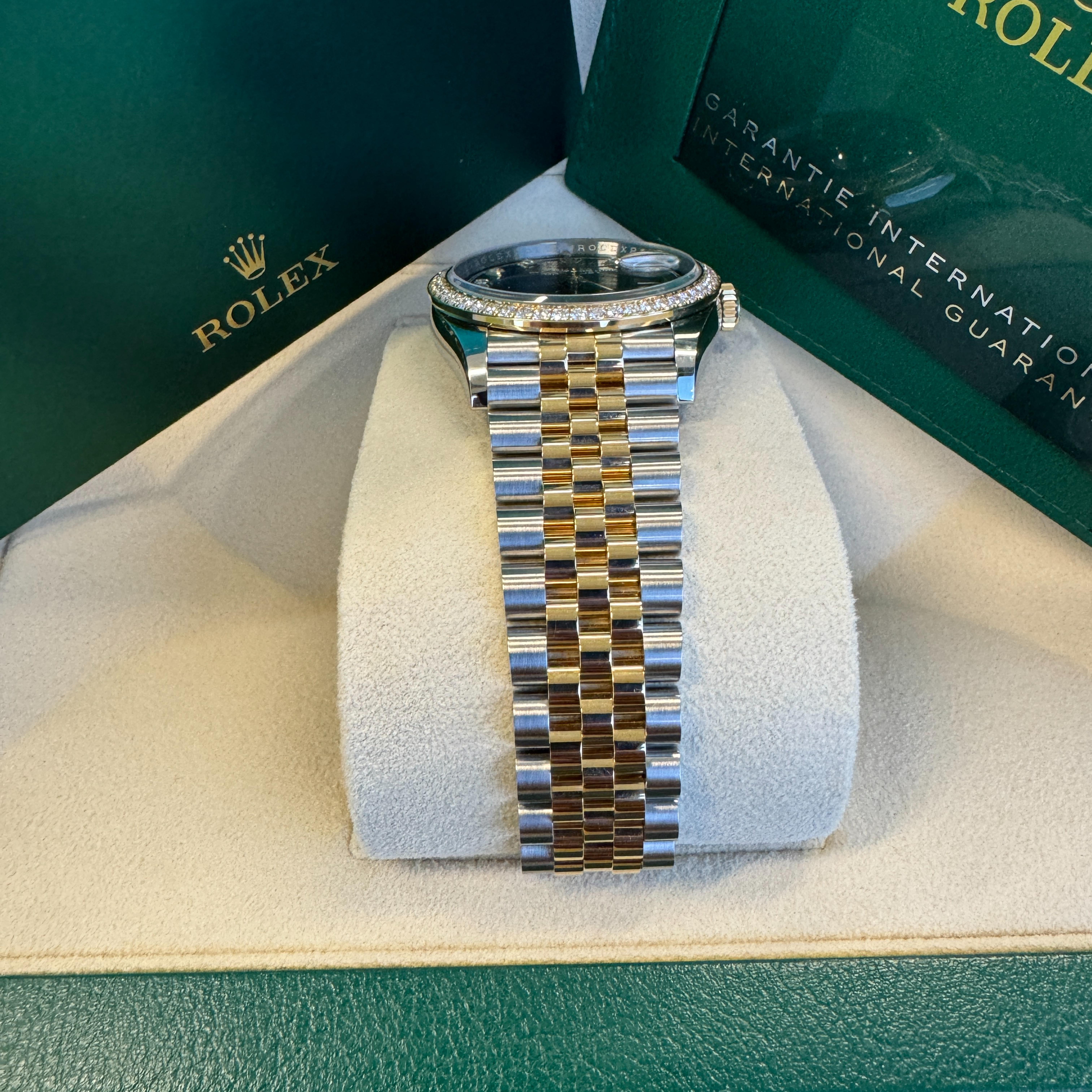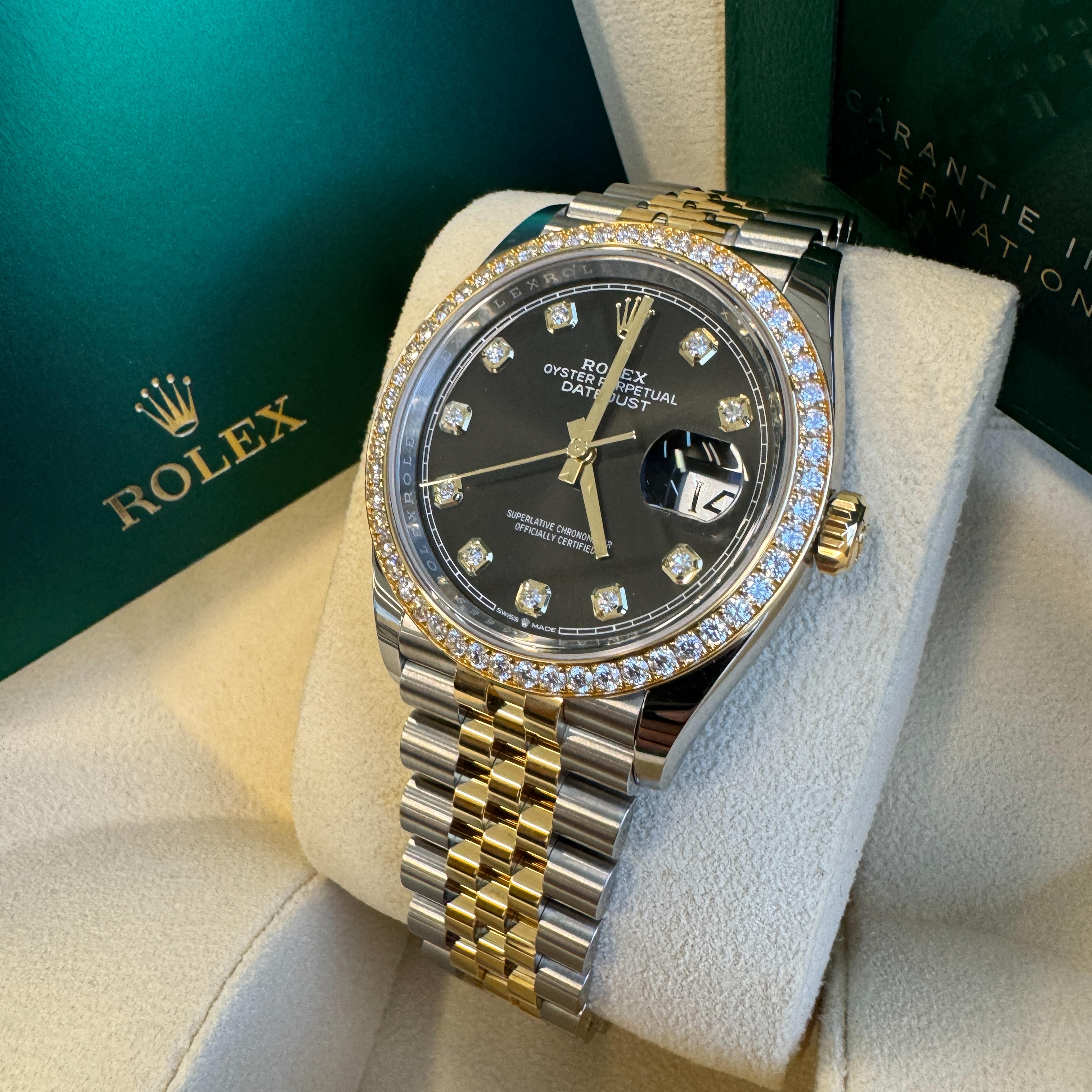 Rolex Datejust 36, Oystersteel and 18k yellow gold. Black dial set with diamonds. The Hour markers - Diamonds in 18k gold settings. Bezel set with diamonds. The Watch comes with Mechanical Self-winding Movement & 3235 Calibre w/ 31 jewels & 70 hours power reserve. The Bracelet Jubilee is Yellow Rolesor 锟�C a combination of Oystersteel and 18k yellow gold. With Folding Oysterclasp with Easylink 5mm comfort extension link. The Waterproof is 100m/330 feet. The Watch is with a Rolex Watch box, Rolex Warranty Card. Covered with Rolex Warranty.