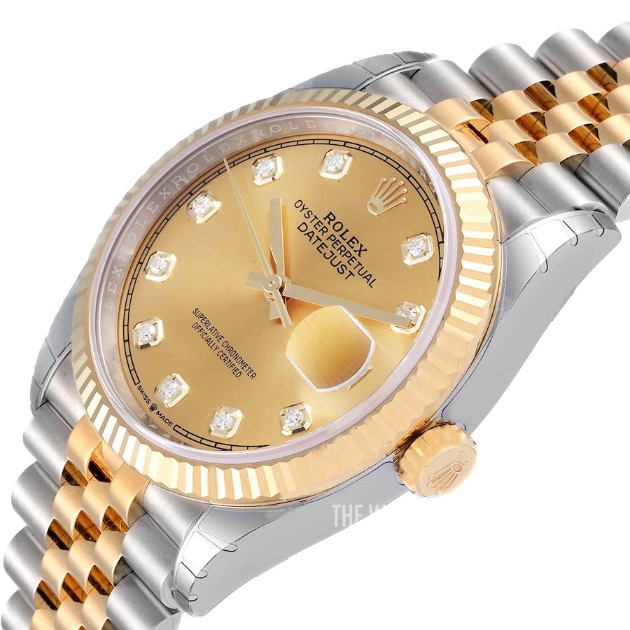 The Rolex Datejust 36mm M116233-0150 is an authentic Swiss-made Men's or Women's luxury watch which features a polished 904L Oystersteel stainless steel case with screw down crown and case back. The two tone polished solid 18k yellow gold with brushed 904L Oystersteel stainless steel jubilee bracelet has a concealed folding crownclasp deployment buckle. A champagne dial is adorned with 10 diamond hour markers and a date aperture at the 3 o'clock position encompassed in polished solid 18k yellow gold fluted bezel. This eye-catching watch is driven by Self-winding automatic movement and a 48 hour power reserve.