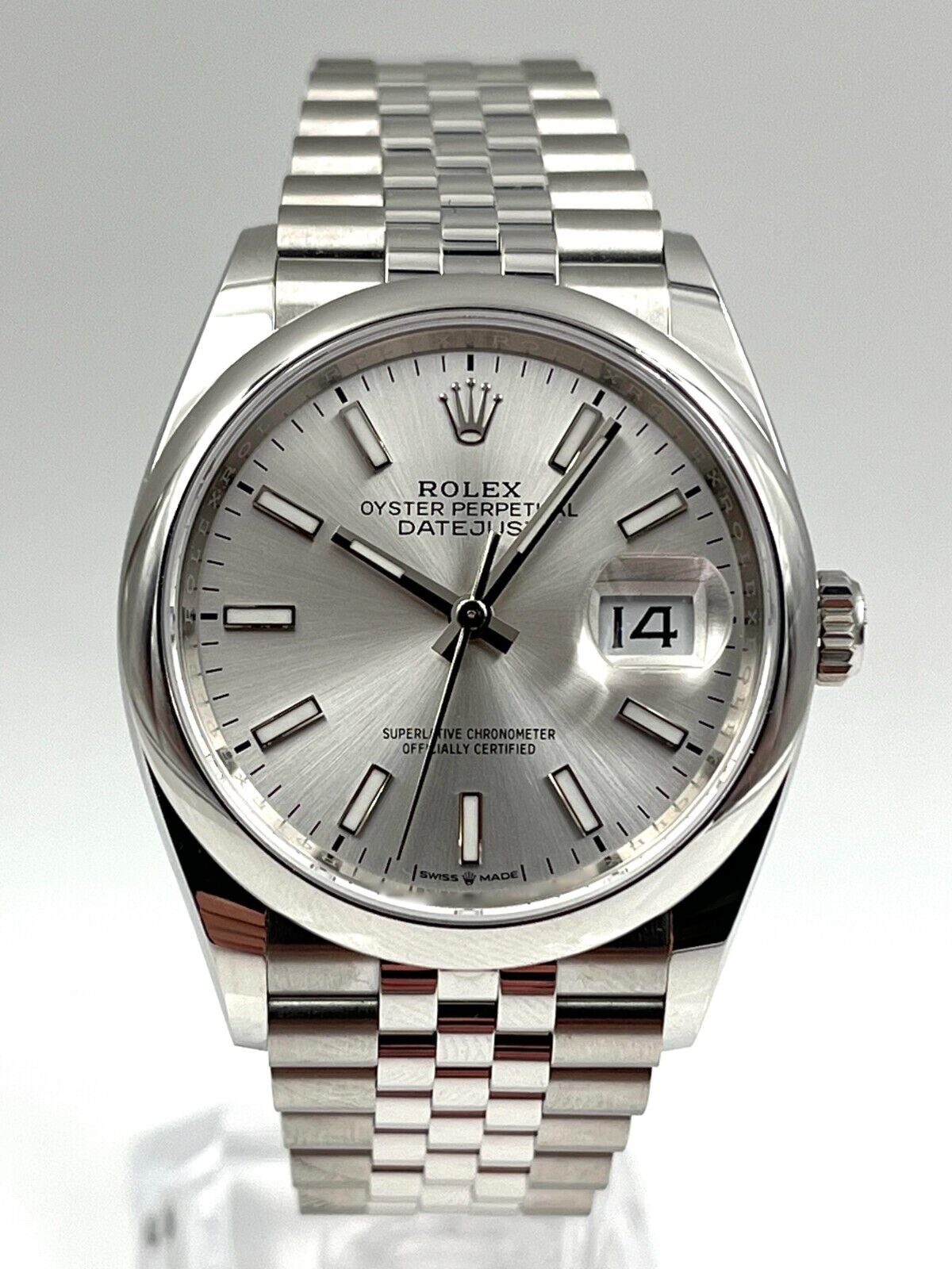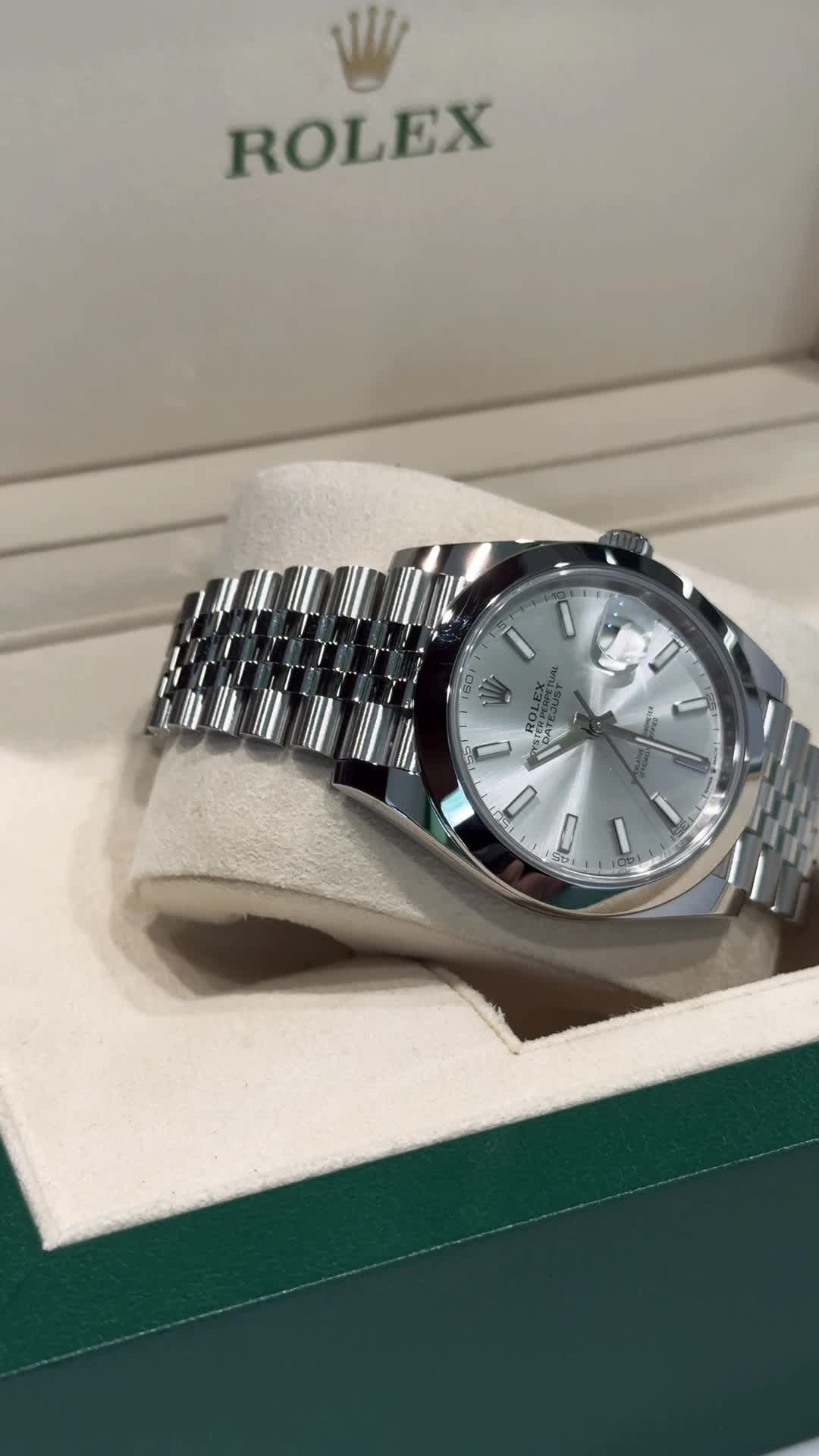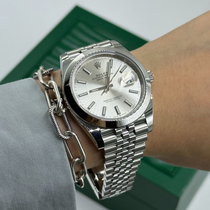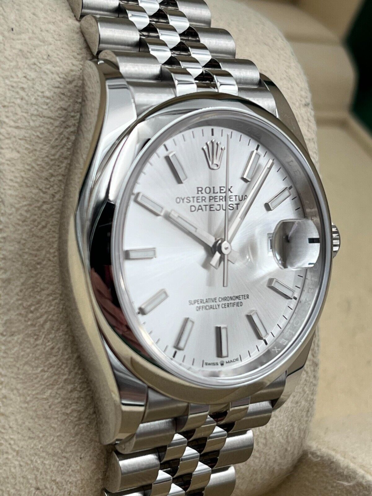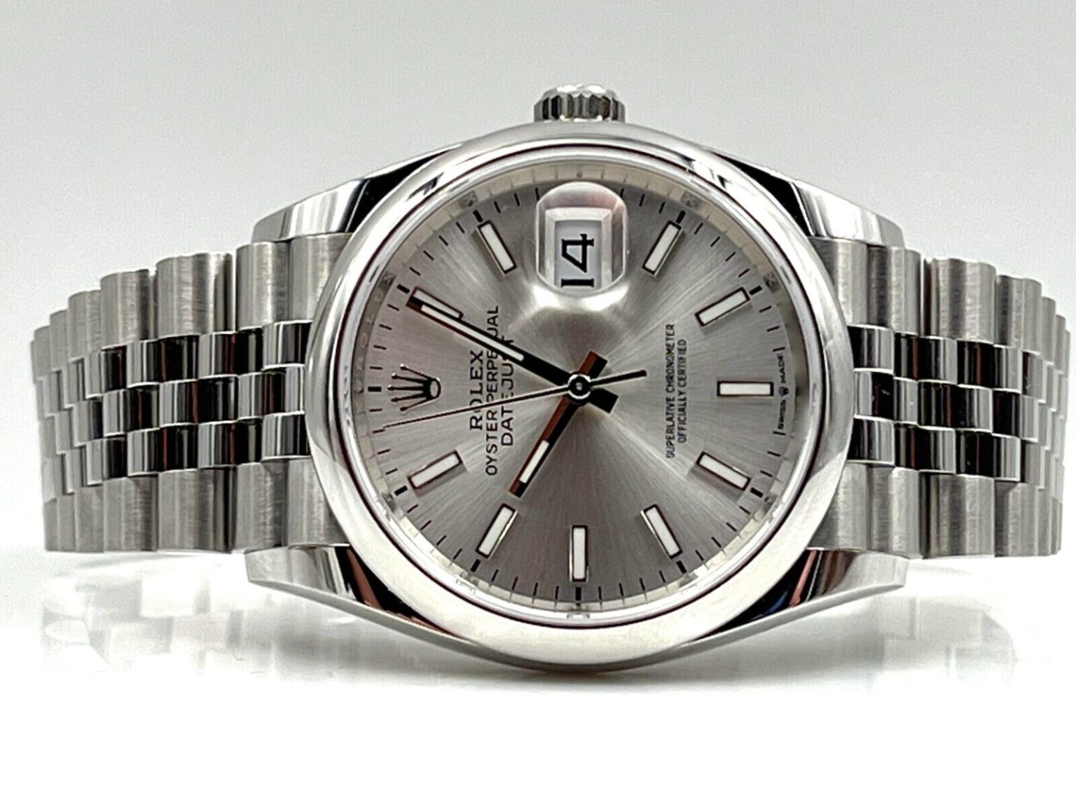 - Design: Silver dial with luminescent polished white gold hands and stick hour markers. Date displayed at 3 o'clock.