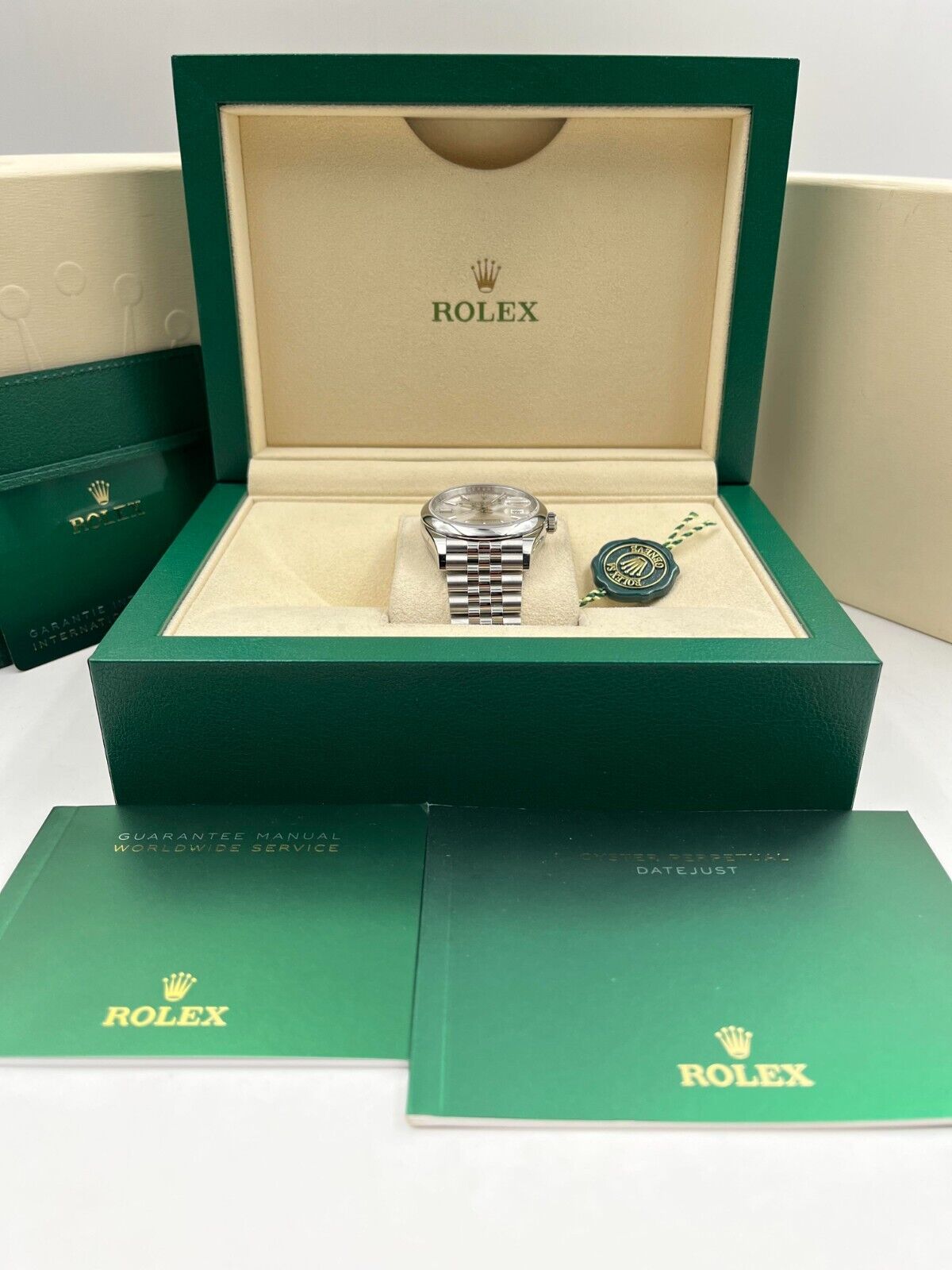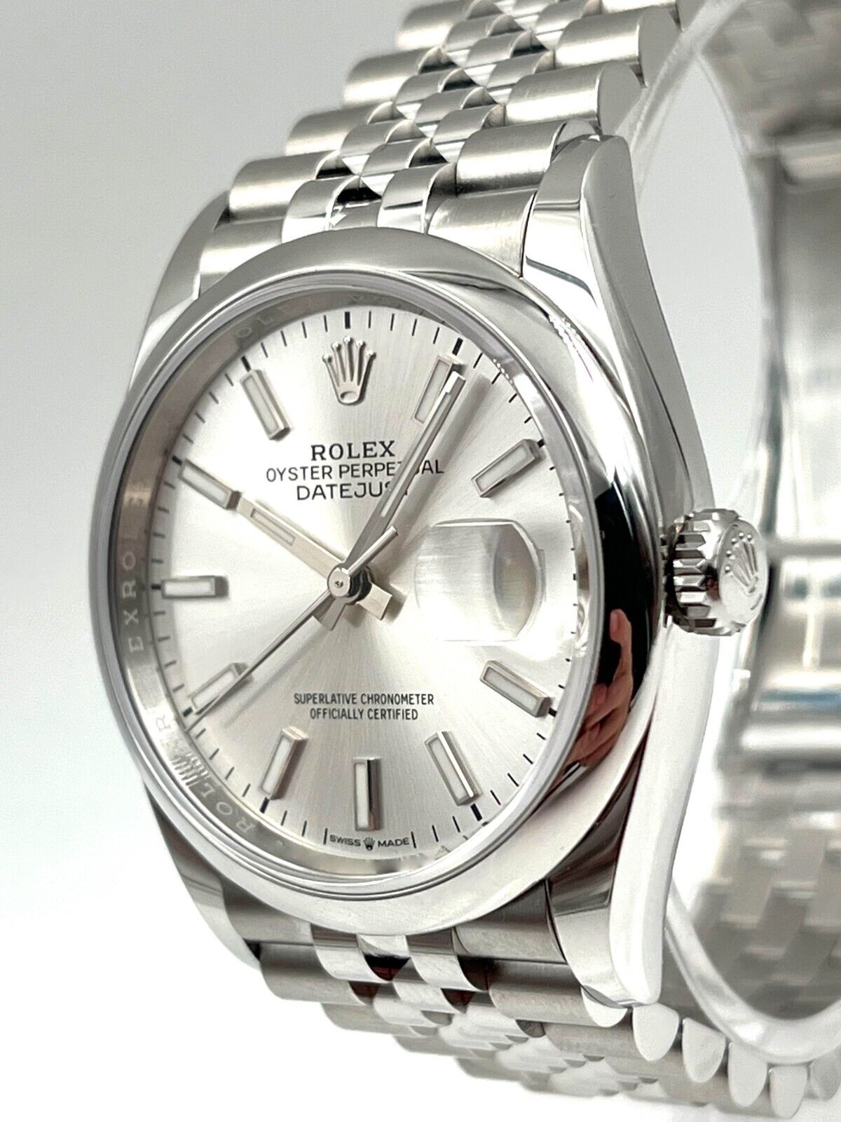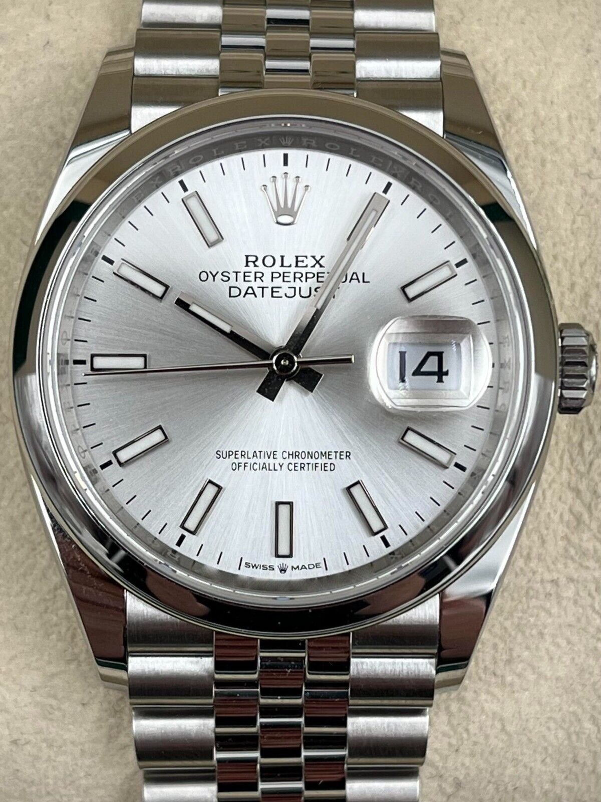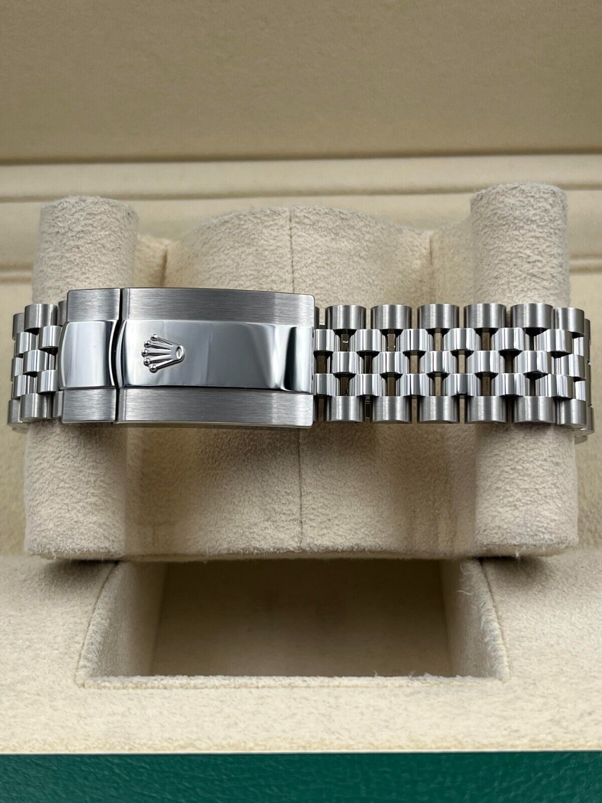 - Design: Silver dial with luminescent polished white gold hands and stick hour markers. Date displayed at 3 o'clock.