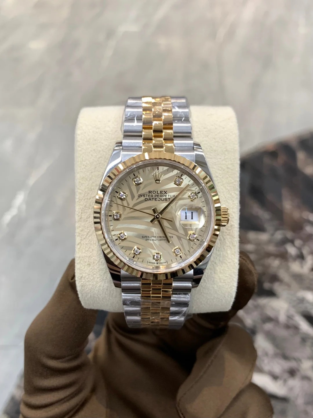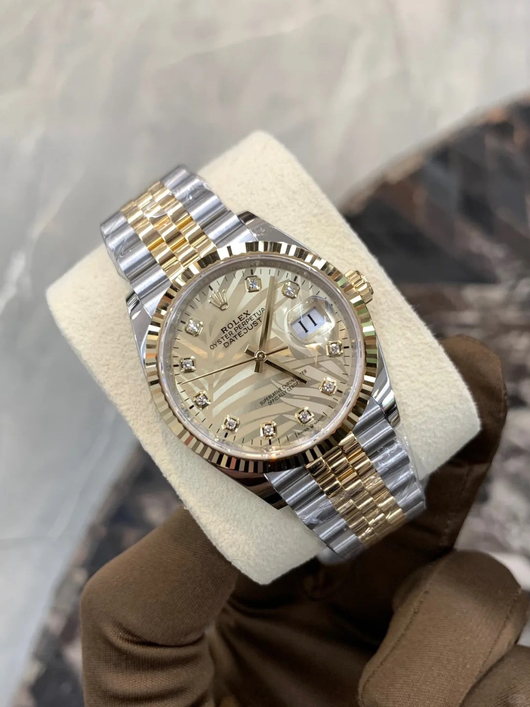 • Rolex Datejust 36 Steel & Yellow Gold Golden Palm-Motif Diamond Dial Women's Watch M126233-0043