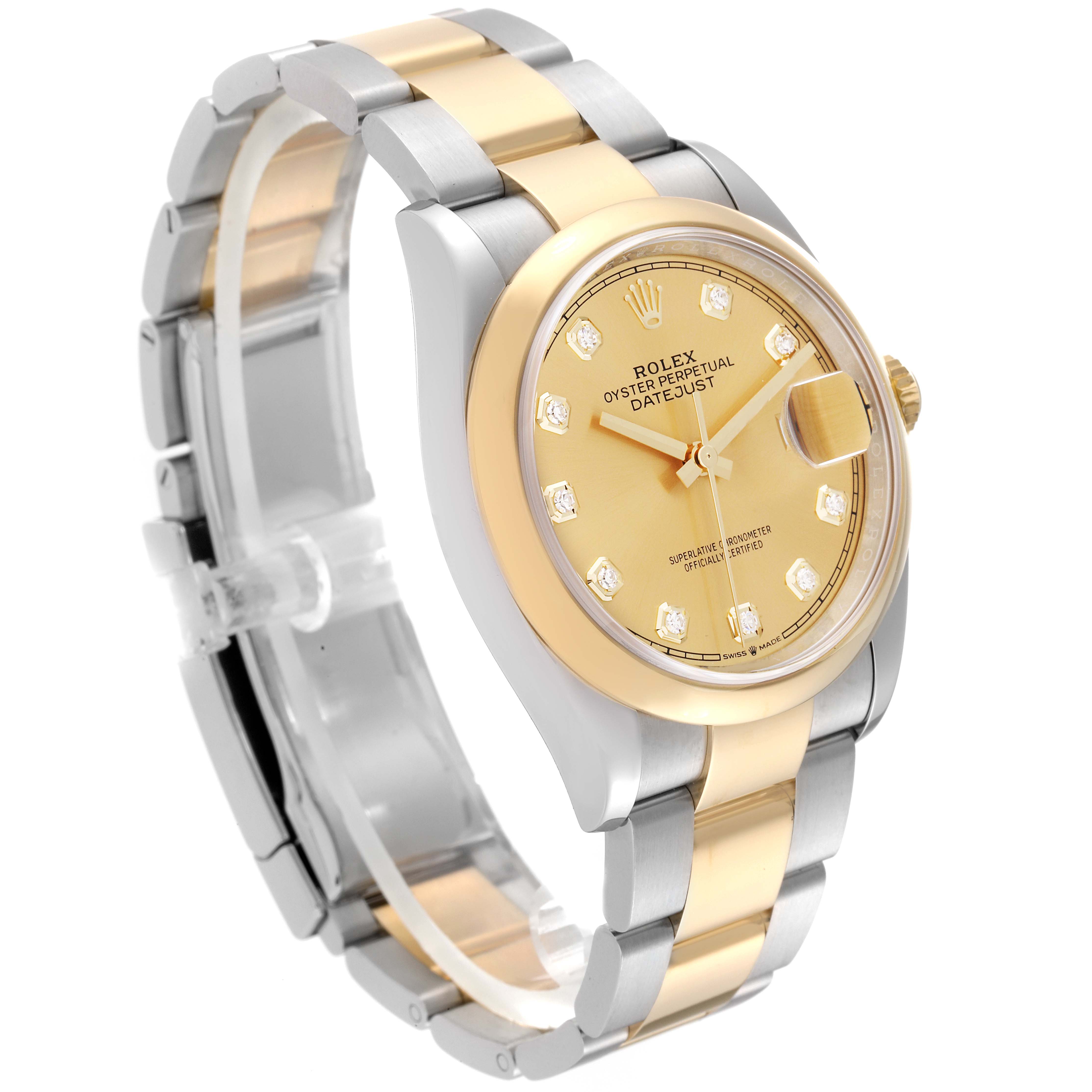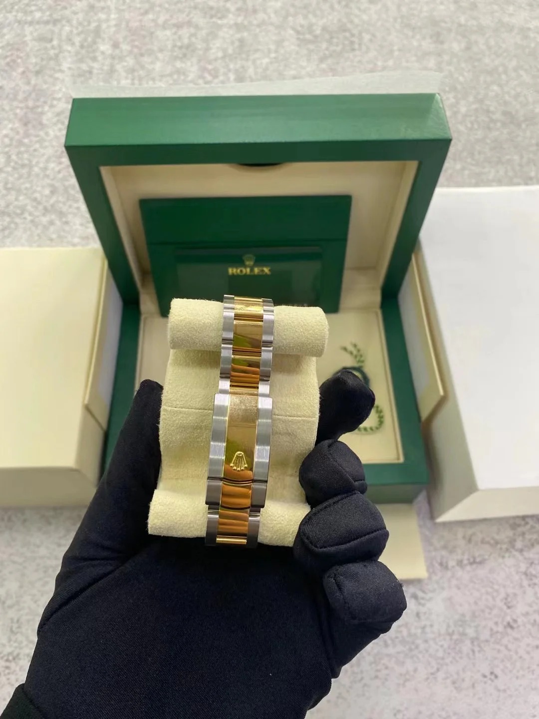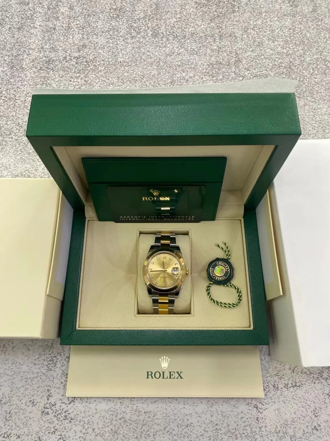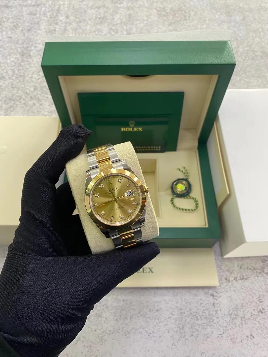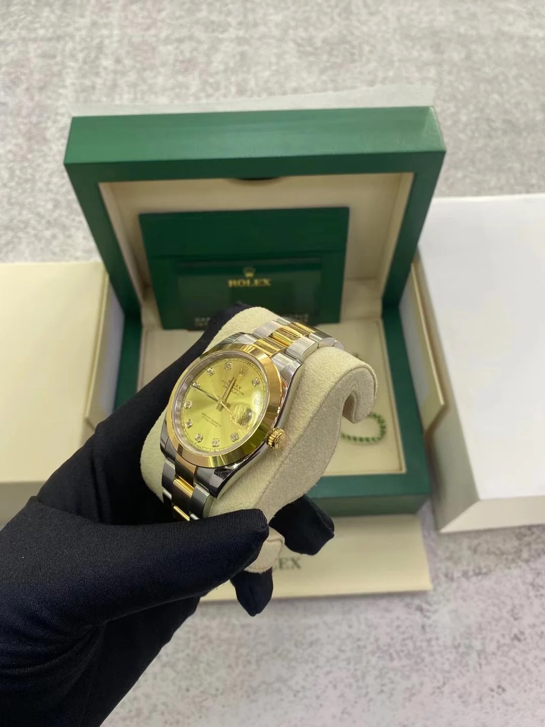 41mm Yellow Rolesor case with 904L steel monobloc middle case, screw-down steel back, 18K yellow gold screw-down crown, 18K yellow gold smooth bezel, scratch-resistant double anti-reflective sapphire crystal with cyclops lens over the date, champagne dial, diamond hour markers, Rolex calibre 3235 perpetual self-winding movement with date at 3 o'clock that changes instantaneously at midnight in a few thousandths of a second, approximately 70 hours of power reserve, yellow Rolesor Oyster bracelet made from a combination of 904L steel and 18K yellow gold with three-piece links, folding Oysterclasp buckle with Easylink 5mm comfort extension link. Waterproof to 100 meters.