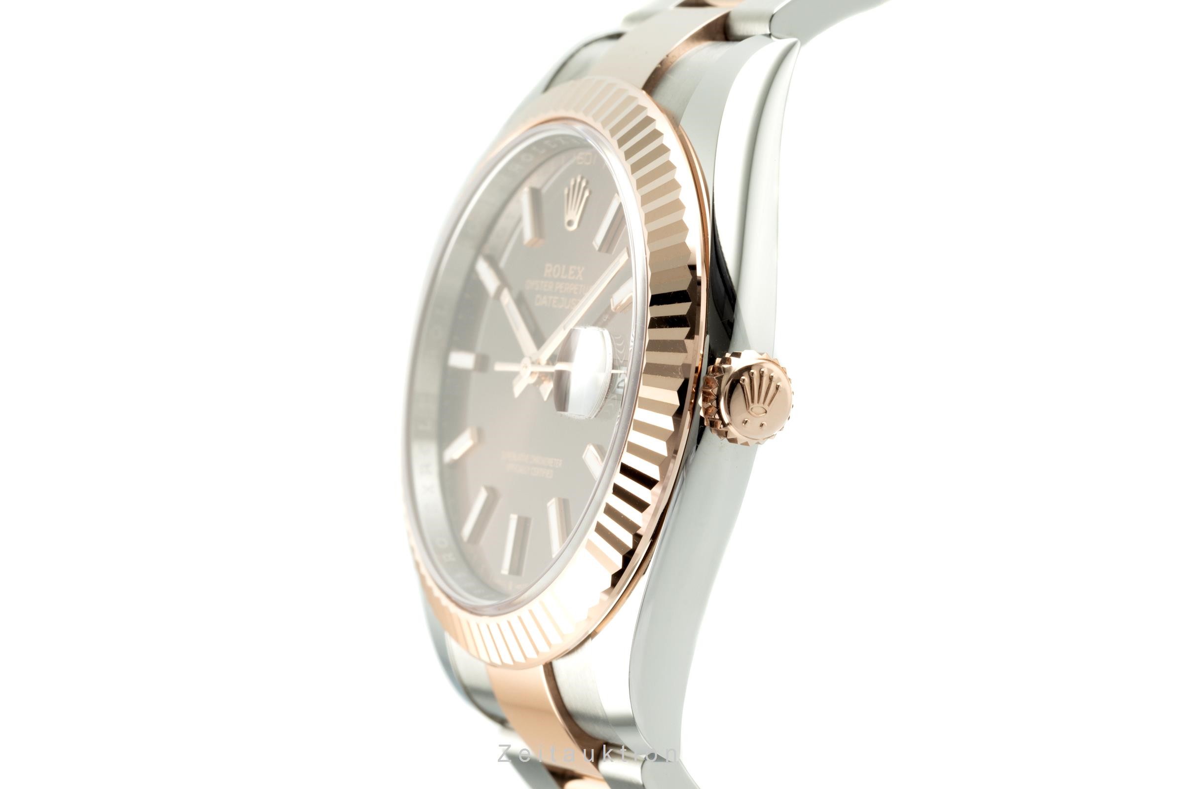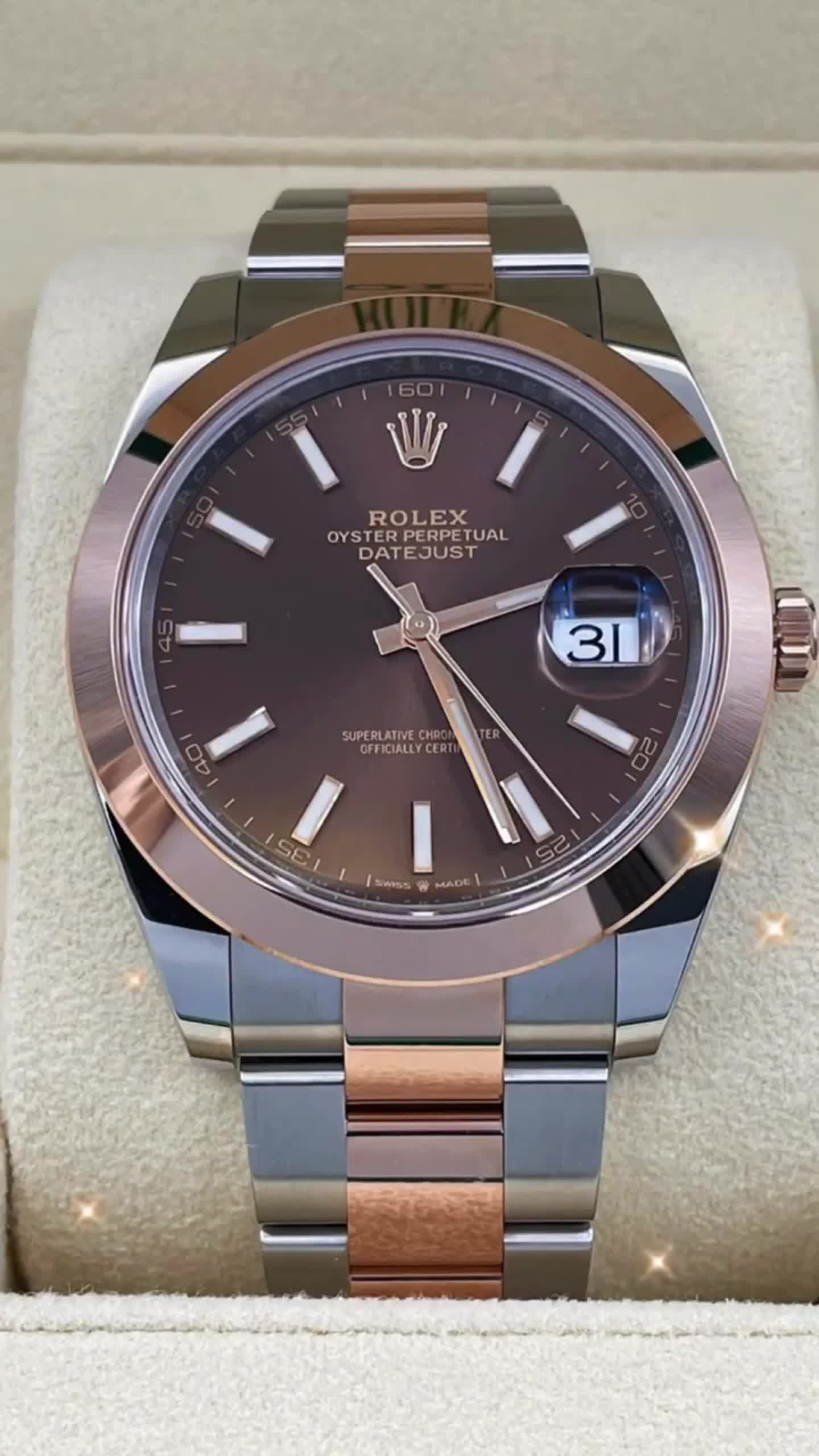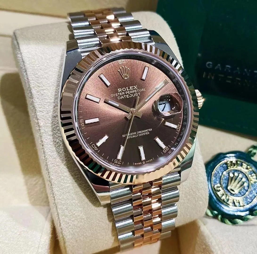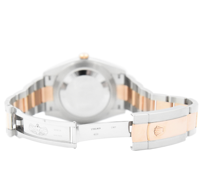 41mm Everose Rolesor case with 904L steel monobloc middle case, screw-down steel back, 18K Everose gold screw-down crown, 18K Everose gold fluted bezel, scratch-resistant double anti-reflective sapphire crystal with cyclops lens over the date, chocolate dial, index hour markers, Rolex caliber 3235 perpetual self-winding movement with date at 3 o'clock that changes instantaneously at midnight in a few thousandths of a second, approximately 70 hours of power reserve, Everose Rolesor Jubilee bracelet made from a combination of 904L steel and 18K Everose gold with five-piece links, folding Oysterclasp buckle with Easylink 5mm comfort extension link. Waterproof to 100 meters.