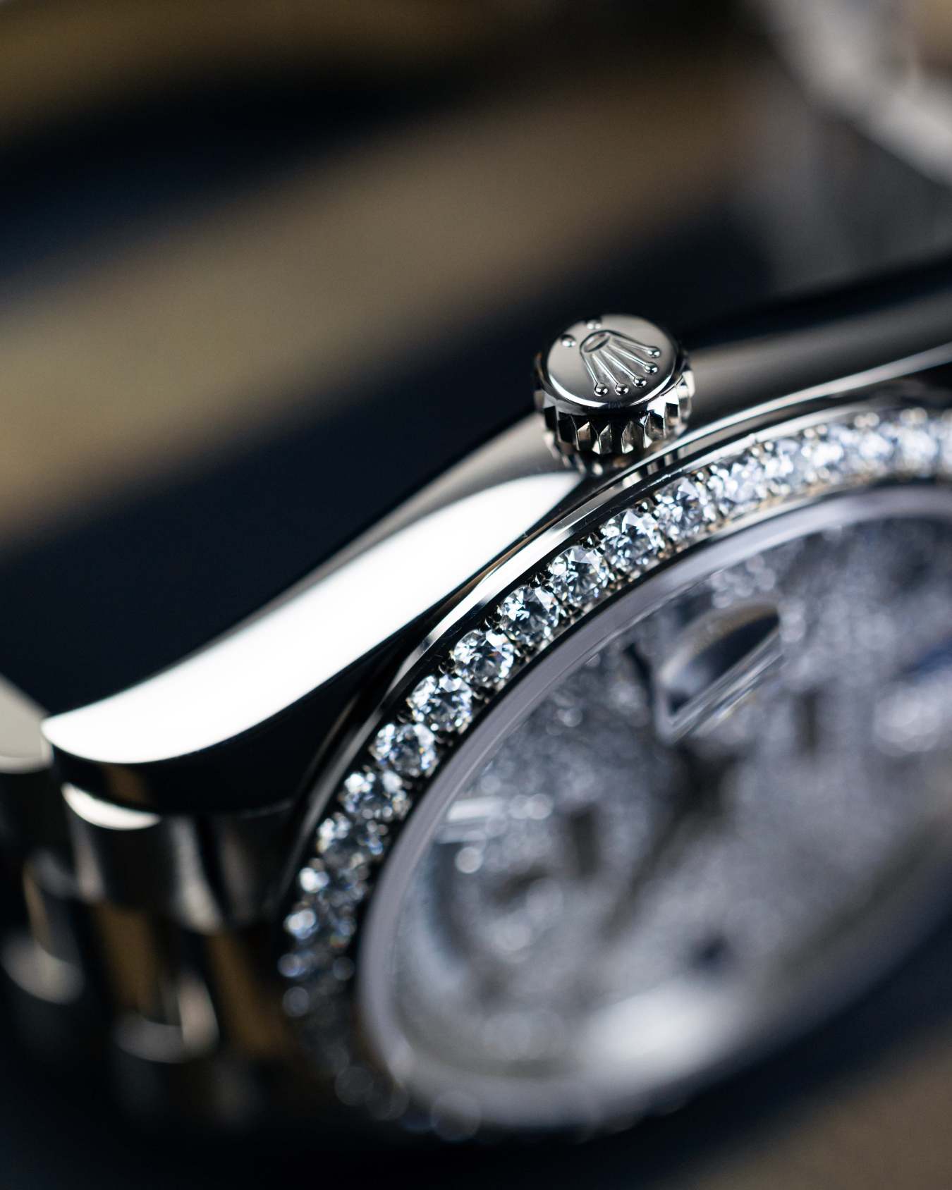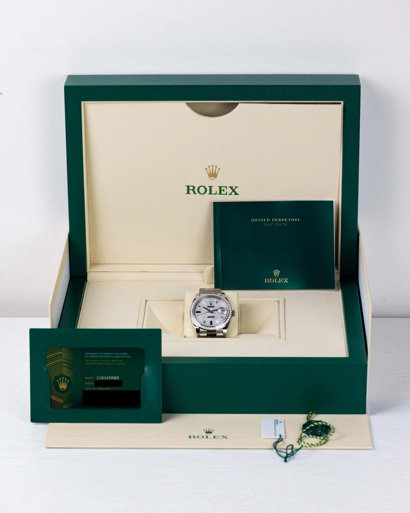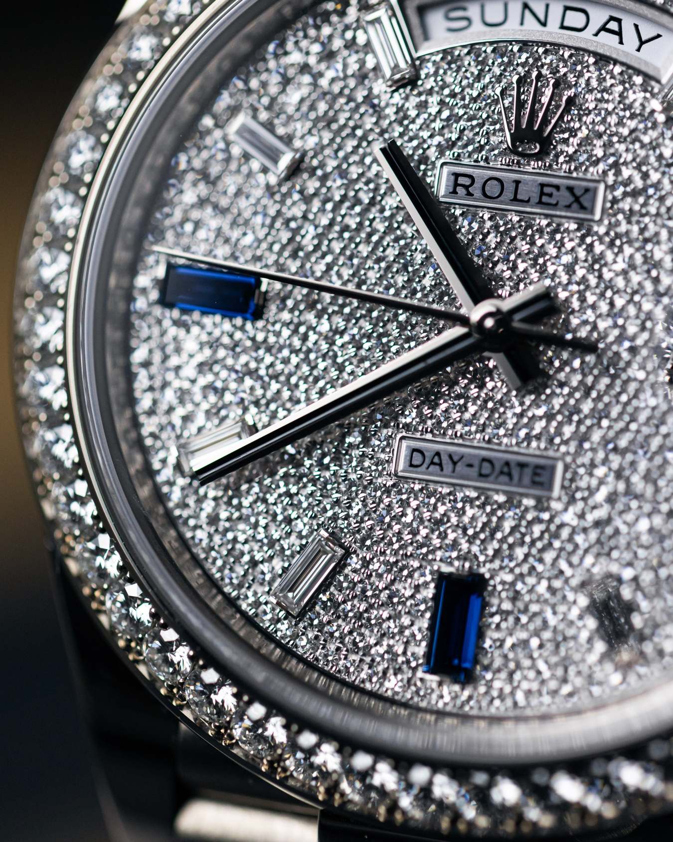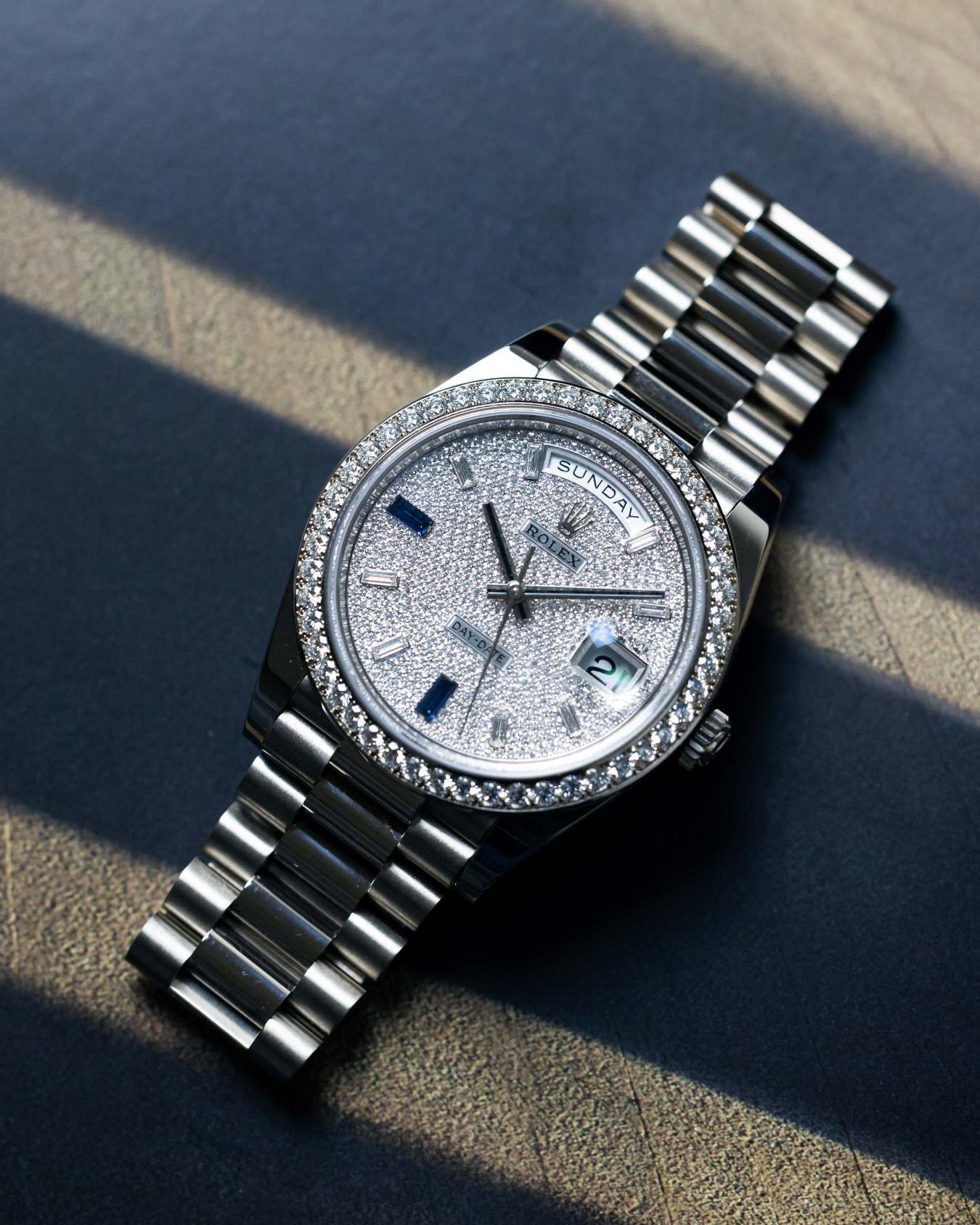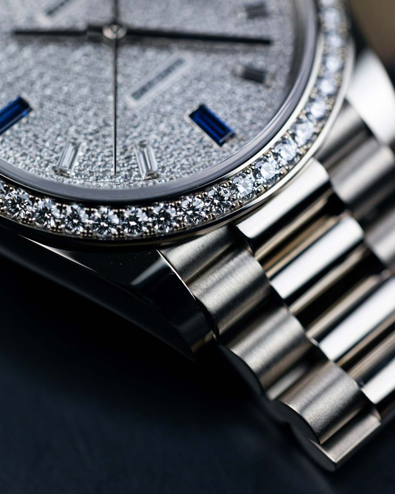 An exquisite watch that shows Rolex’s dedication in craftsmanship. Encased in 18k white gold, a factory-set diamond bezel, diamond-paved dial with hour makers of diamond and sapphires on the president bracelet.